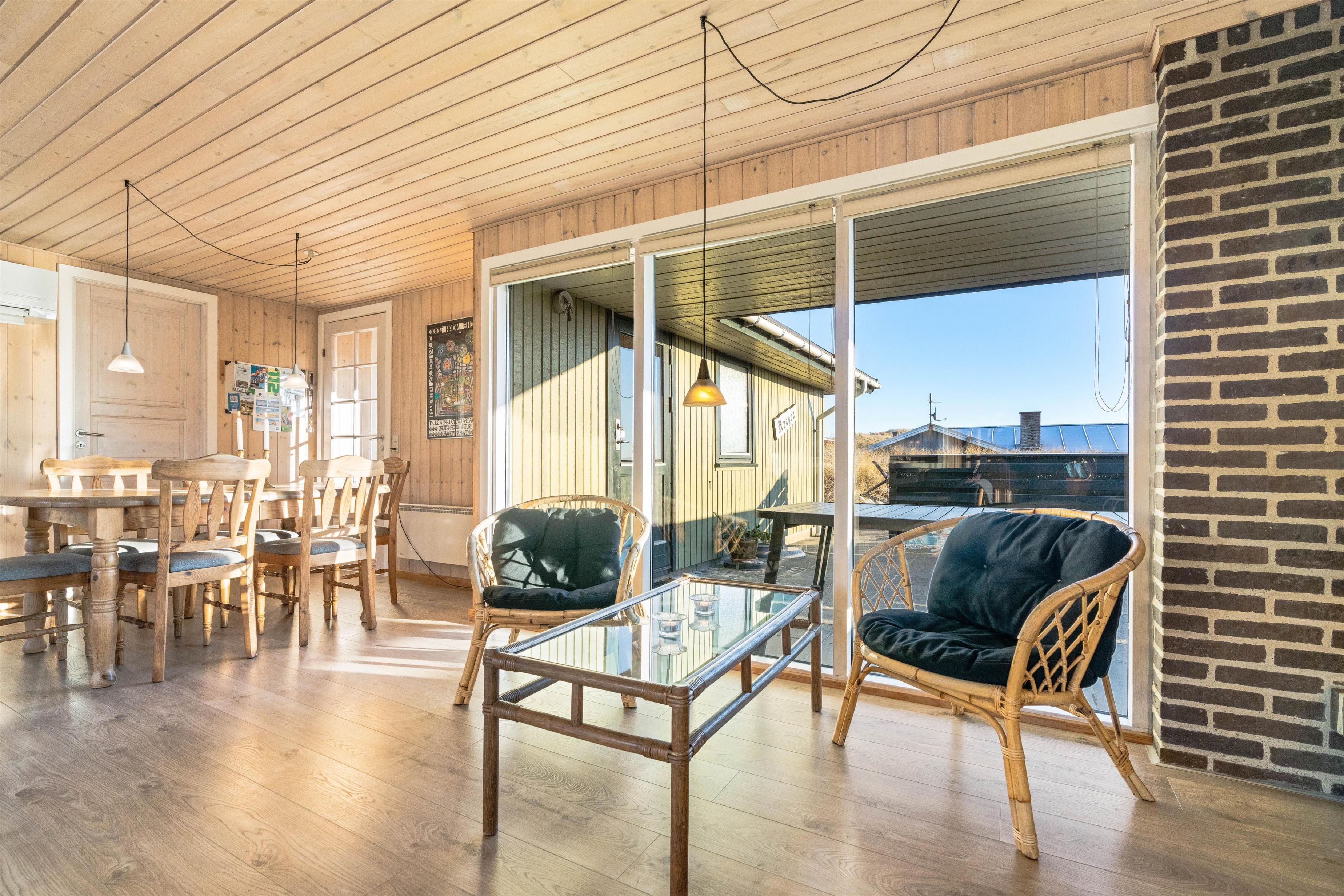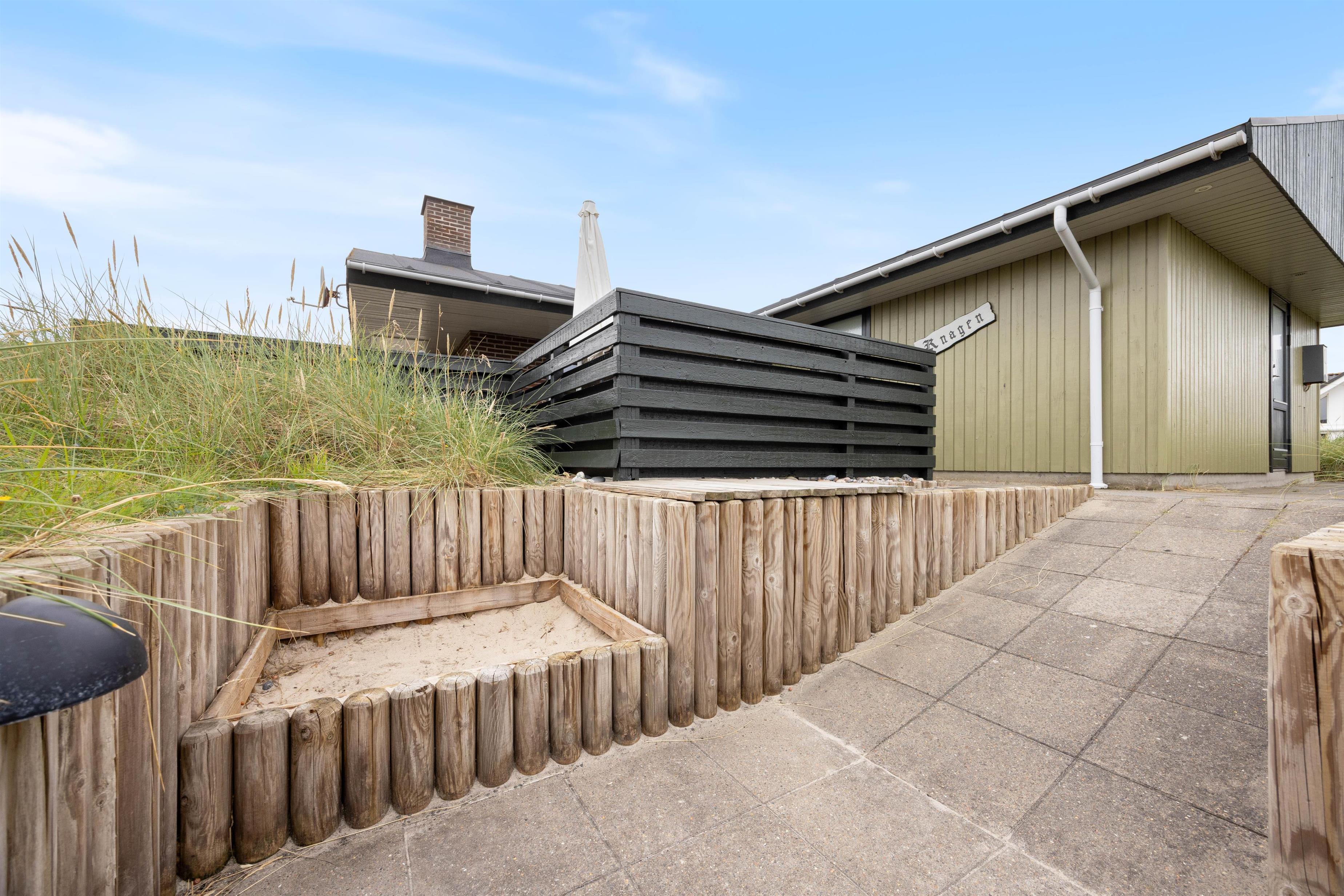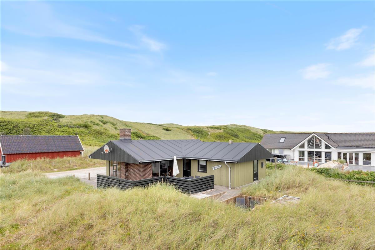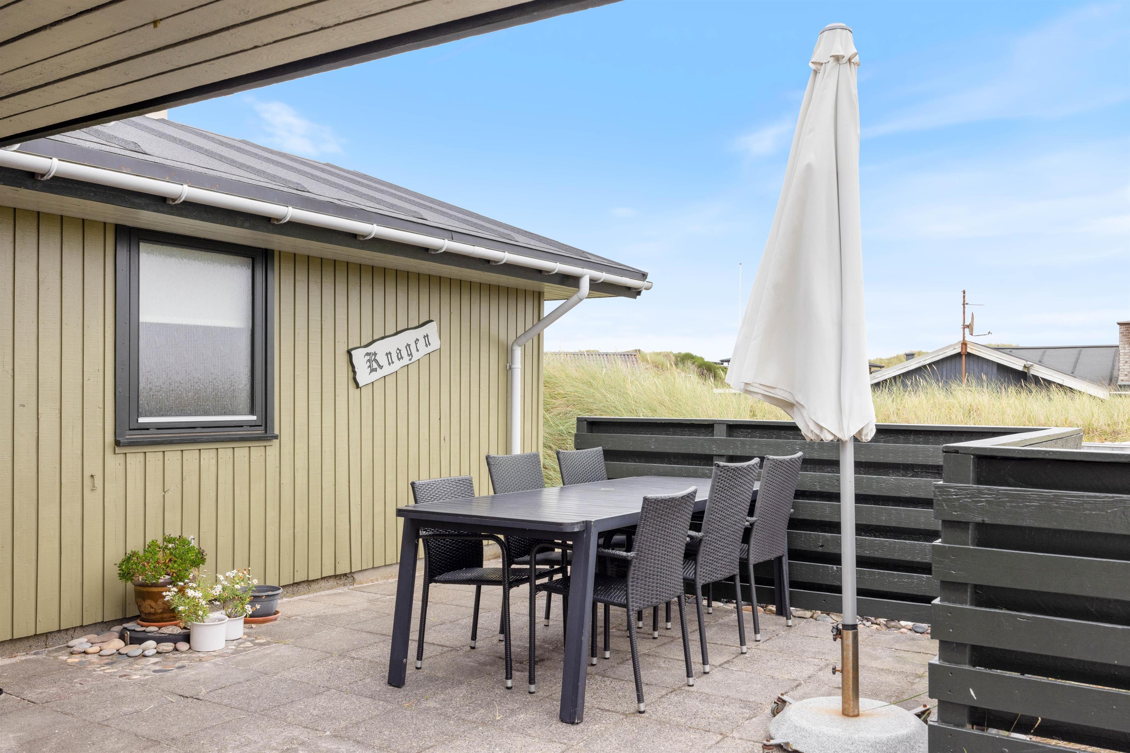 The terraces around the holiday home at Kirstinevej 110 offer relaxation opportunities in the fresh sea air. Depending on the weather, you can use either the sheltered terrace, which blends charmingly into the surrounding dunes, or the covered area connected to the house. You'll always have a choice between a protected corner or full sunshine, whatever suits you best.