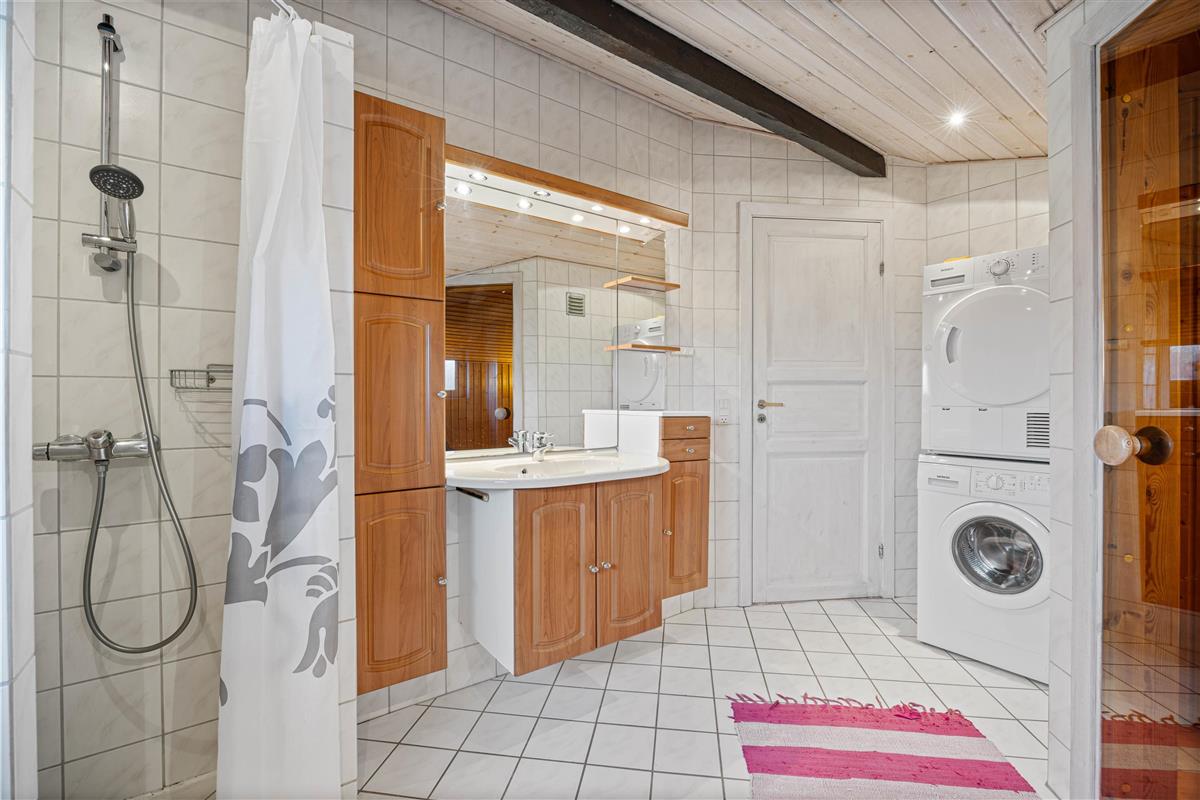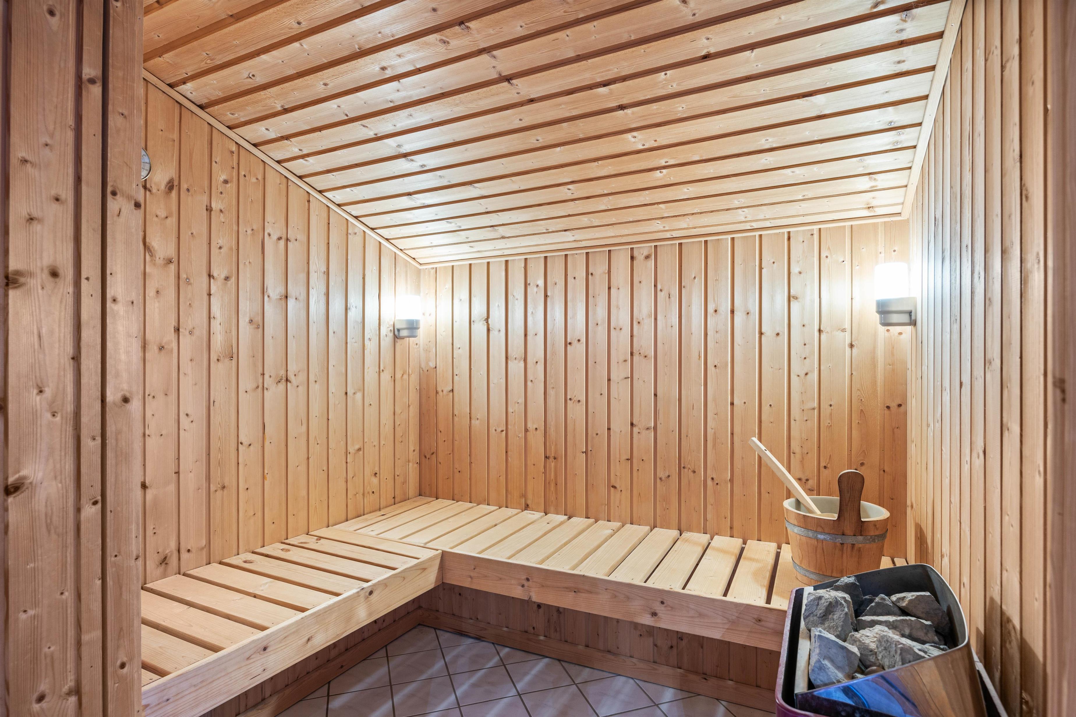 The spacious bathroom includes a whirlpool and sauna, perfect for relaxing and warming up after a long day outdoors. The holiday home also provides a cot and high chair.