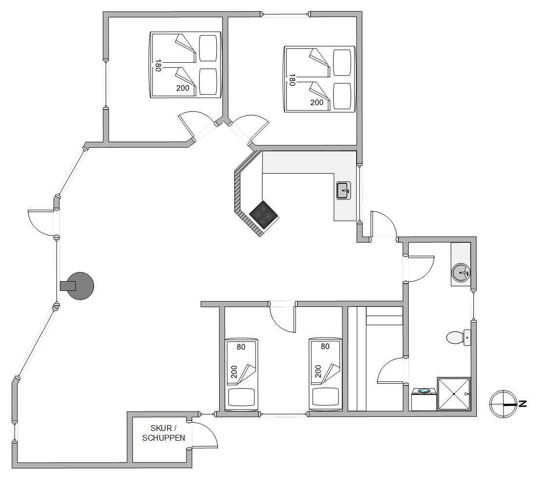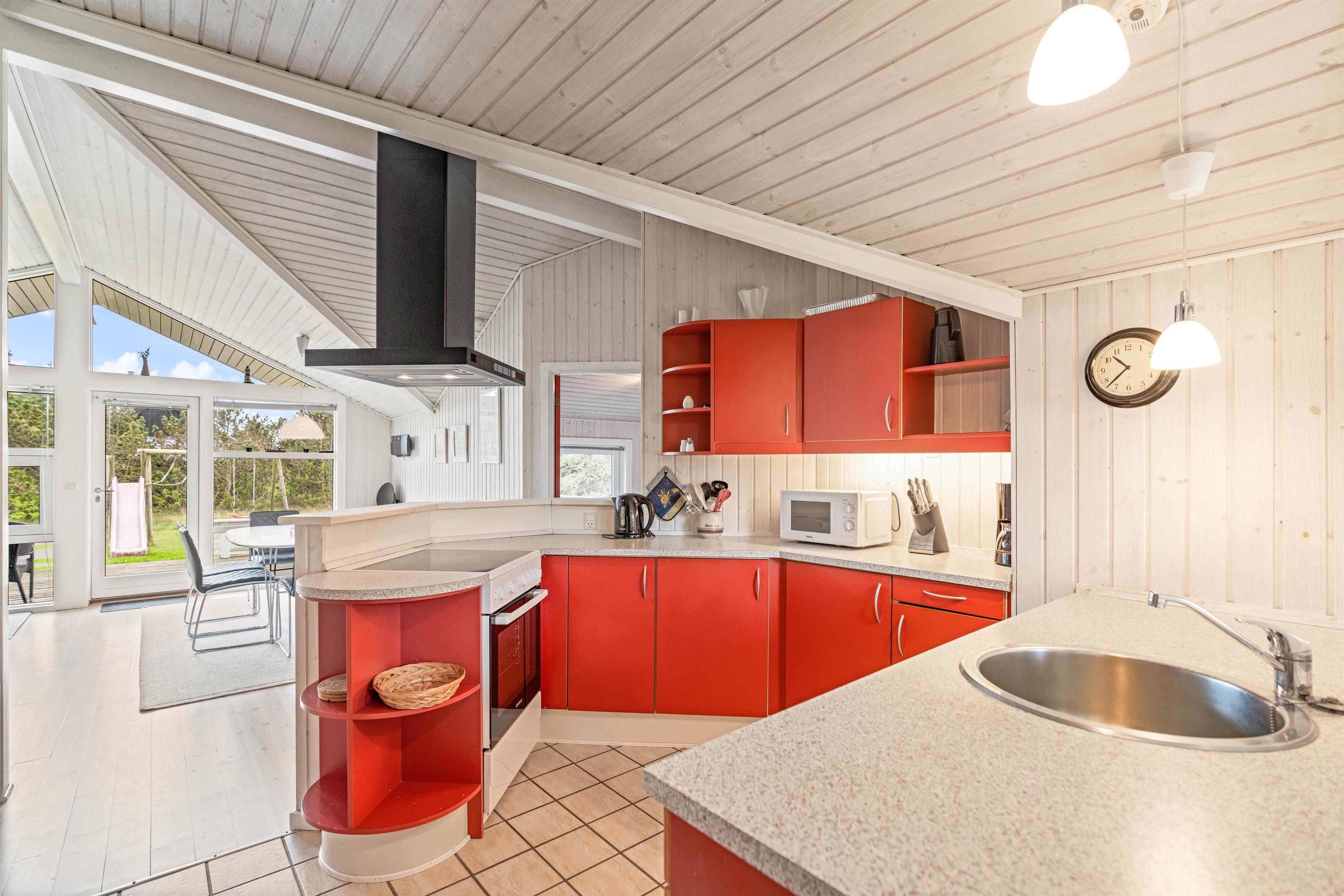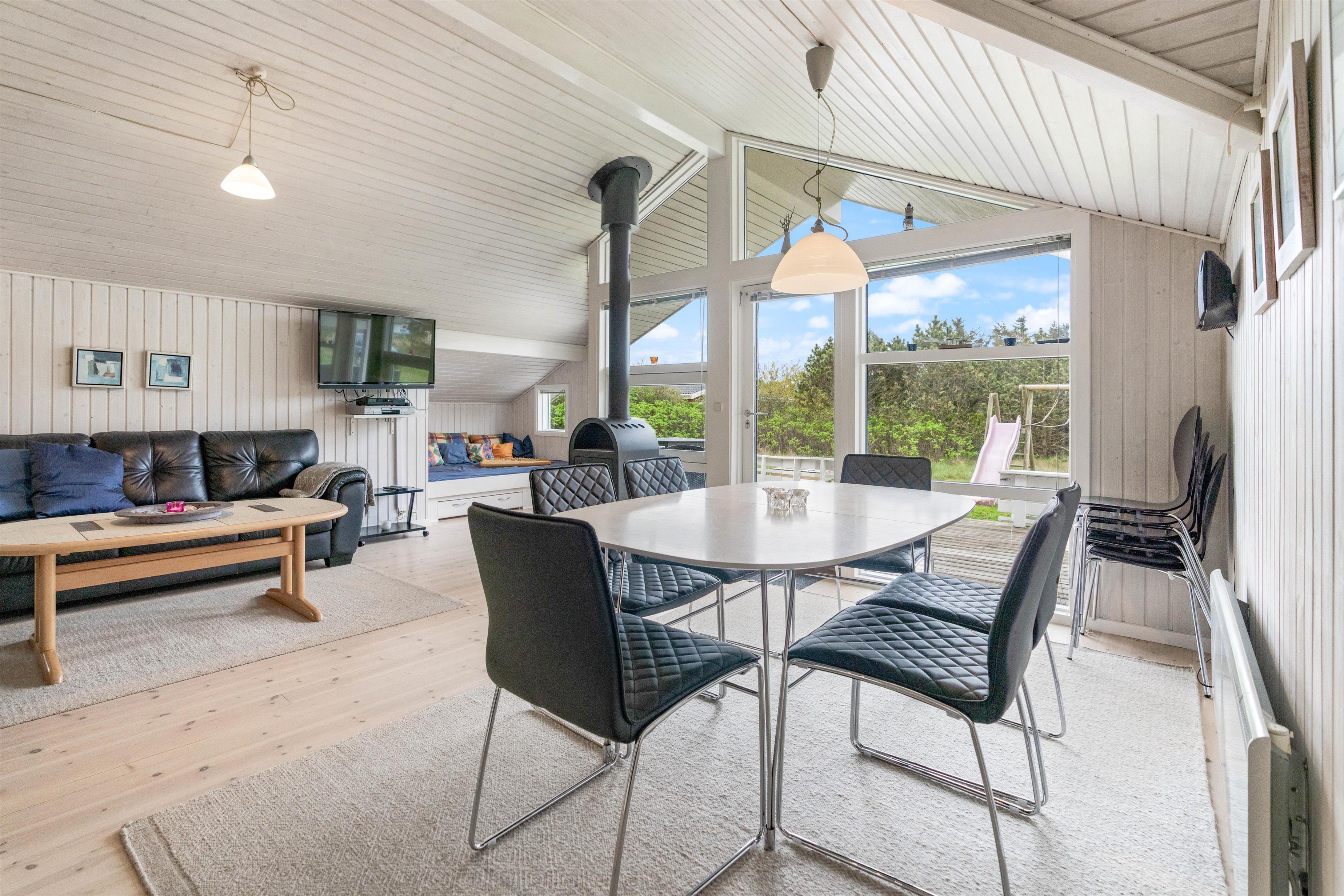 The heart of this typical Scandinavian holiday home is the spacious living area with open-plan kitchen. Make yourself comfortable on the sofa or in the cosy sleeping alcove while enjoying nature views through the large window front.