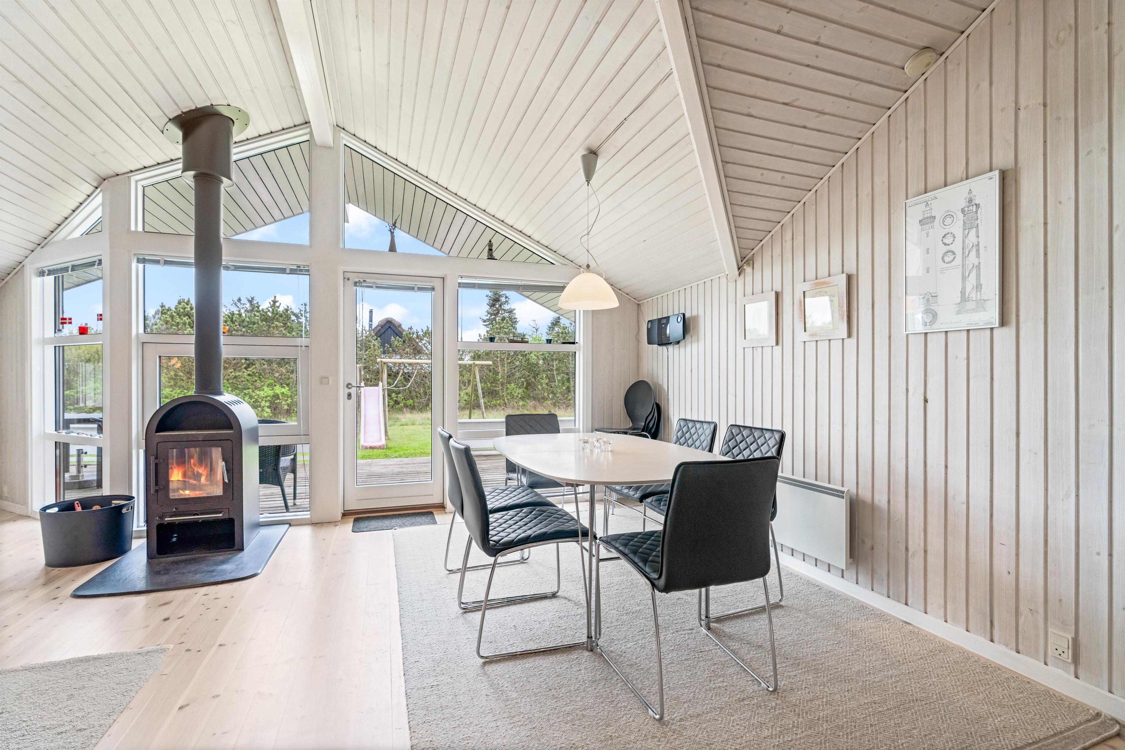 The wood-burning stove creates an especially cosy atmosphere in the evening. Additionally, an energy-efficient heat pump is available for heating. The modern kitchen is fully equipped with everything needed for preparing delicious meals, with an integrated dishwasher taking care of the cleaning up afterwards.