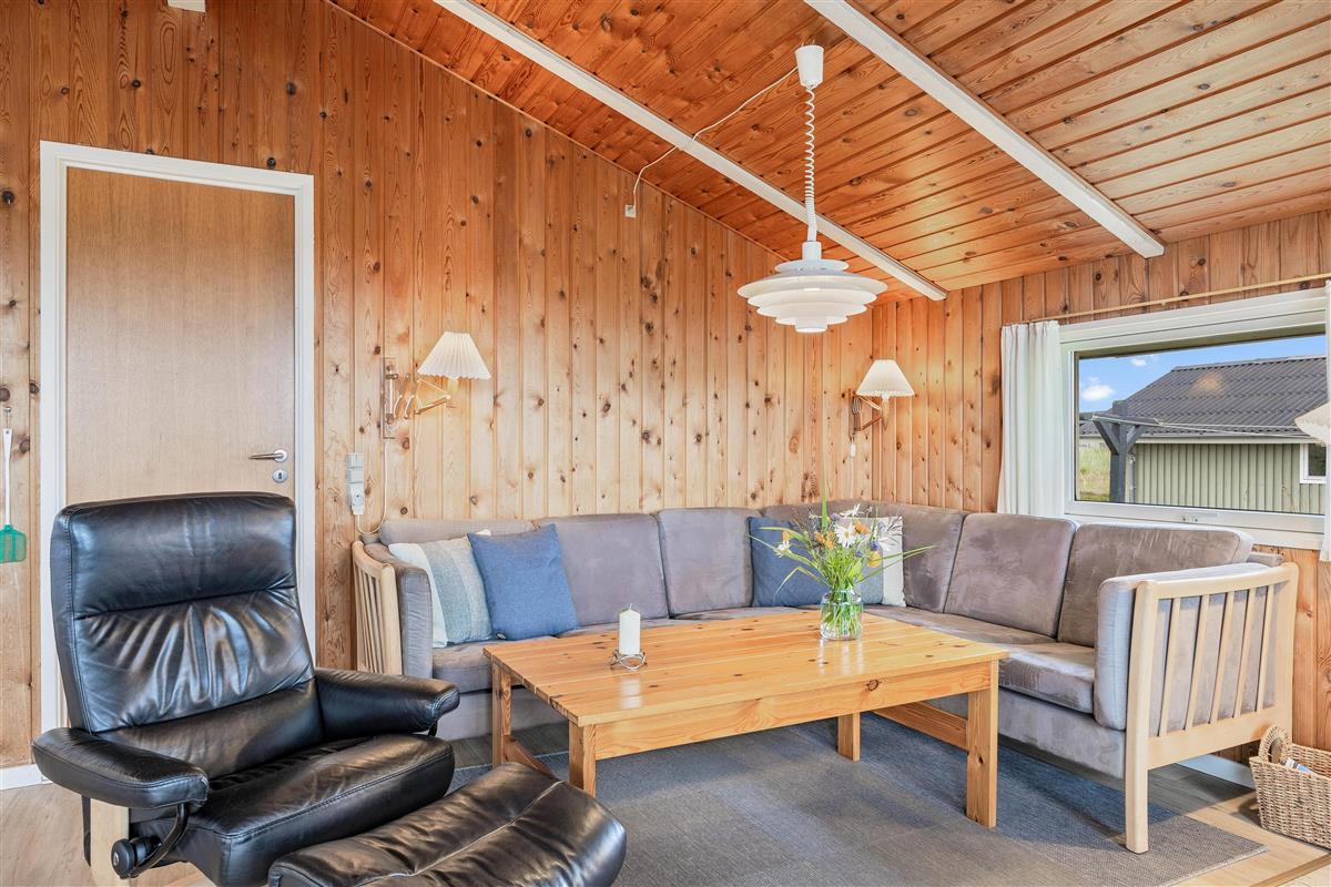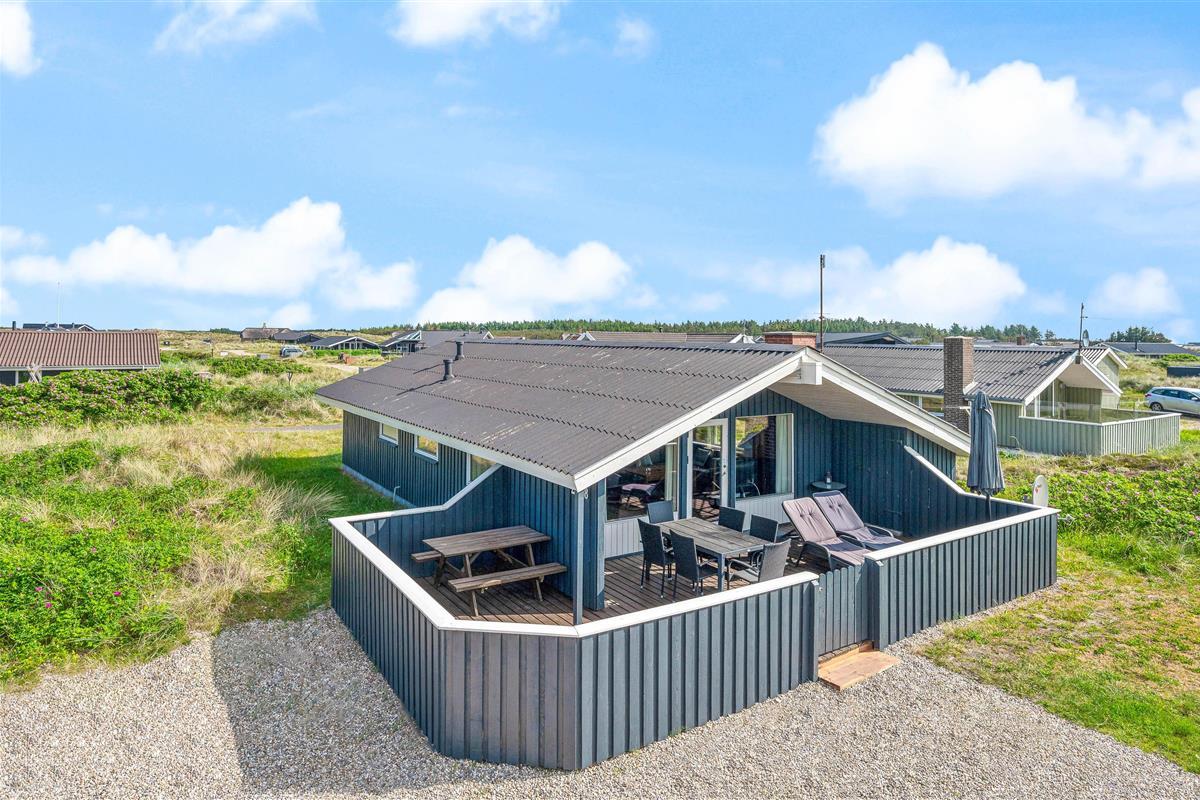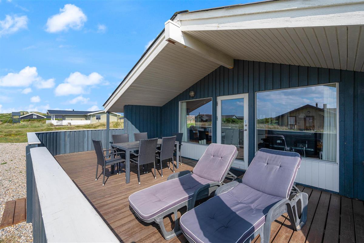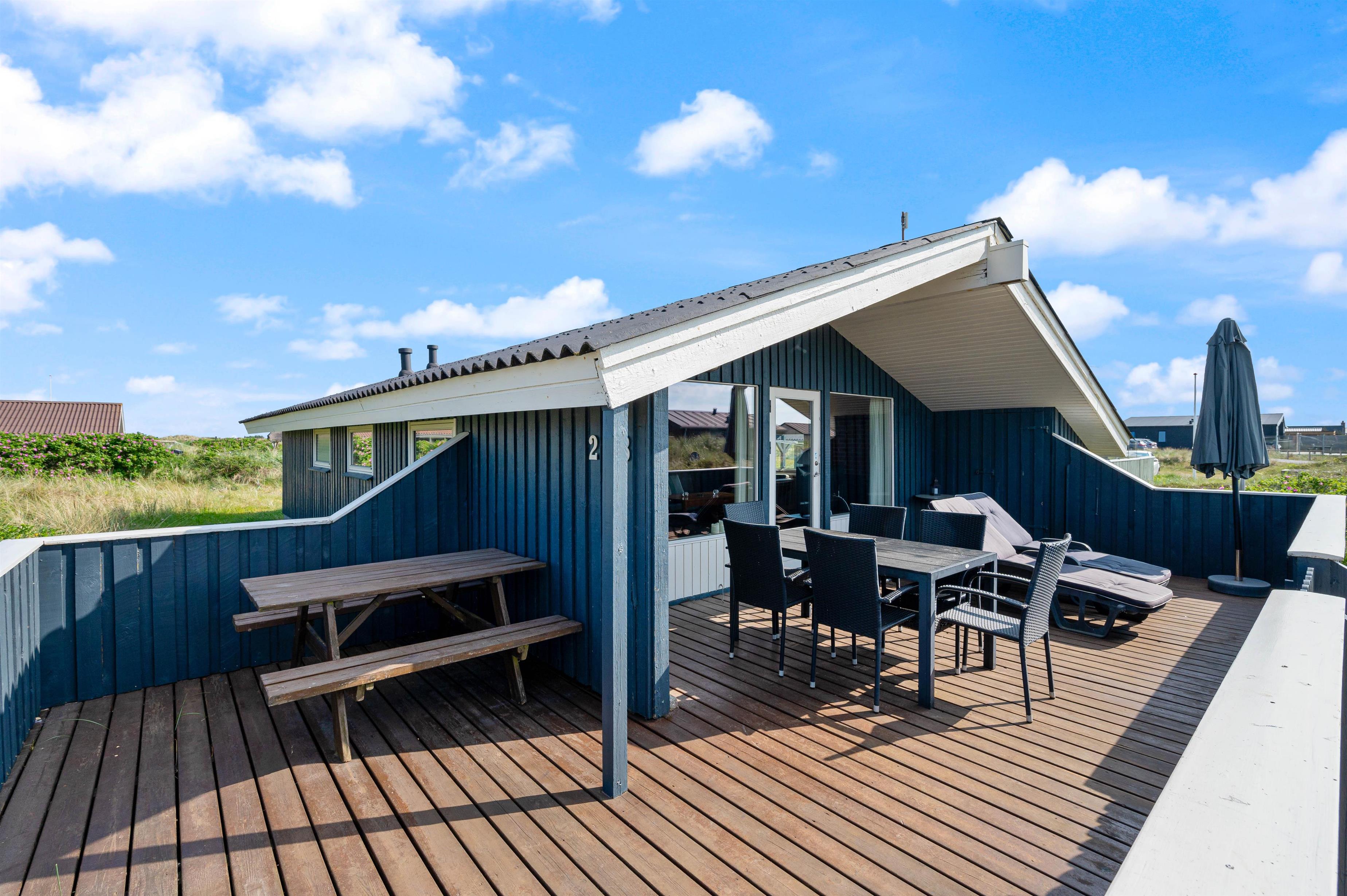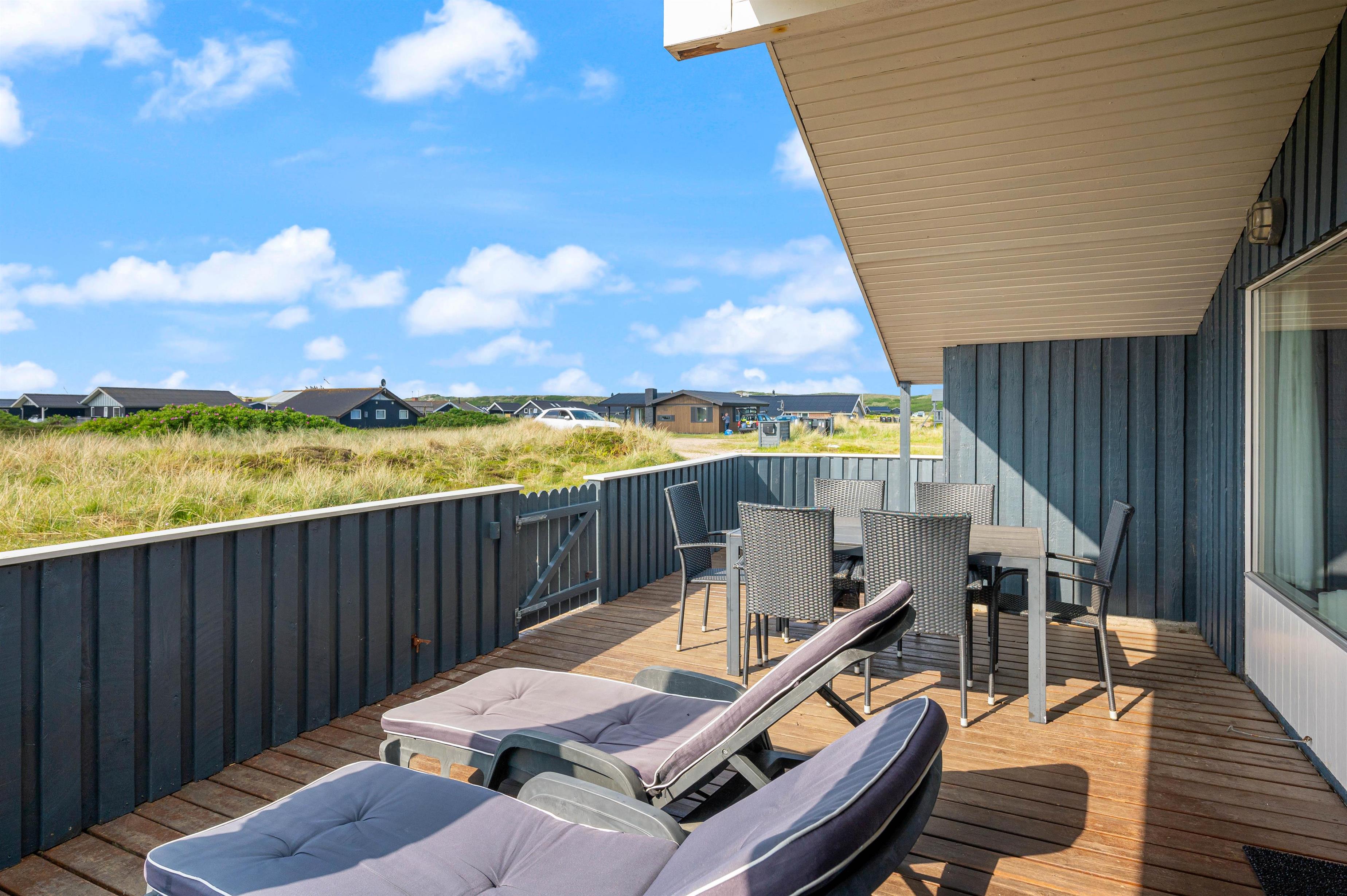 The delightful south-facing terrace of your holiday home is sheltered and partially covered. From here, you can hear the sound of the Danish West Coast sea, just 450 metres away, while enjoying the summer sunshine.