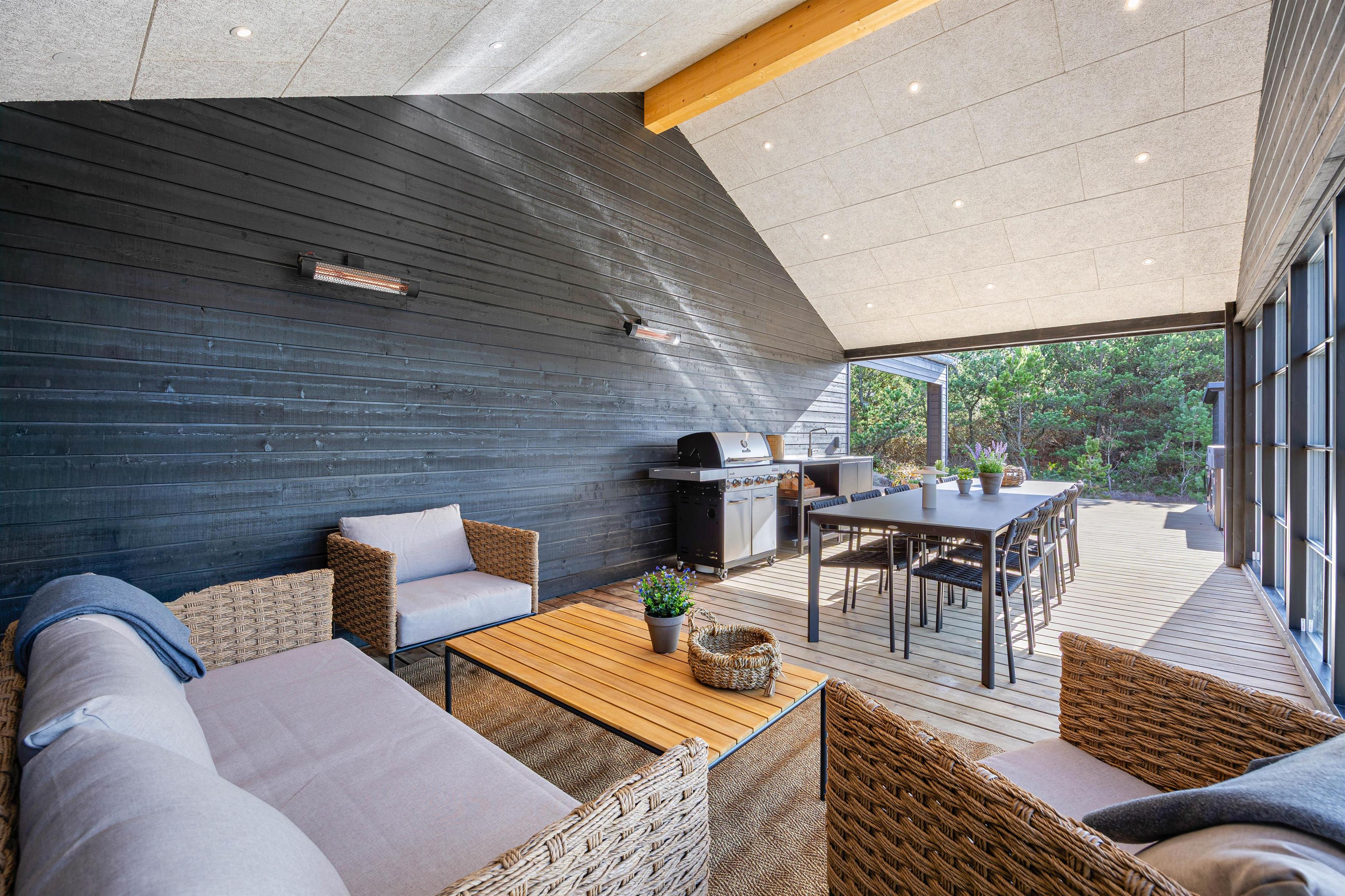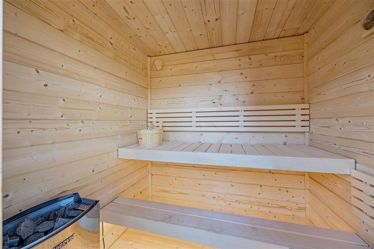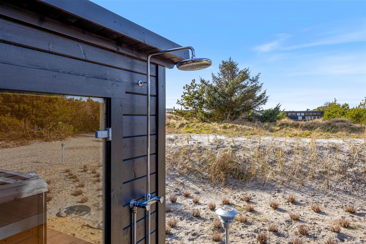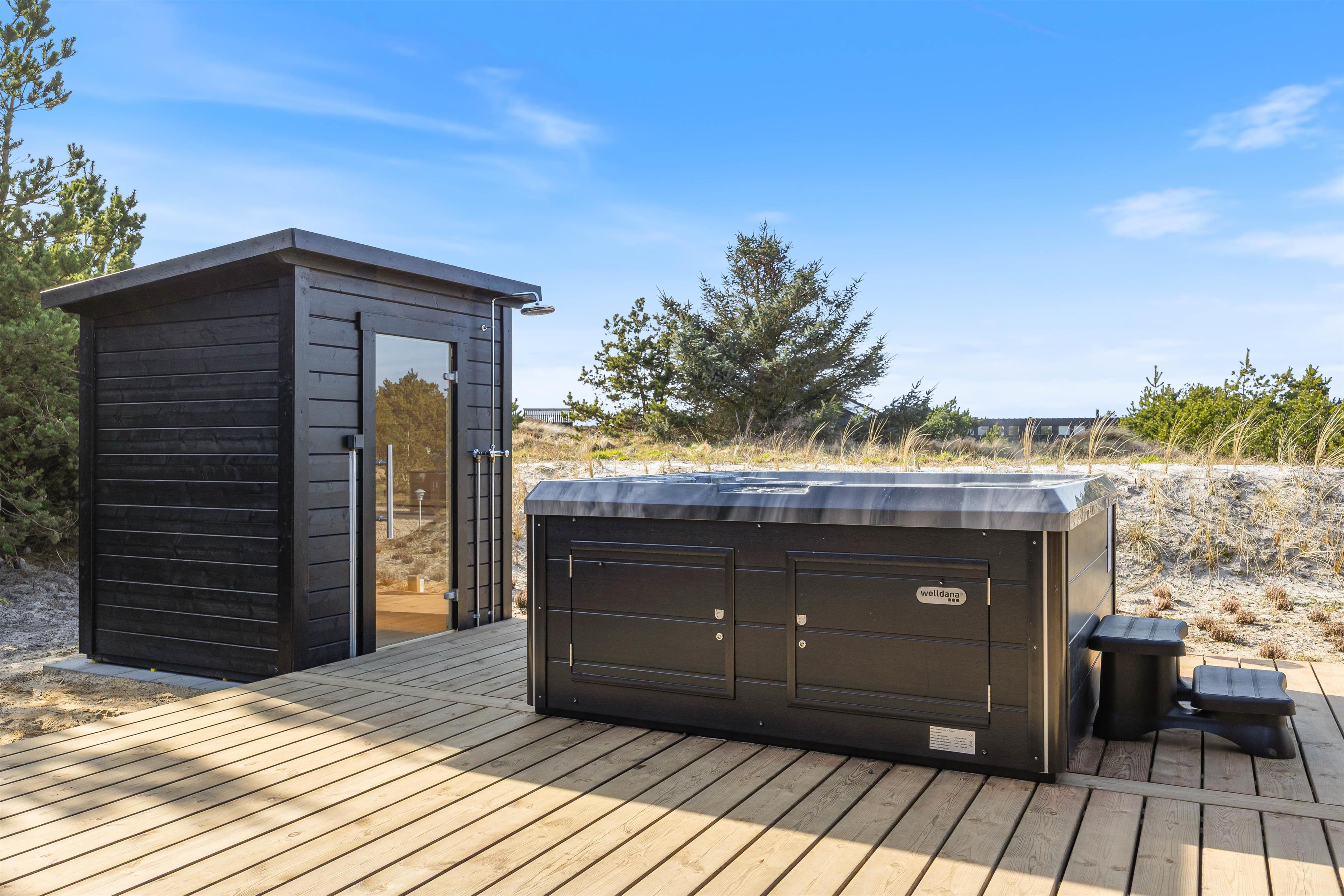 The terrace also features a private wellness area with an outdoor sauna and outdoor spa. Here, you can unwind in warm water or heat up in the sauna while watching the evening sky and stars. An outdoor shower (available from April to November) makes it easy to cool off or rinse away sand after a trip to the beach.