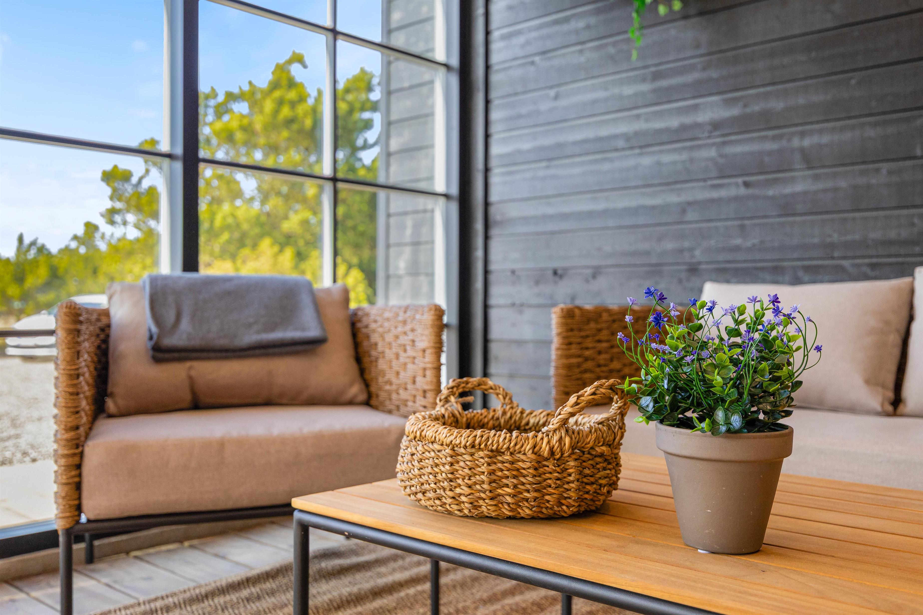 From the living area, you have direct access to the large wooden terrace, designed for relaxing outdoor living. Part of the terrace is covered, offering shelter and shade on warm or breezy days. Garden furniture, sun loungers, and a gas grill are ready for enjoyable outdoor meals and long summer evenings.