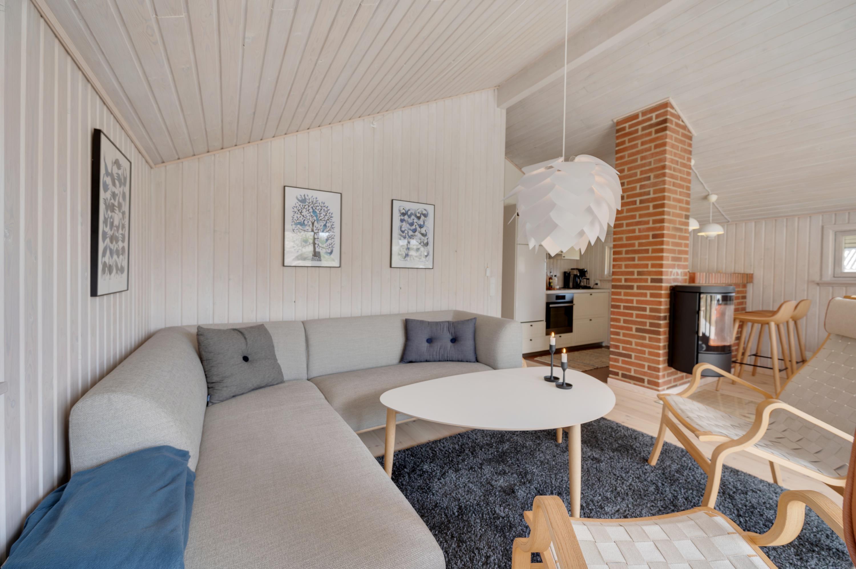 The spacious and bright living area forms the heart of the holiday home, combining a practical kitchen, adjacent dining area and seating corner. While preparing the children's favourite meals, they can play at the dining table. In the evening, everyone can settle into the seating area to watch a film or read the latest thriller while enjoying the crackling of the fire and its comfortable warmth.