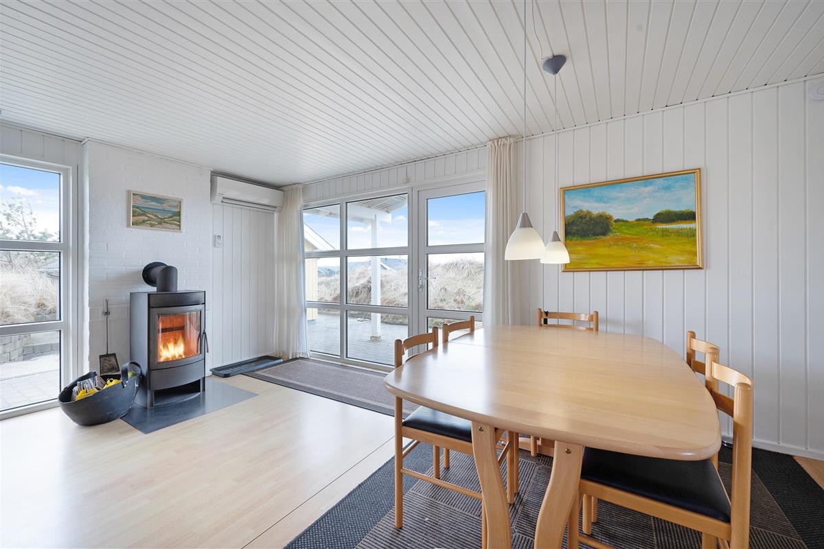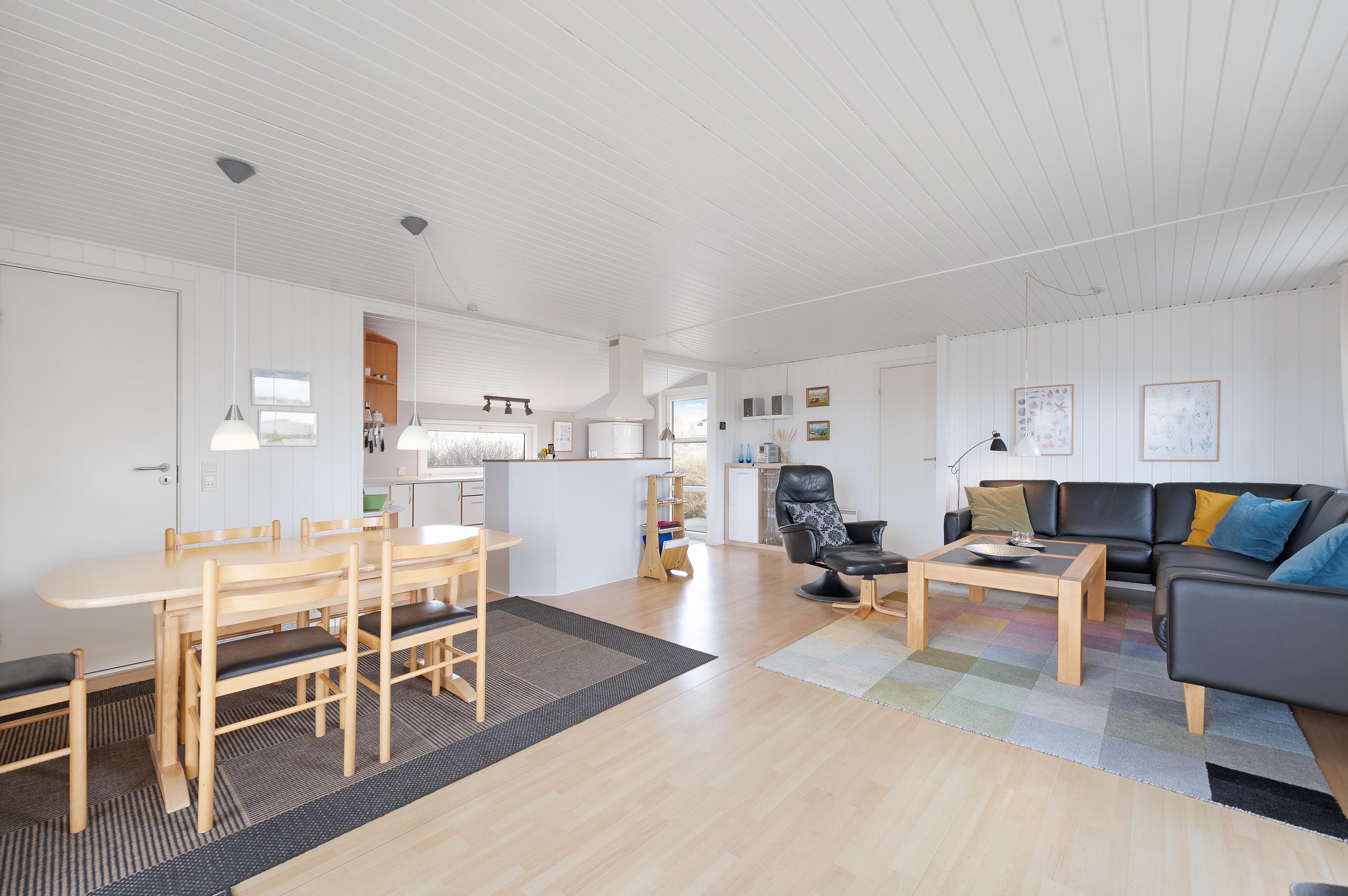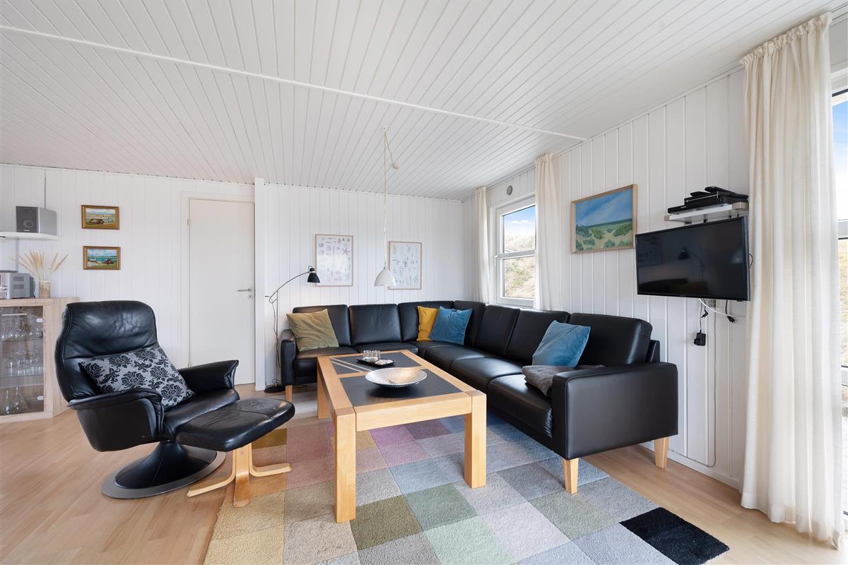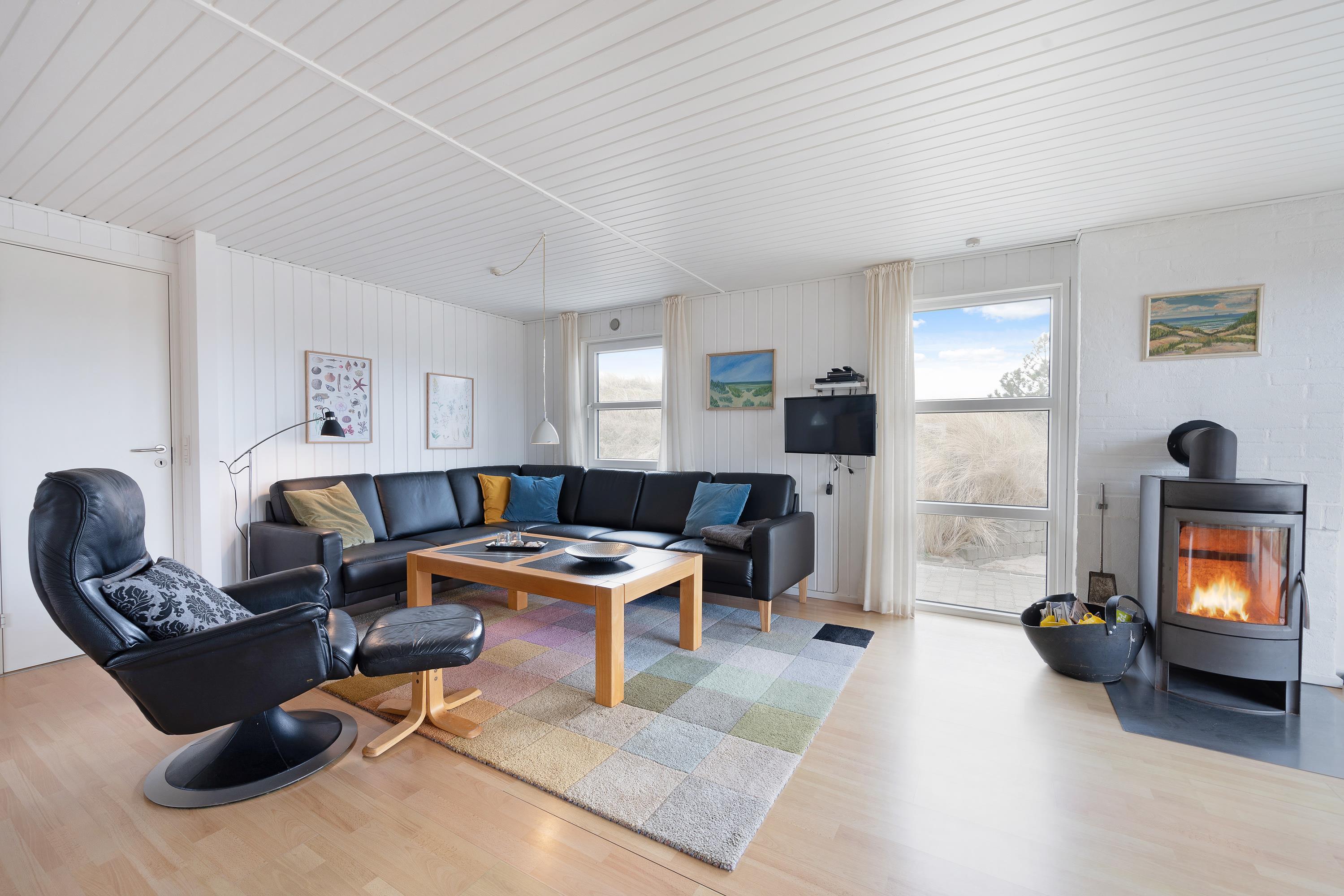 This holiday home is situated on a natural elevated plot in Bjerregård. The area is known for its stunning dune landscape and proximity to the North Sea.
