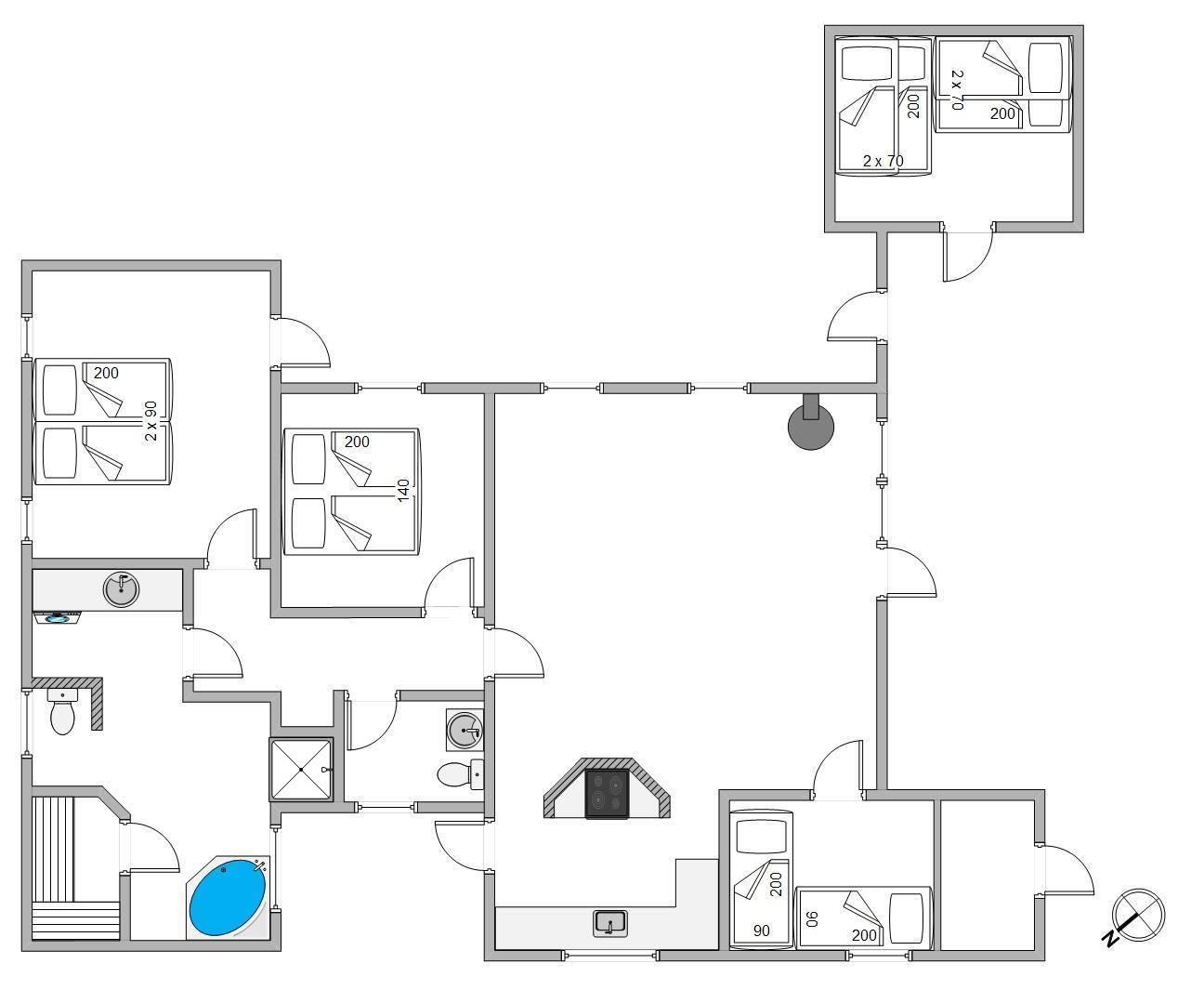 The holiday home accommodates six guests across three bedrooms, two with double beds. The third bedroom features a single bed, and there's also a bunk bed suitable for a child. Additionally, there's a lovely extension with two beds, allowing flexible sleeping arrangements.