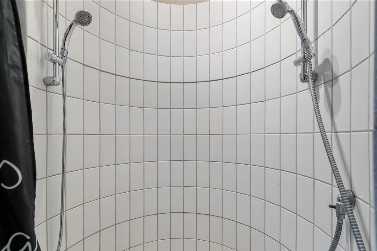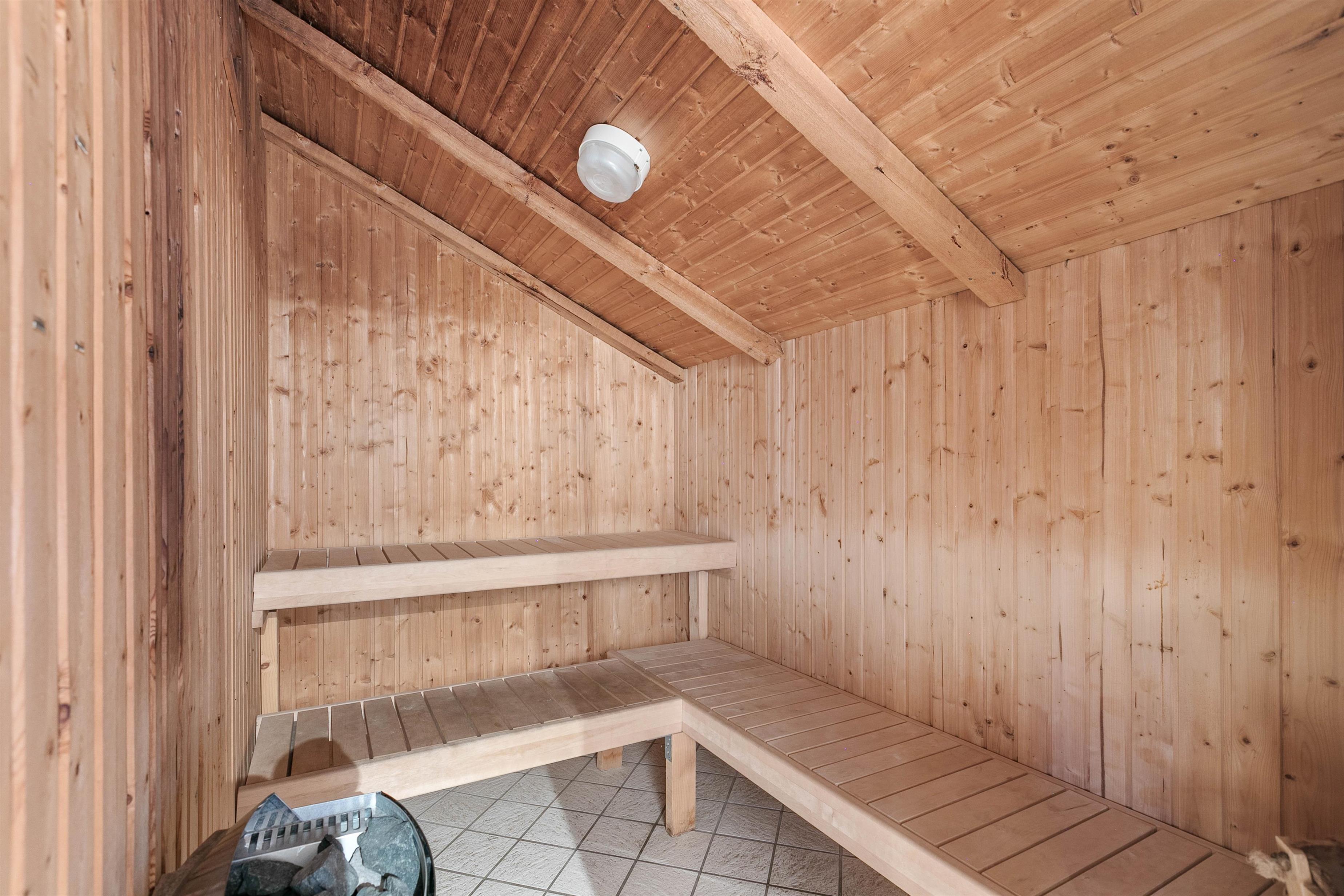 There are two bathrooms with underfloor heating, one of which is particularly spacious and features both a whirlpool and sauna.
