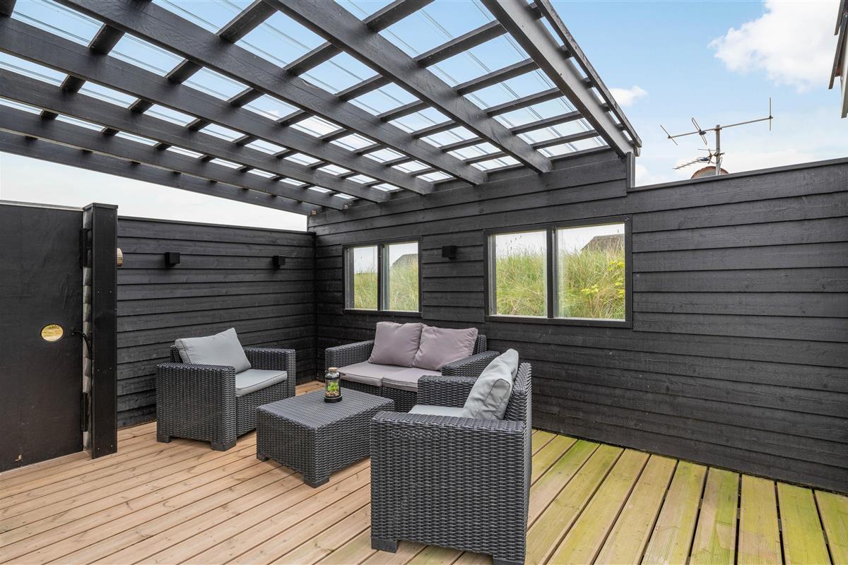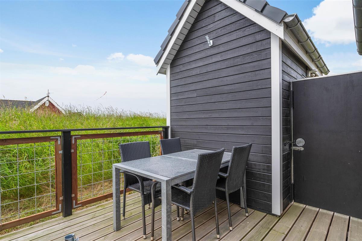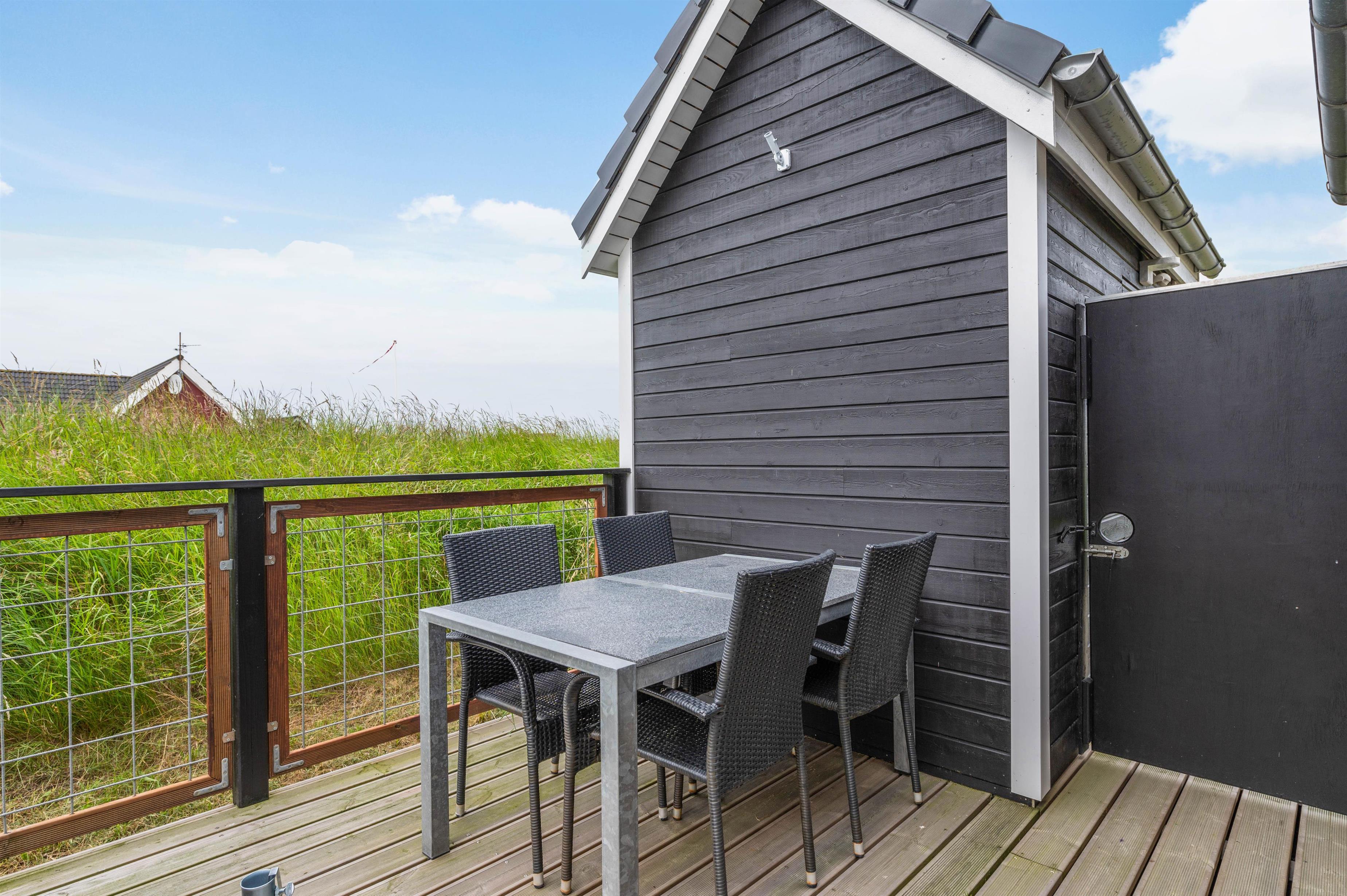 Around the holiday home, you'll find partially sheltered and partially covered terrace areas. One area is fully fenced, allowing children to play safely and dogs to remain secure. Whatever the wind direction or sun position, you'll always find a comfortable spot to enjoy the fresh sea air. The spacious natural plot with its vegetation offers natural screening for privacy.