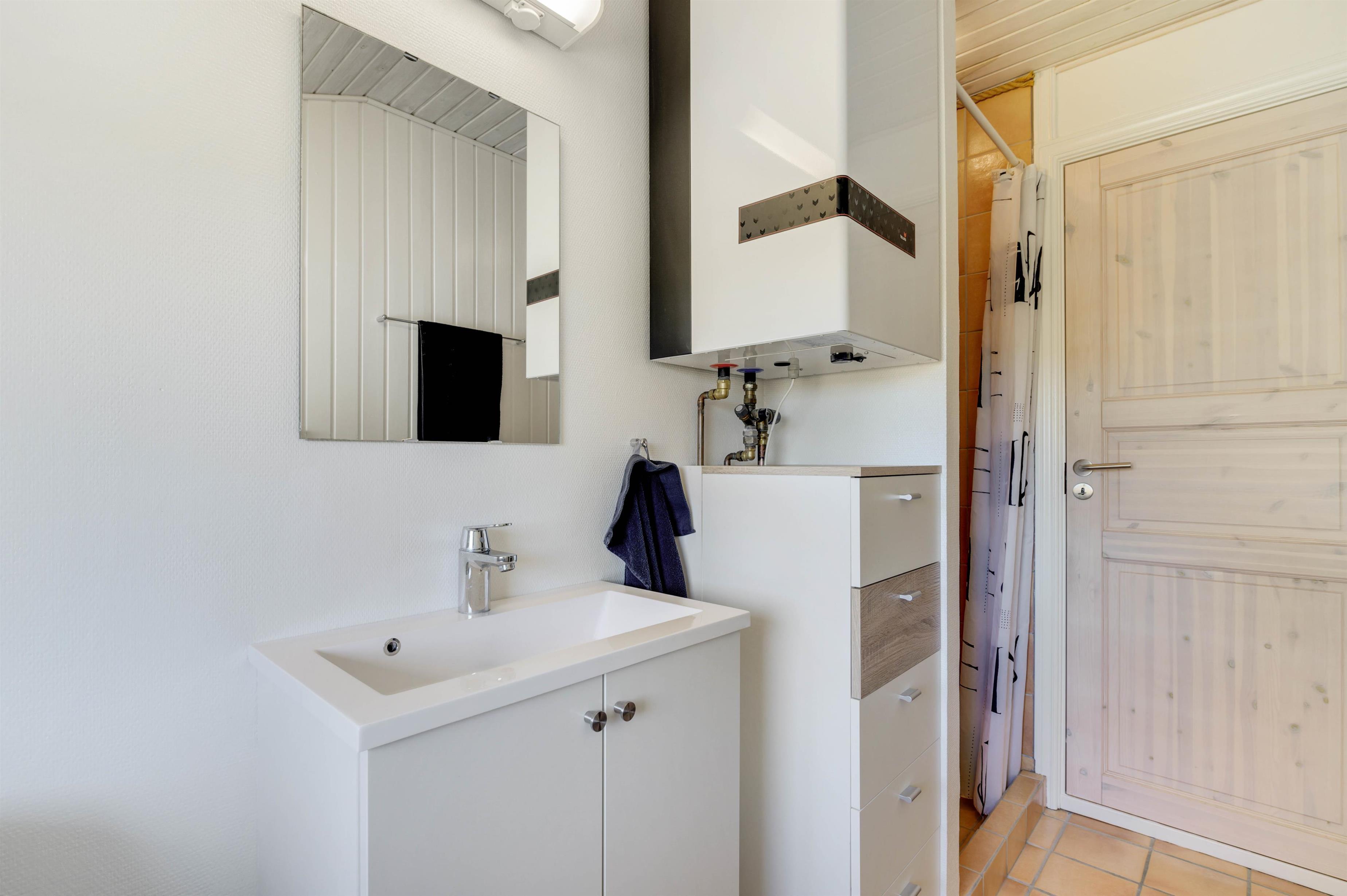 From the living area, you can step directly onto the south-facing terrace where you can spend many pleasant hours. The terrace is enclosed, partially screened, and covered, so you can peacefully end your day with a barbecue in the evening.