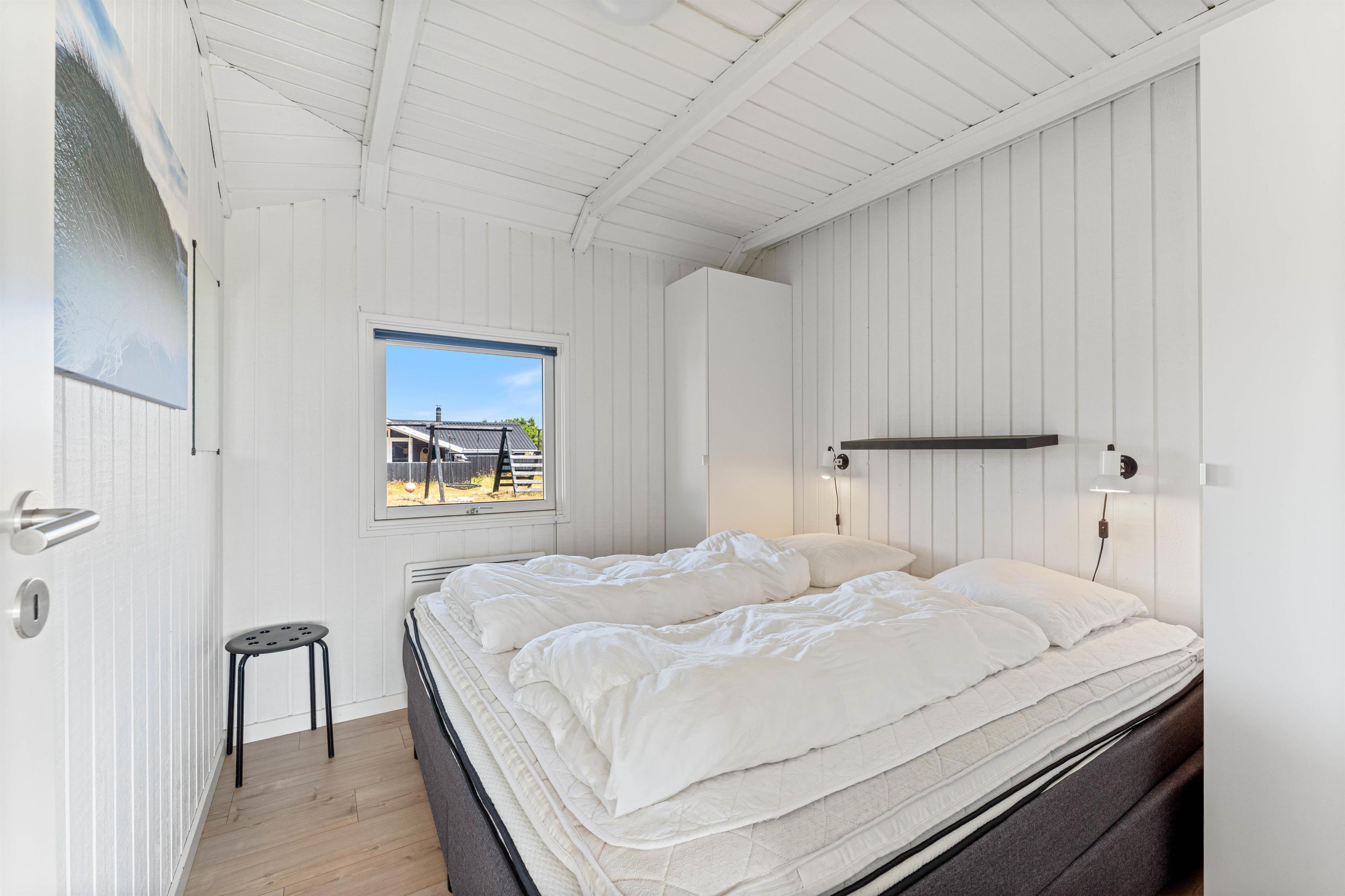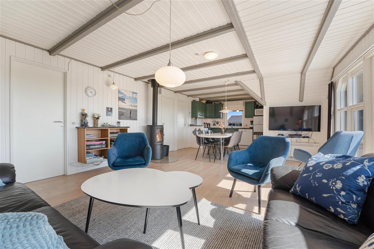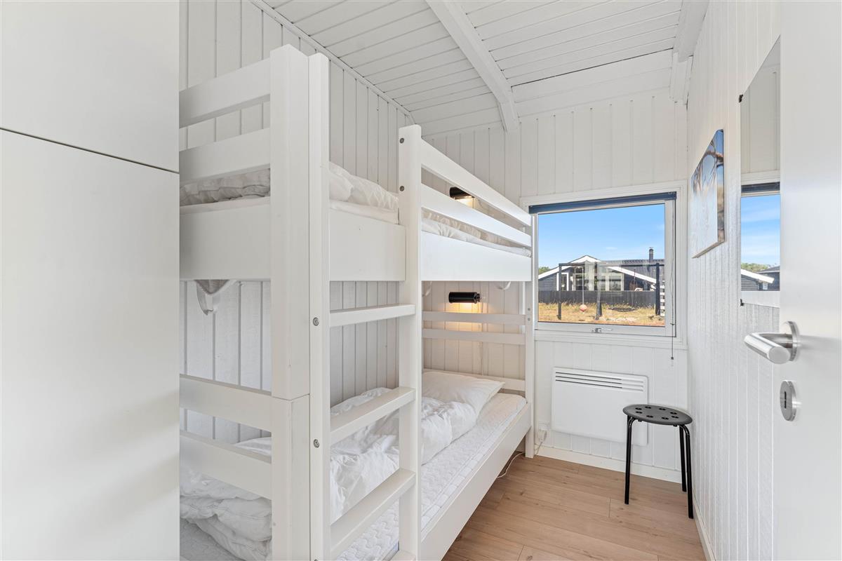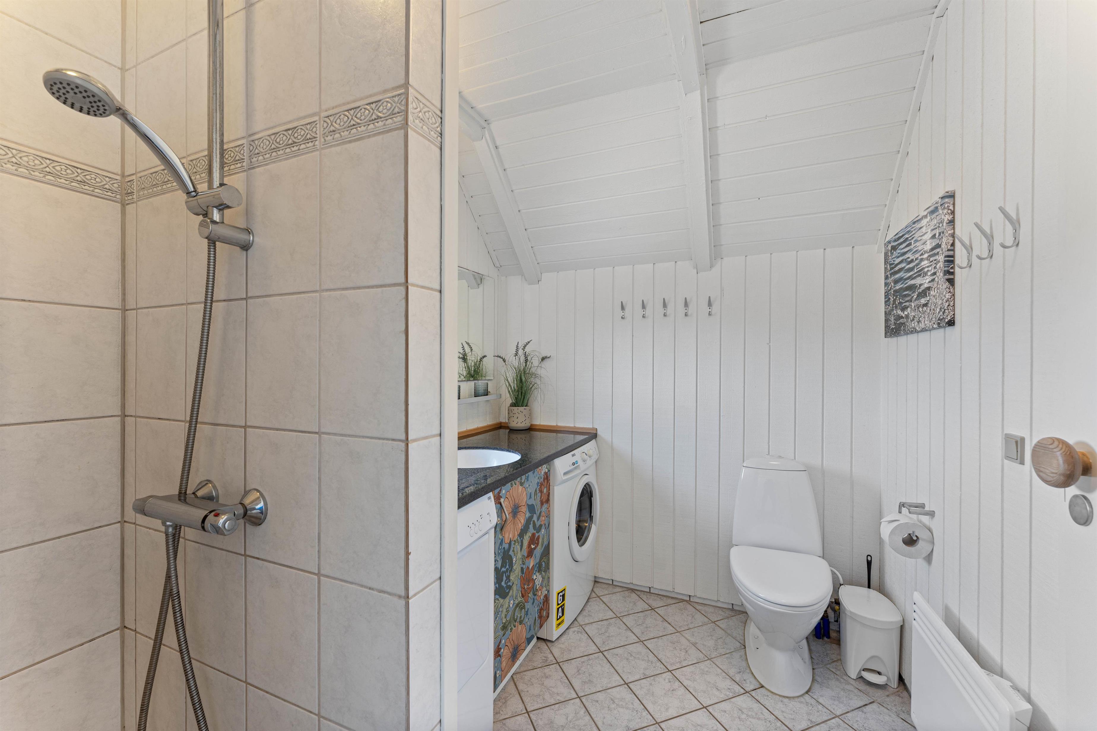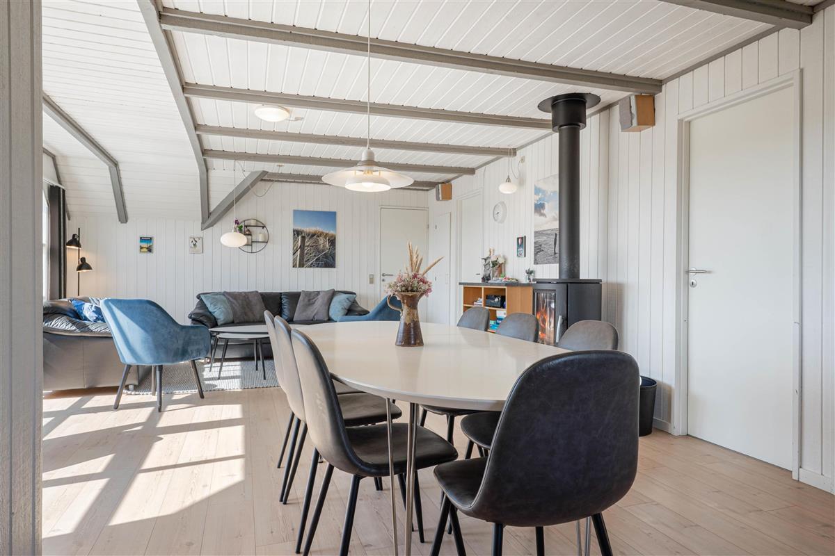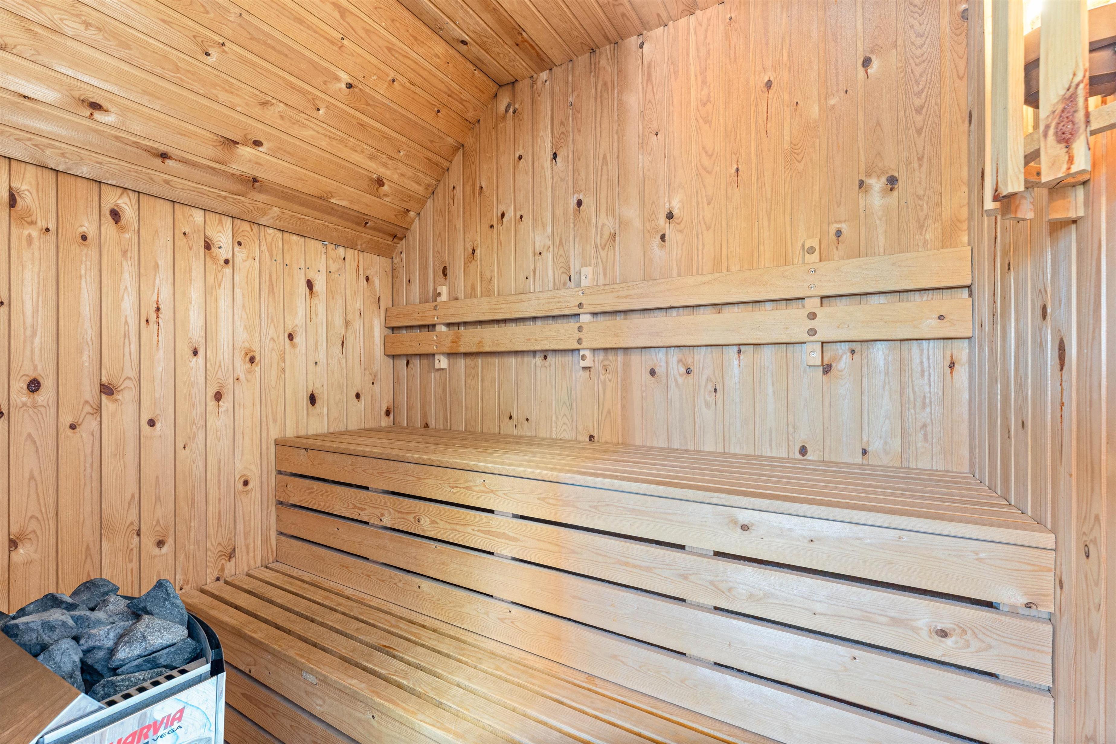 The floor is finished in light laminate, while the walls and ceiling are appropriately clad in light wood. After a long beach walk, you can unwind in the holiday home's sauna - perfect for warming up again.