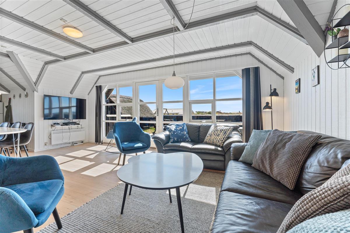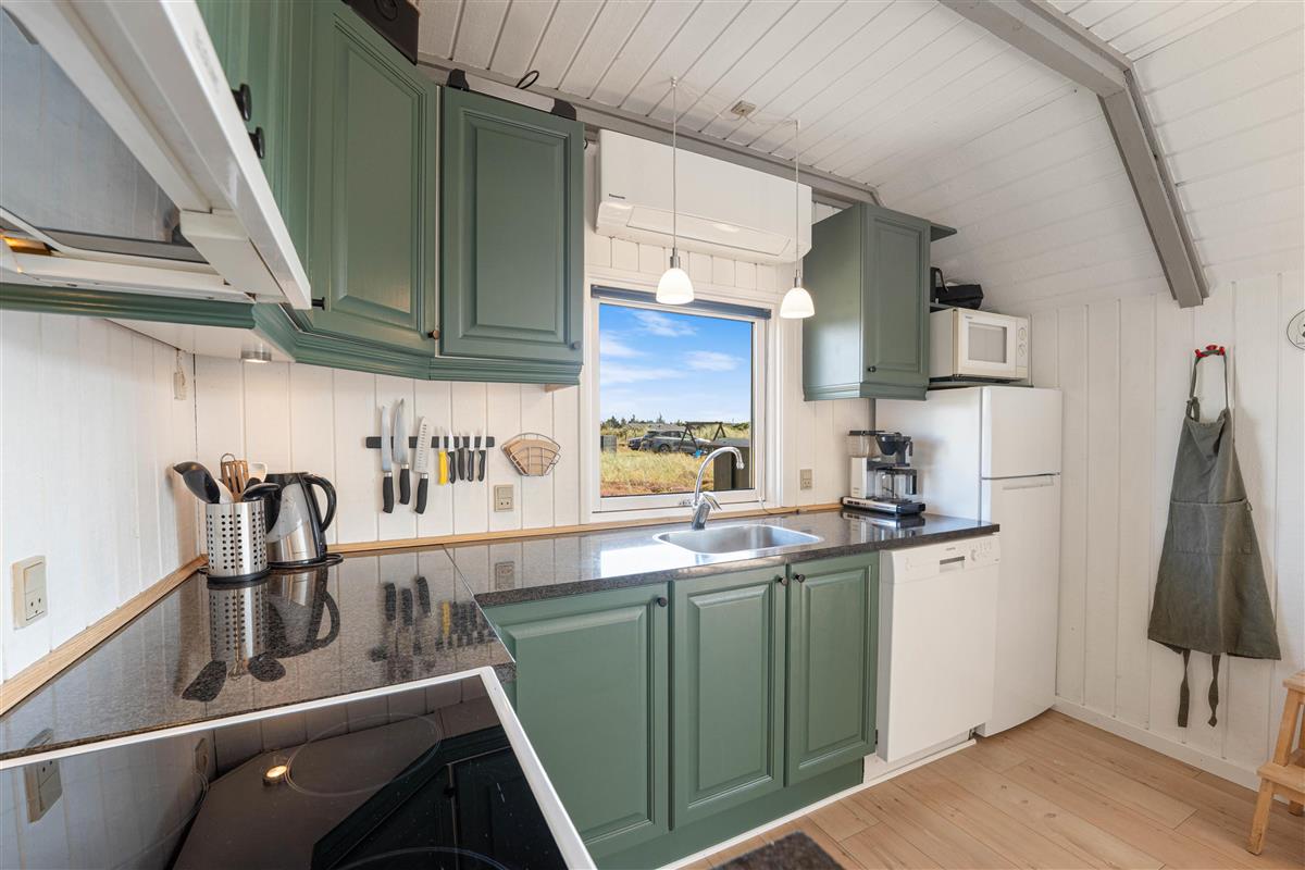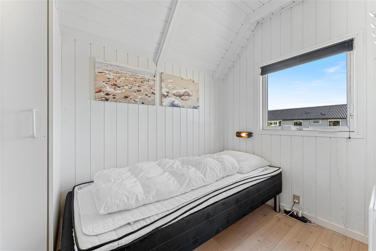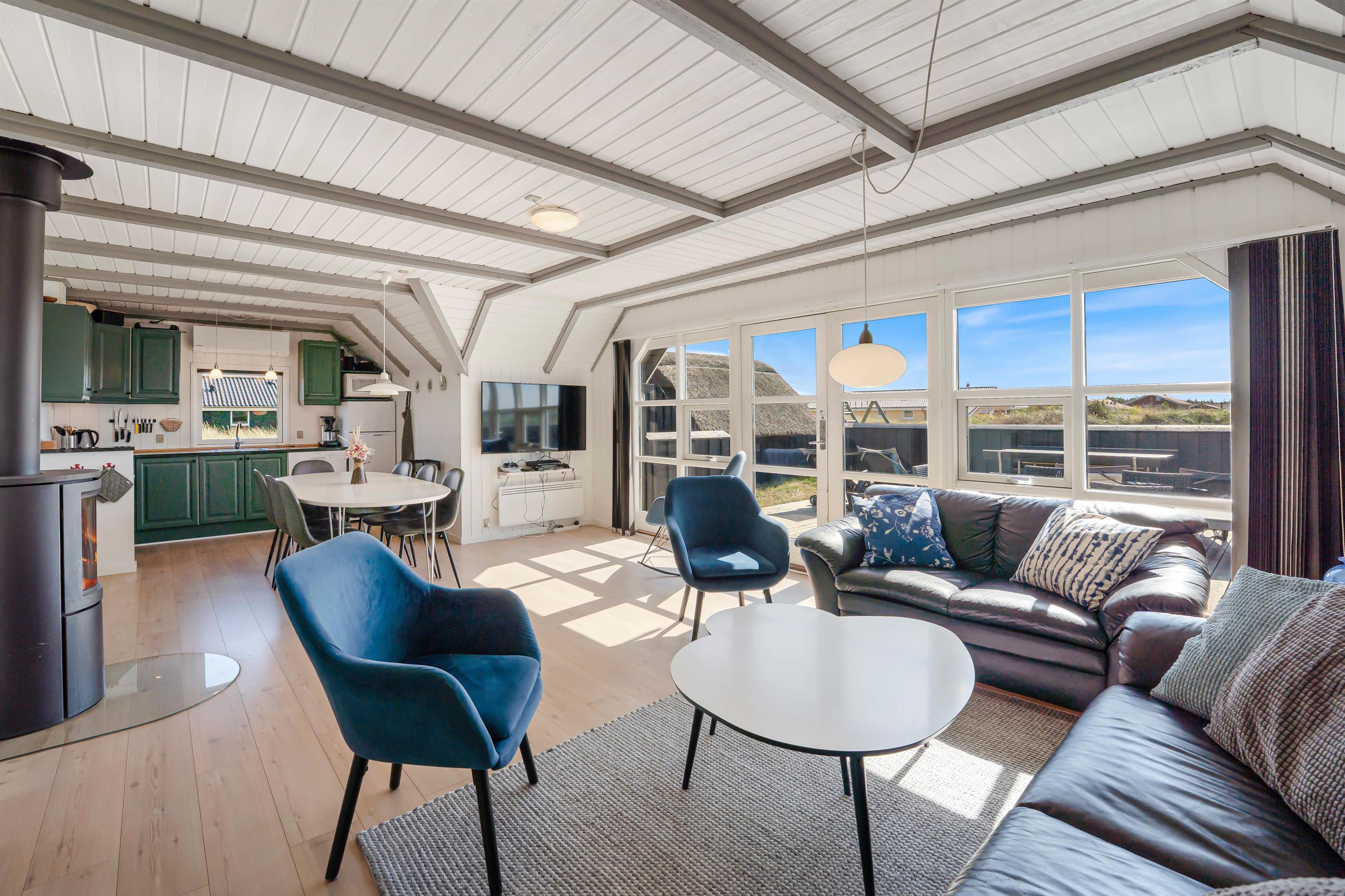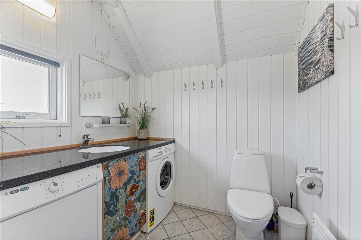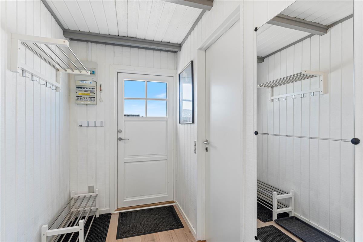 The floor is finished in light laminate, while the walls and ceiling are appropriately clad in light wood. After a long beach walk, you can unwind in the holiday home's sauna - perfect for warming up again.