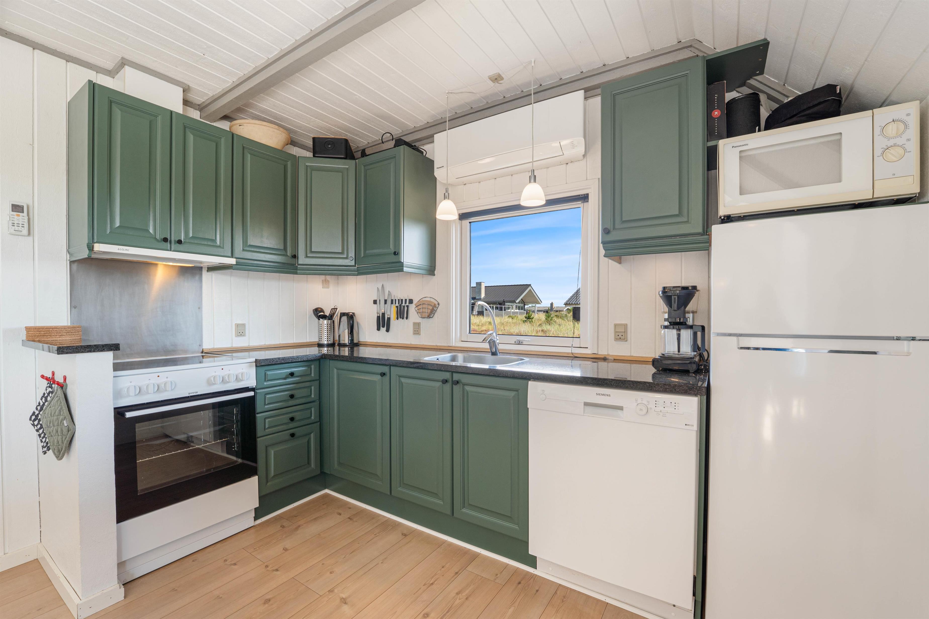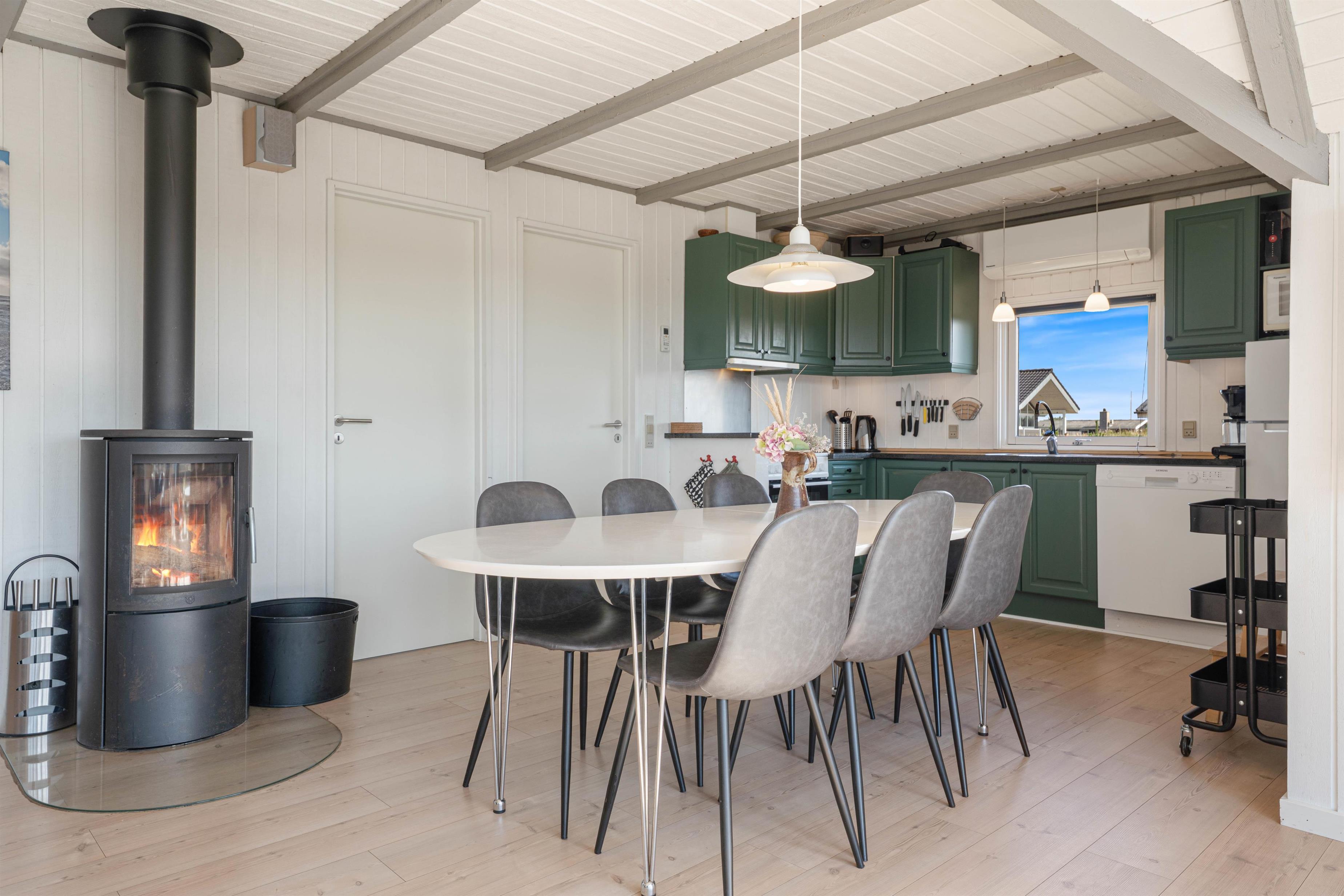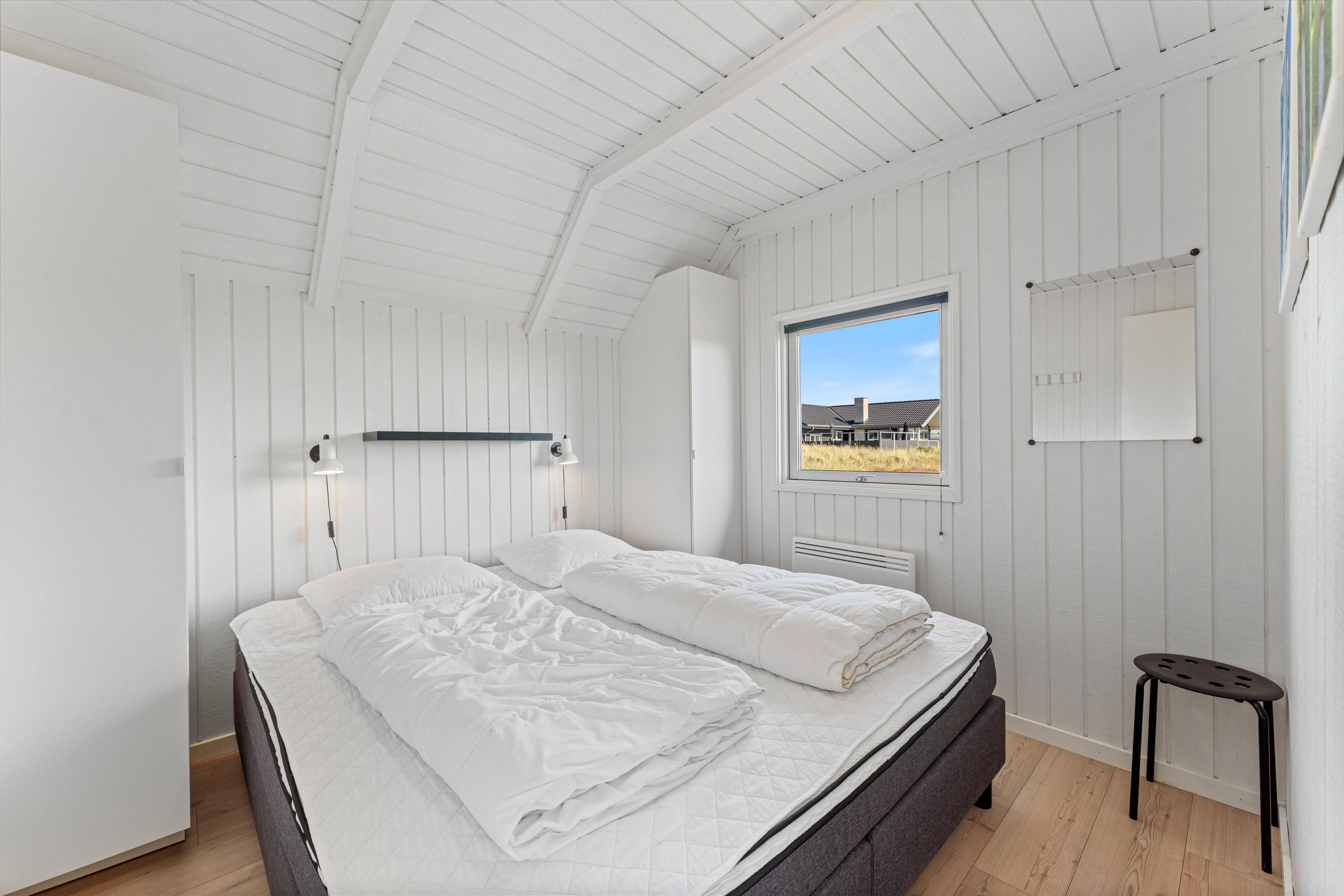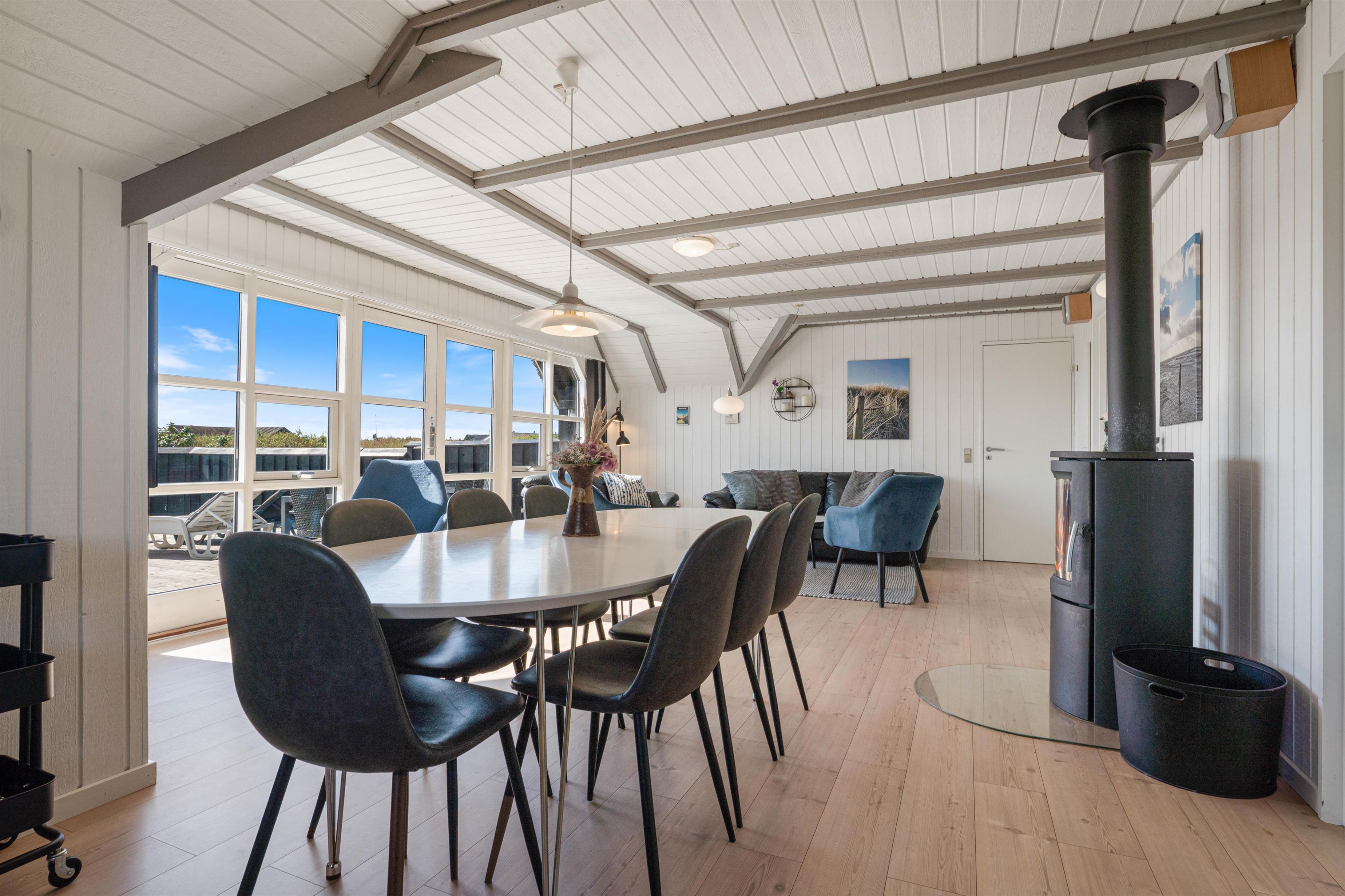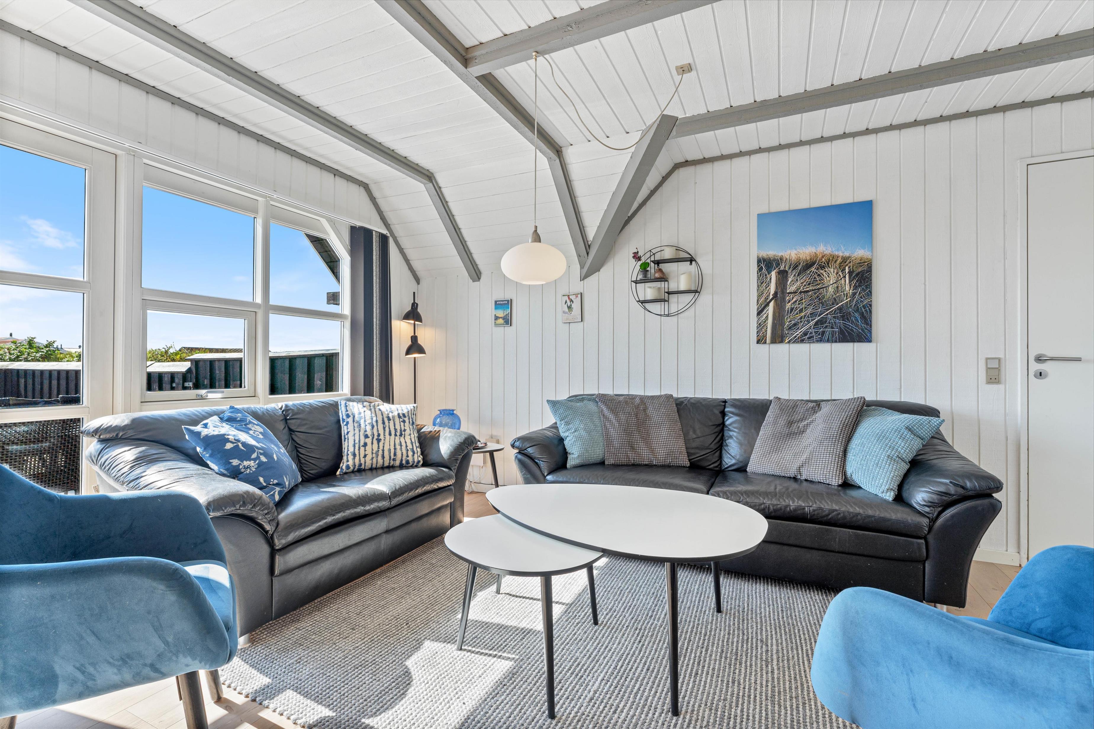 The floor is finished in light laminate, while the walls and ceiling are appropriately clad in light wood. After a long beach walk, you can unwind in the holiday home's sauna - perfect for warming up again.