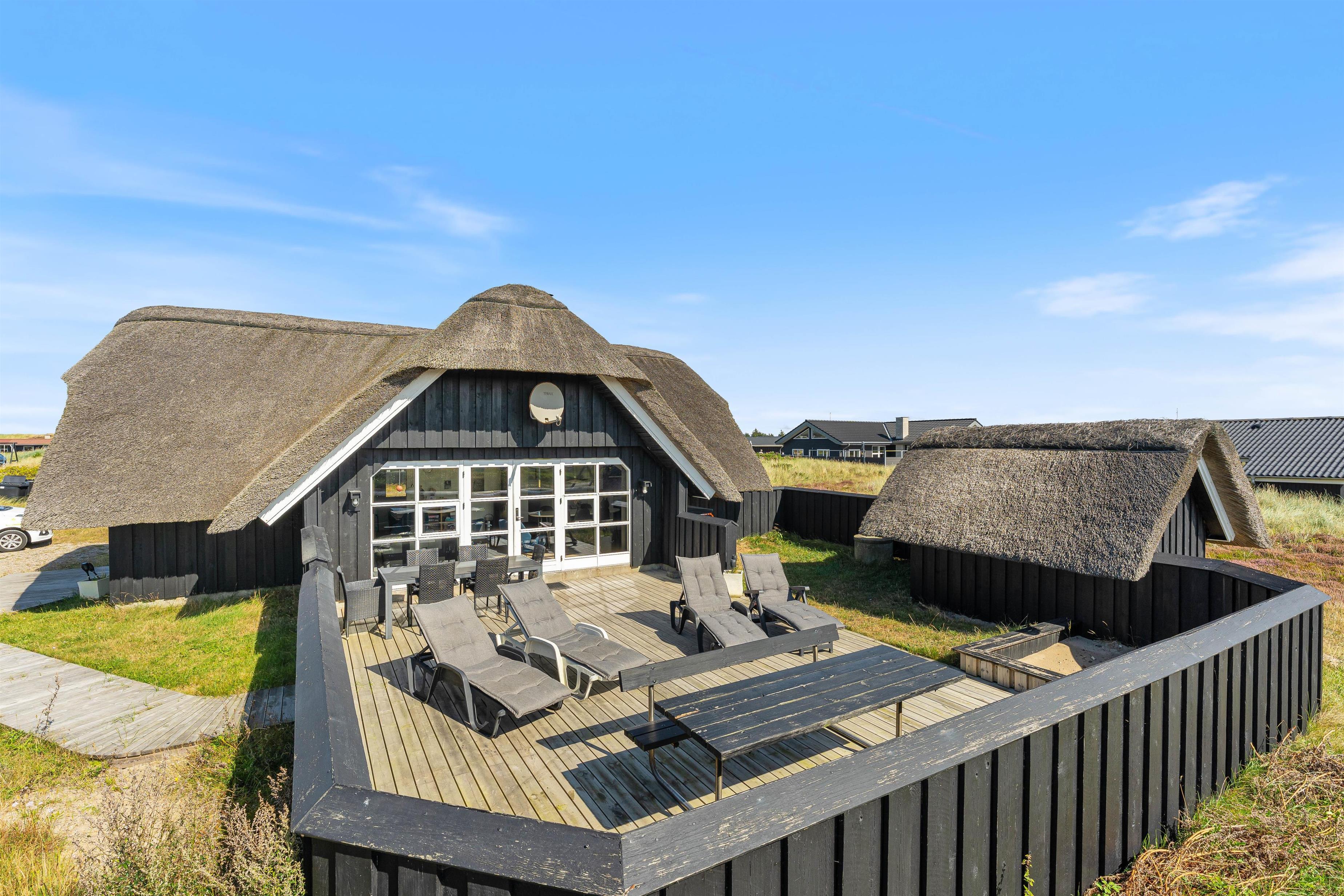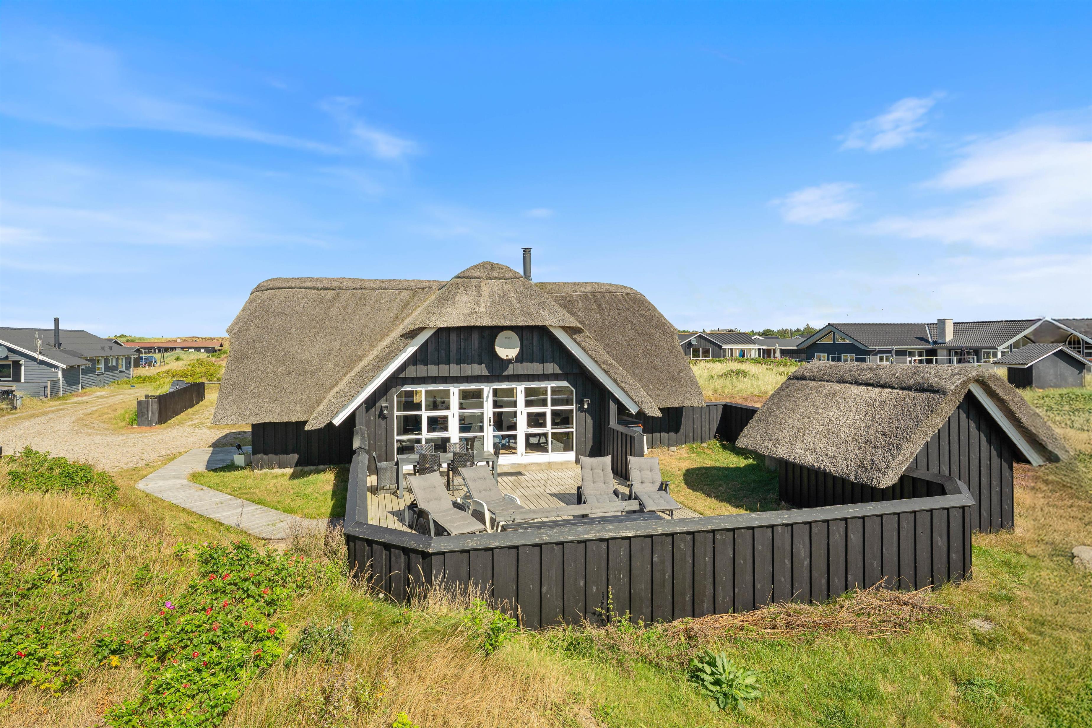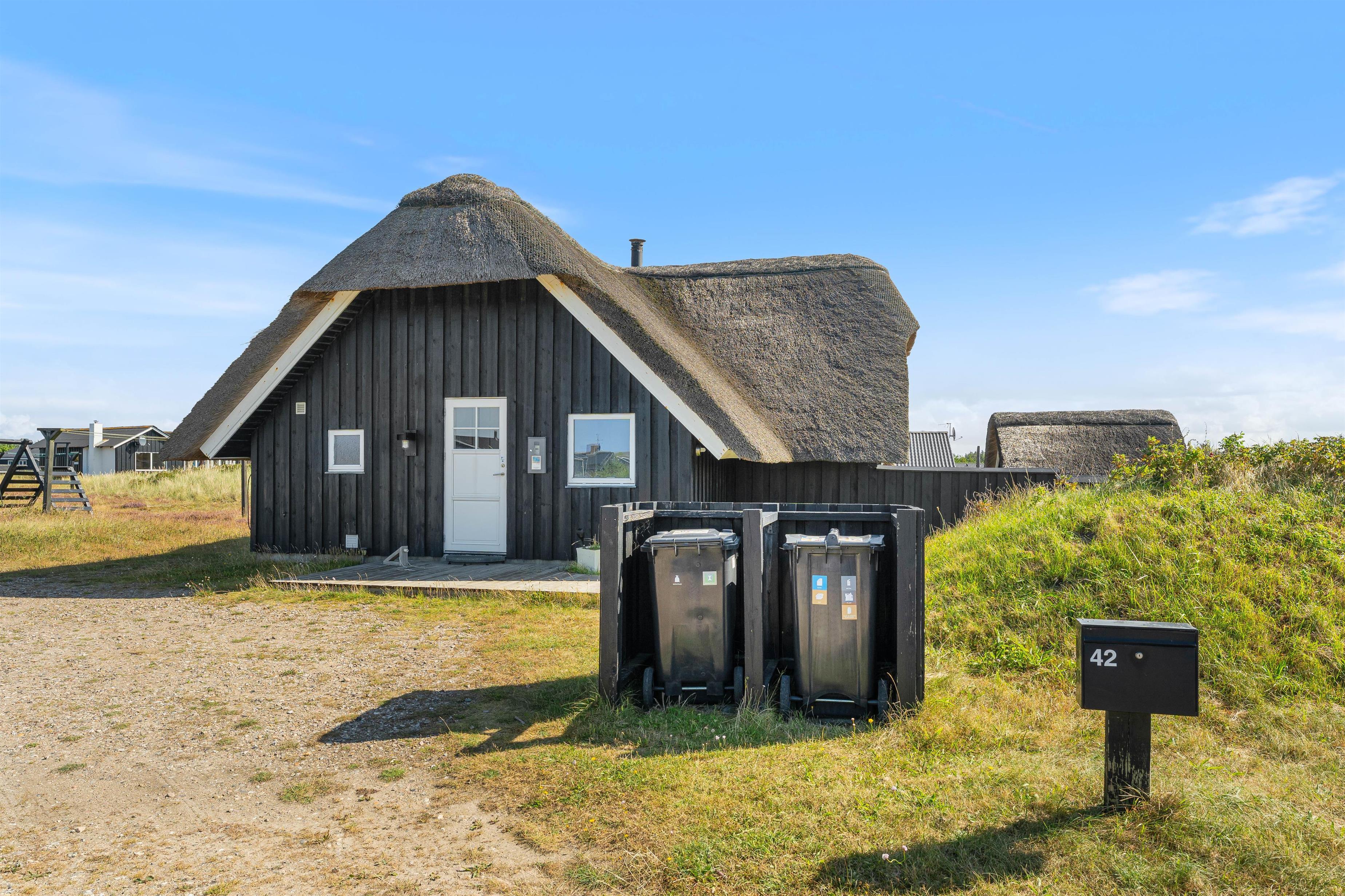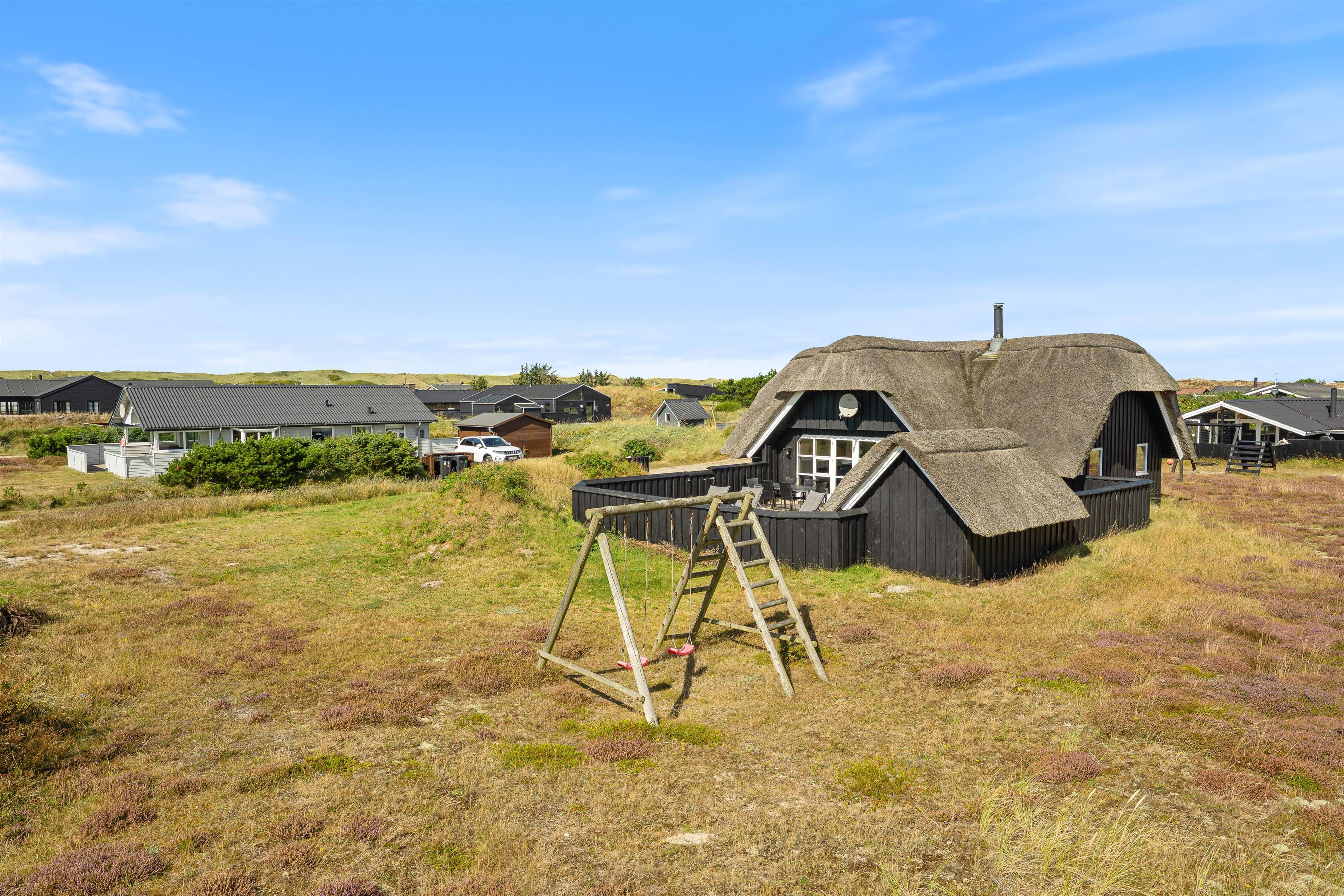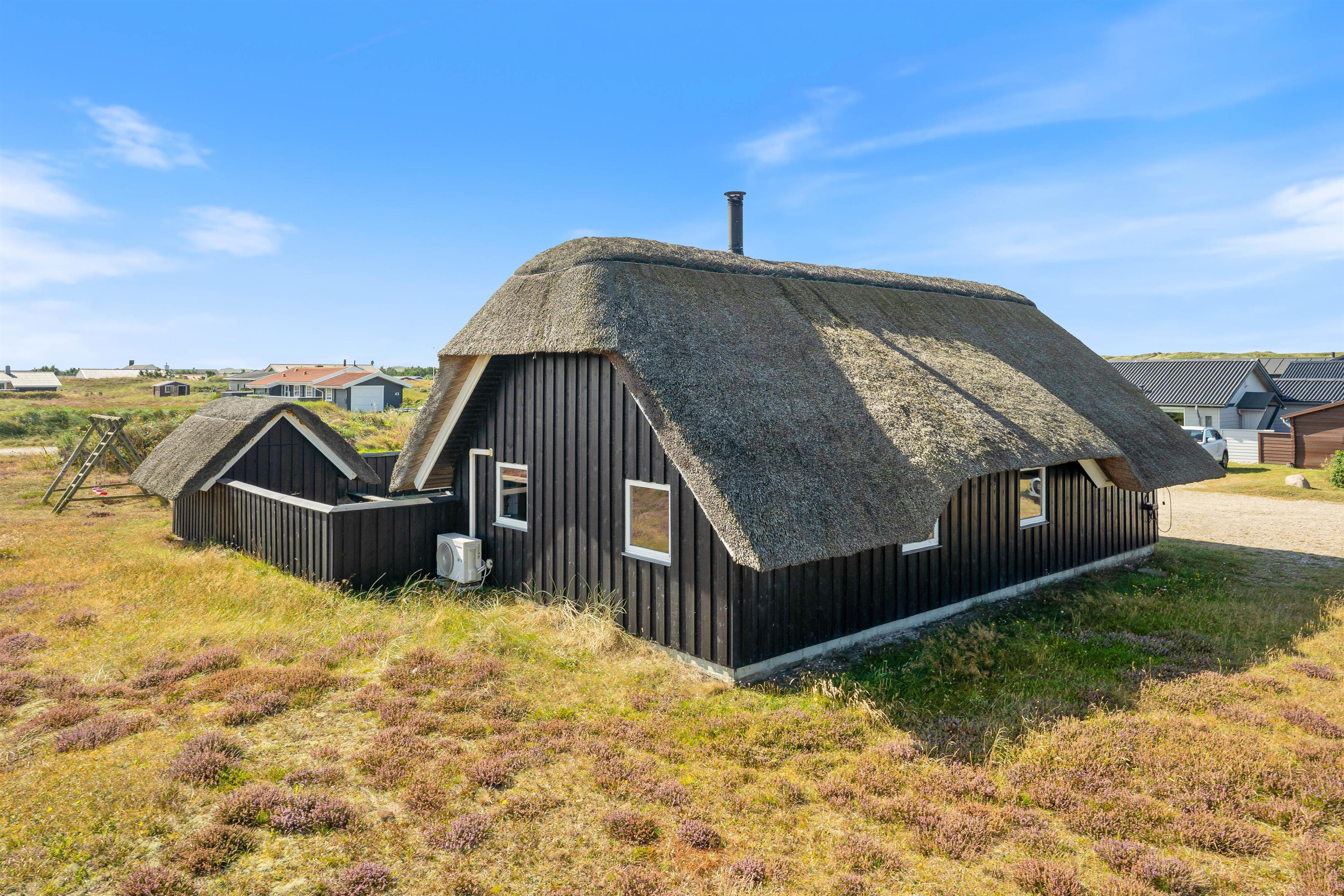Located at Dortheasvej 42 in the beautiful holiday resort of Bjerregård, this charming thatched holiday home sits on a natural plot in a convenient location. It's just 500 metres from the miles-long sandy beach of the Danish west coast and approximately 700 metres from the local shop. The bright and stylish interior creates a pleasant atmosphere in the living area. Two pets are also warmly welcomed in this holiday home.