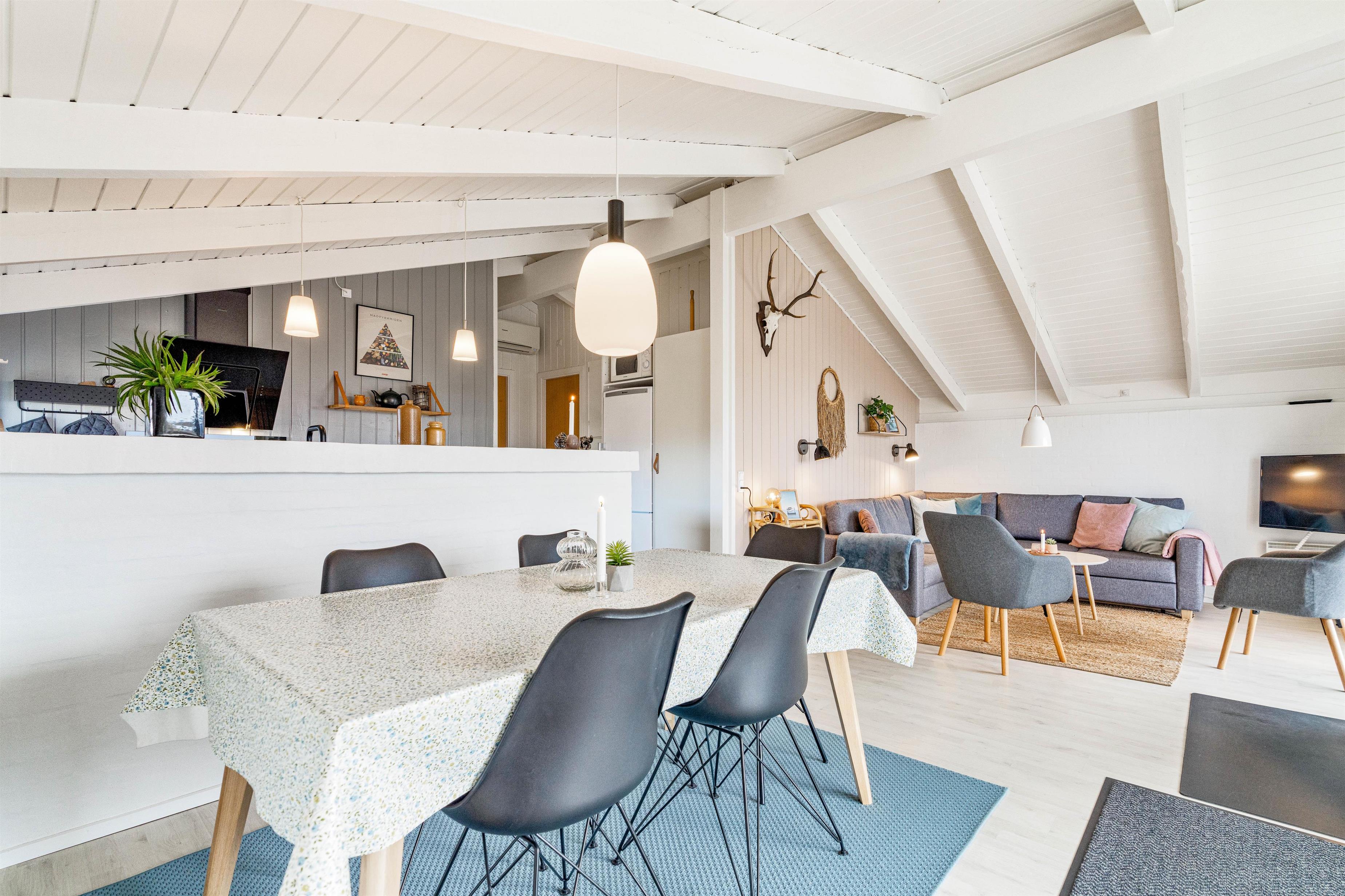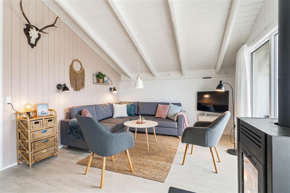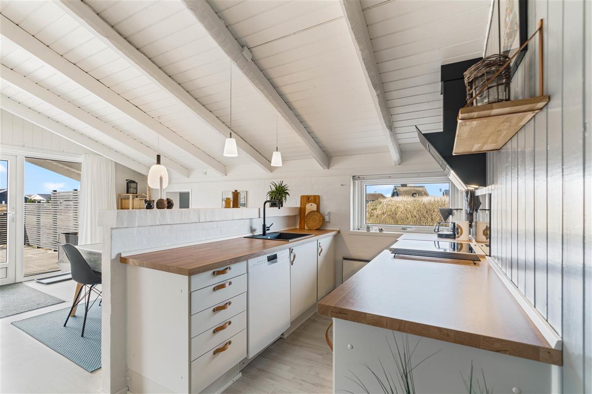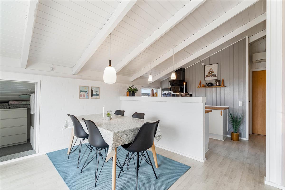 The spacious living area at Bjerregårdsvej 311 combines the kitchen, dining area and living room into one open-plan space where families can spend quality time together. The bright room with high ceilings invites relaxation, while the wood-burning stove provides a cosy warmth and creates a snug atmosphere with its crackling fire.