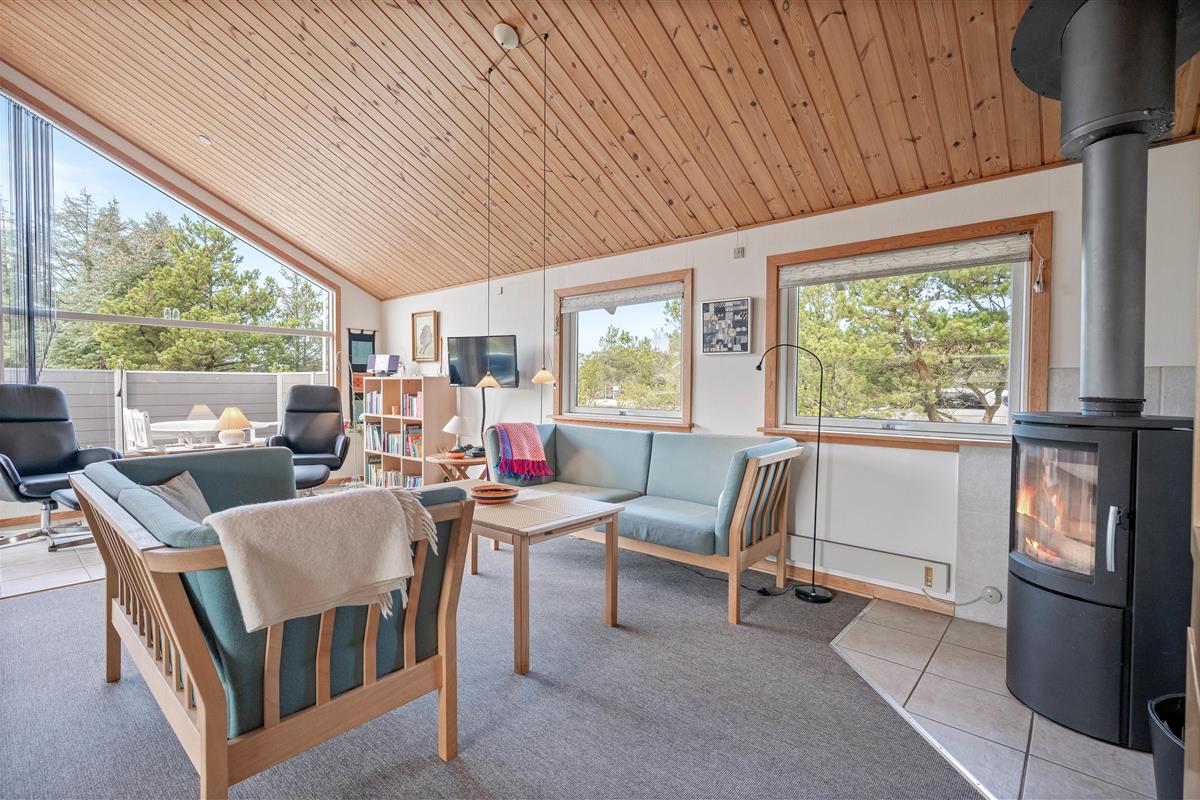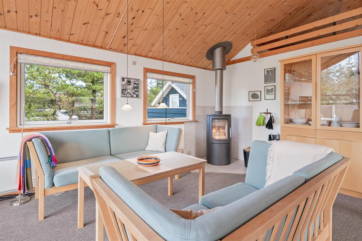 With a living area of 79 m², there’s plenty of space to spread out. Especially in the combined living area, where the lounge, dining area and kitchen blend together into one cosy meeting point. Here you can spend your days relaxing on the comfortable sofa and your evenings gathered around the dining table with a glass of red wine – all while listening to the gentle crackling of the wood-burning stove in the background.