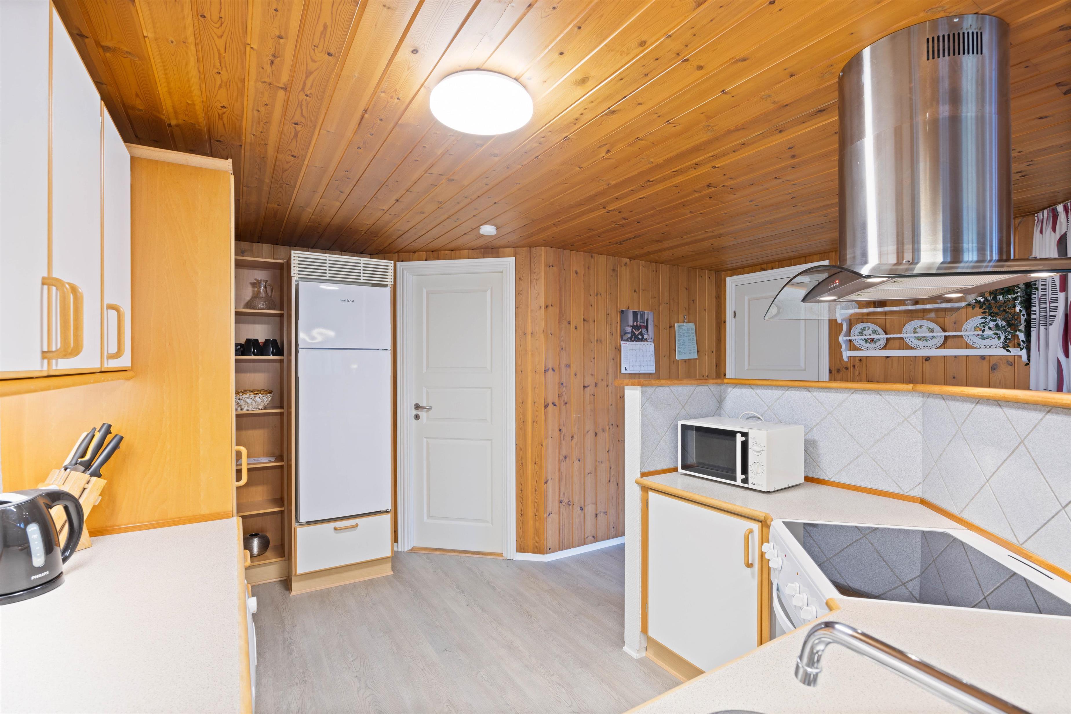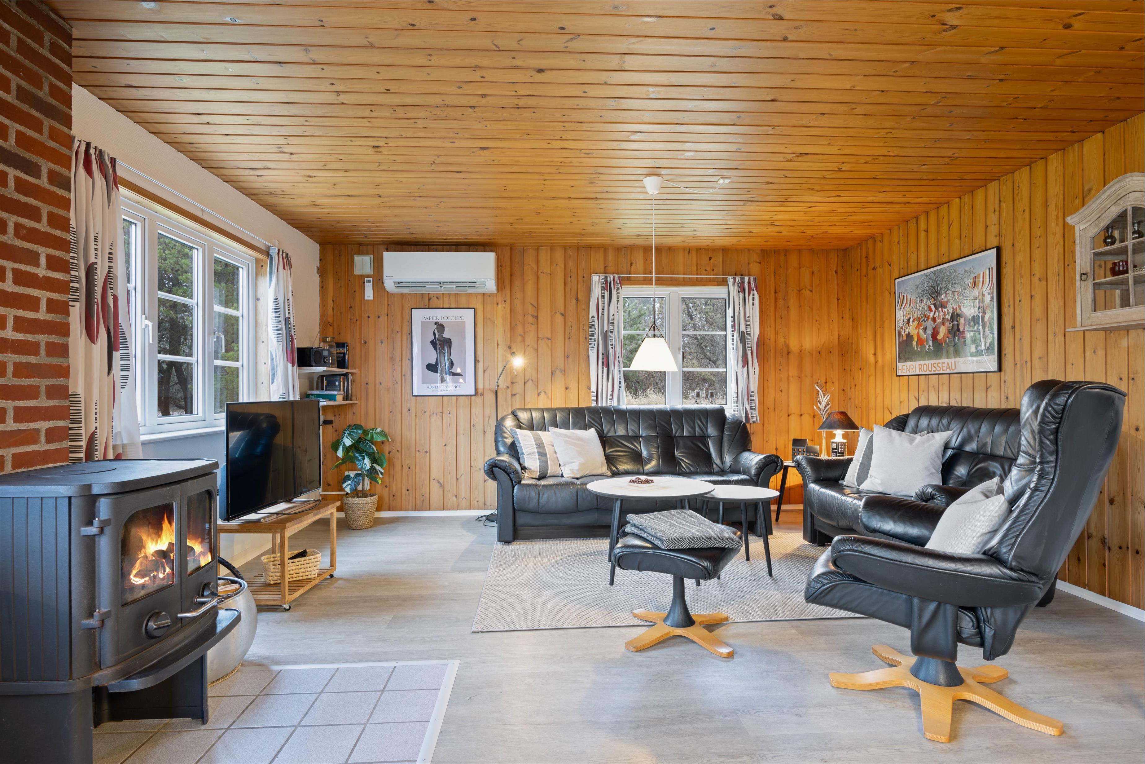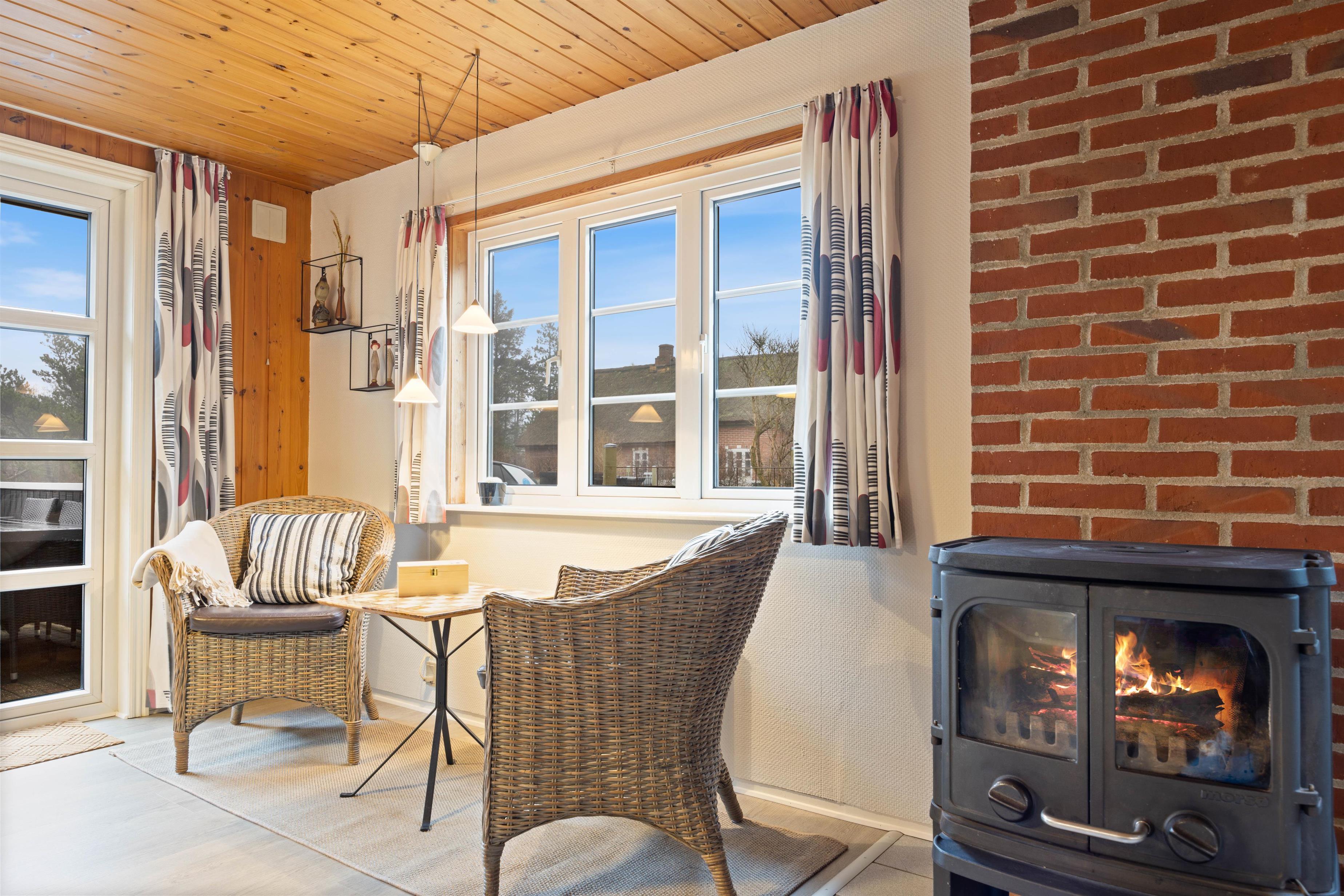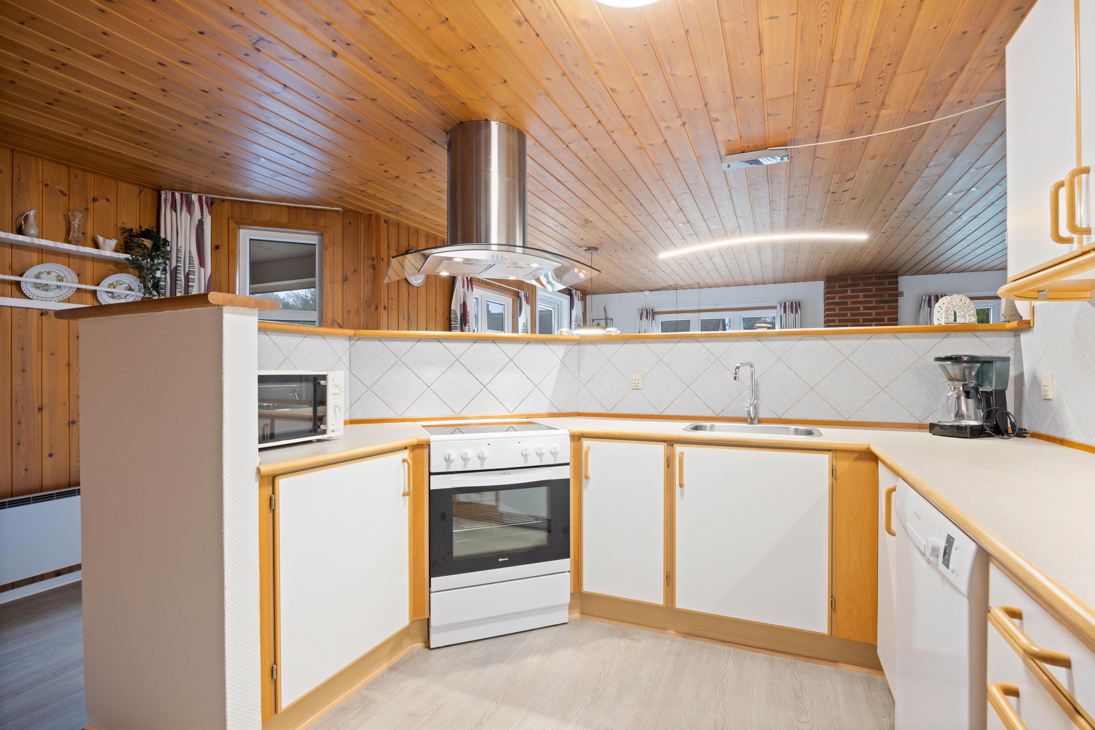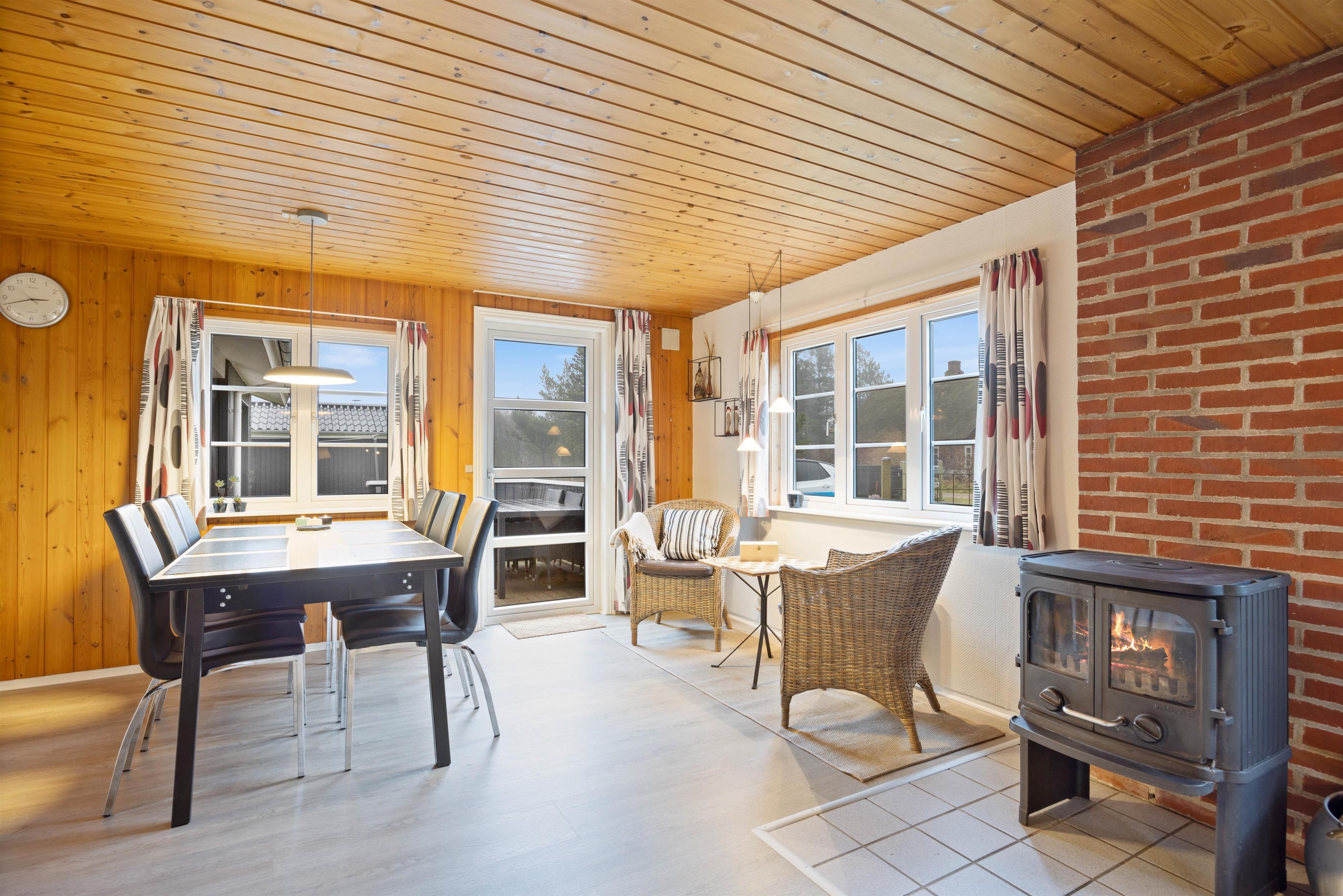This charming holiday home features traditional Danish summer house furnishings, with wooden ceilings and walls lending warmth to the spacious living area. The practical and well-equipped kitchen forms the heart of the holiday home and opens onto the living and dining area. The fireplace provides cosy warmth and sets the scene for relaxing evenings.