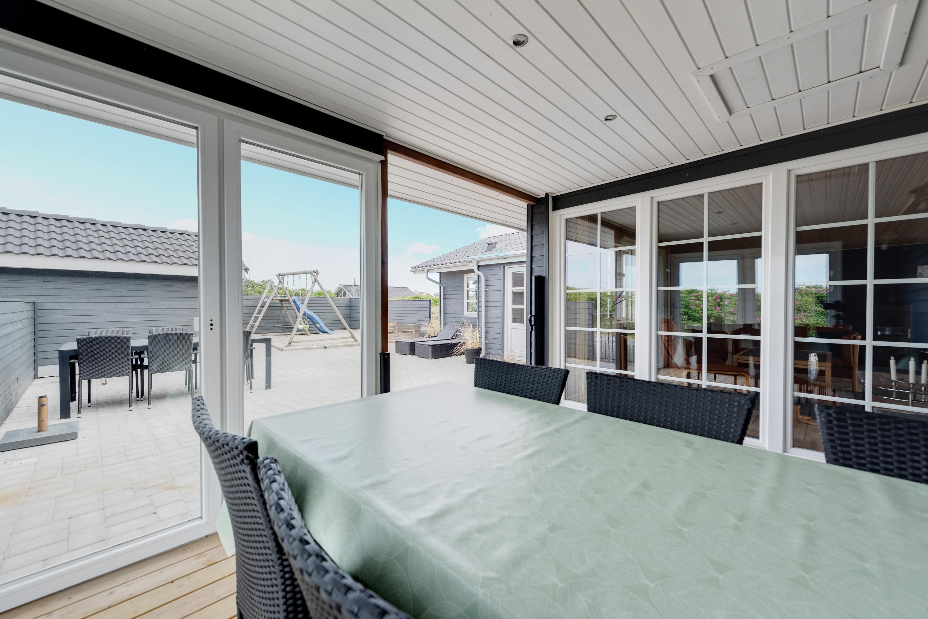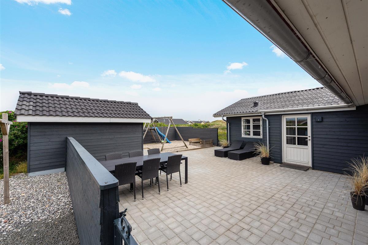 Outside, you'll find a large enclosed terrace. Stylishly decorated with garden furniture and sun loungers, it's perfect for enjoying the fresh North Sea air. While you prepare for a barbecue evening, children can play on the swing and in the sandpit in the evening sun. With various terraces around the house, you can always choose between sunny or shaded spots.