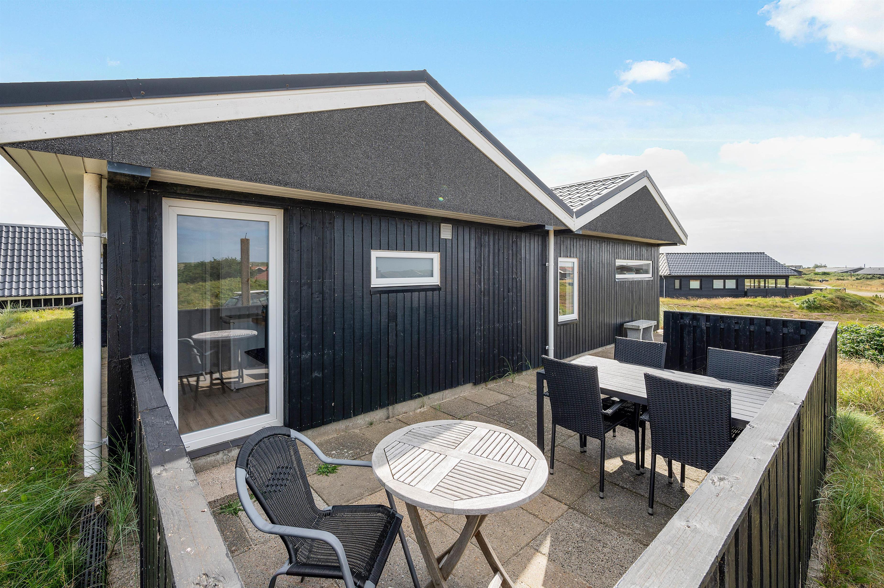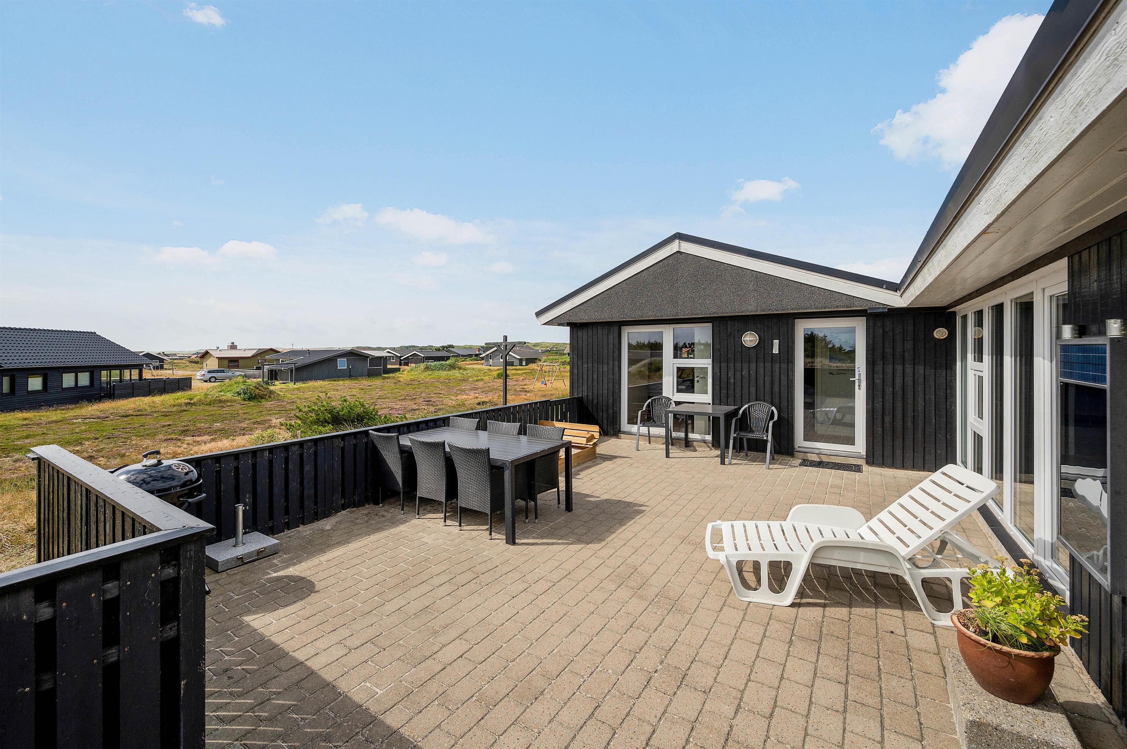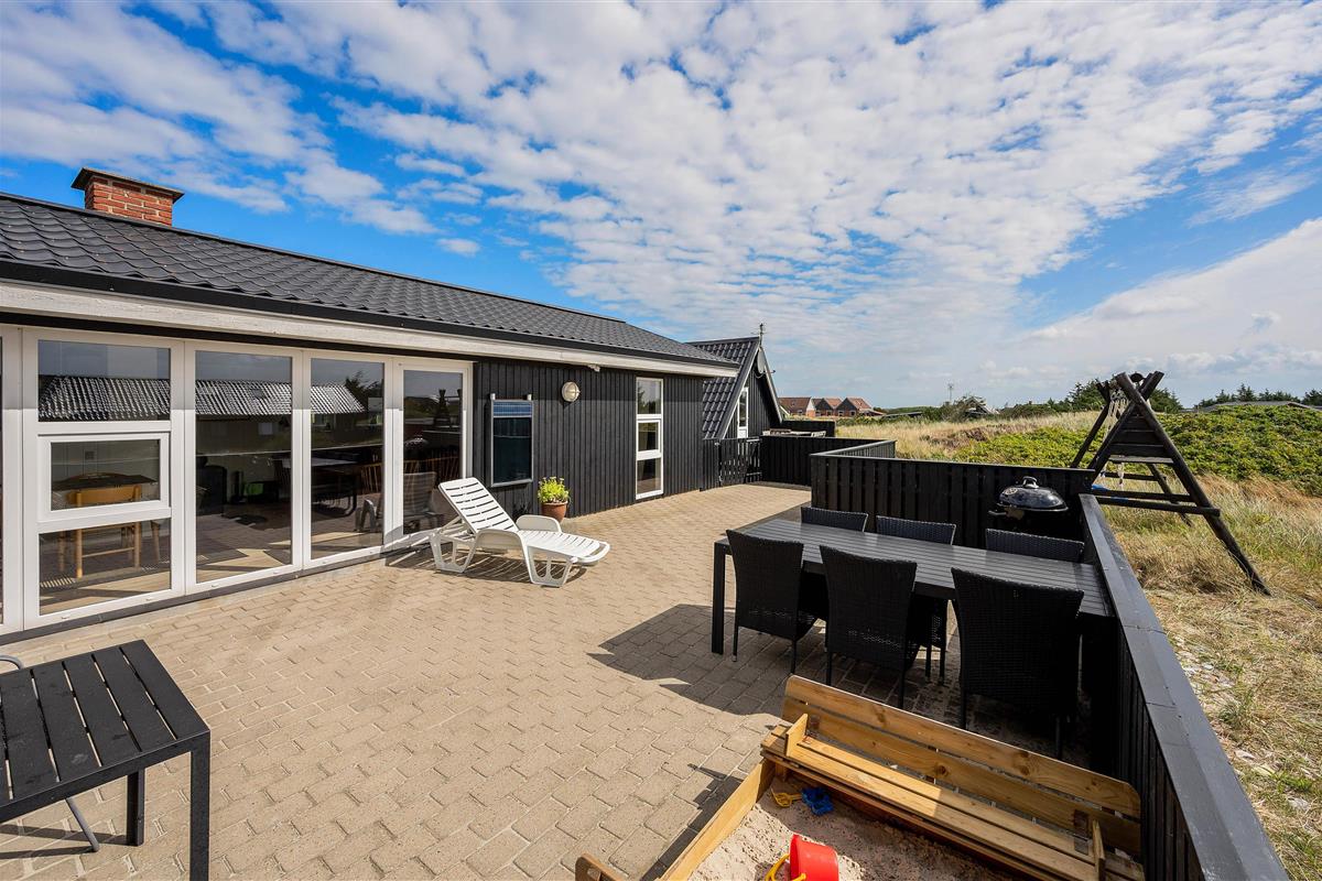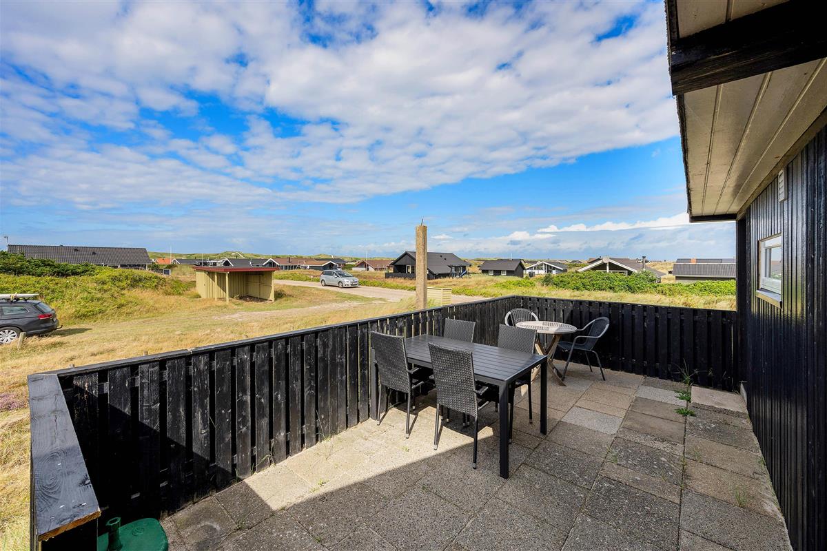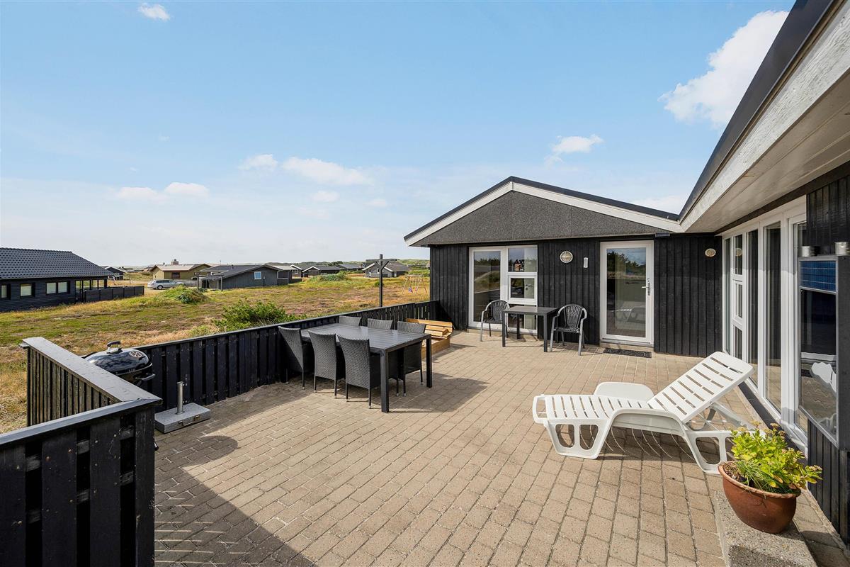 An additional terrace on the western side of the holiday home offers the perfect spot to enjoy a glass of wine while watching the sun set behind the dunes in the tranquility of Bjerregård.