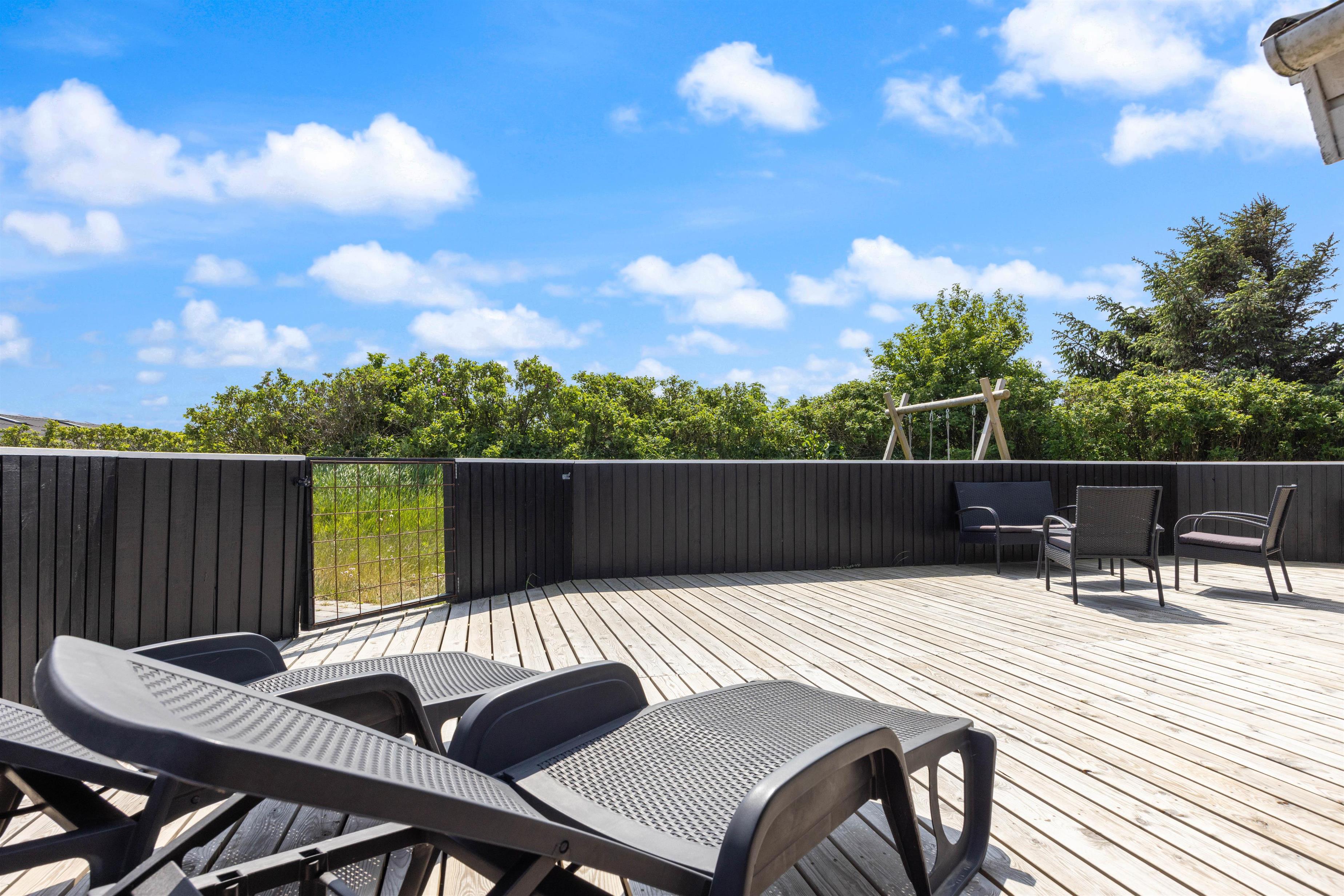 The holiday home sits on a generous 1,200-square-metre natural plot, offering plenty of space for outdoor activities. Your children can enjoy the swing or play in the sandpit while you relax on the enclosed terrace with your favourite book.