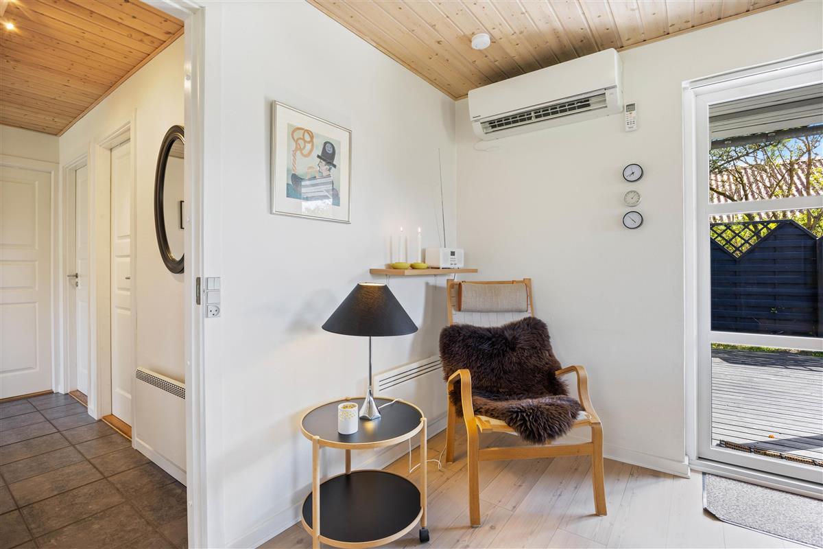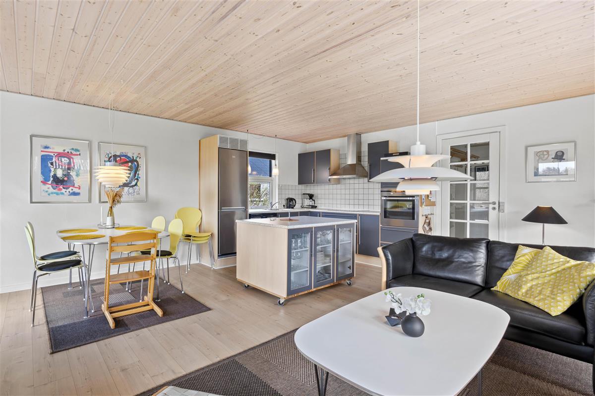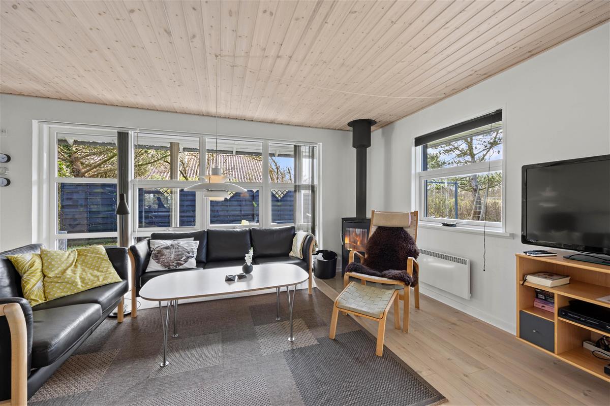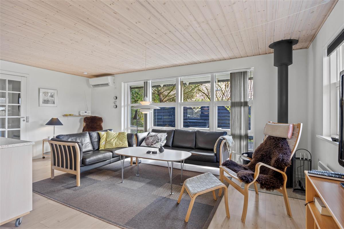 At Heidesvej 10, the bright and welcoming interior greets you as soon as you enter. Large windows and glass doors leading to the terrace flood the living area with natural light. Here you can settle into the comfortable sofa and enjoy the warmth from the wood-burning stove while relaxing with a cup of hot chocolate. An energy-efficient heat pump helps keep heating costs low.