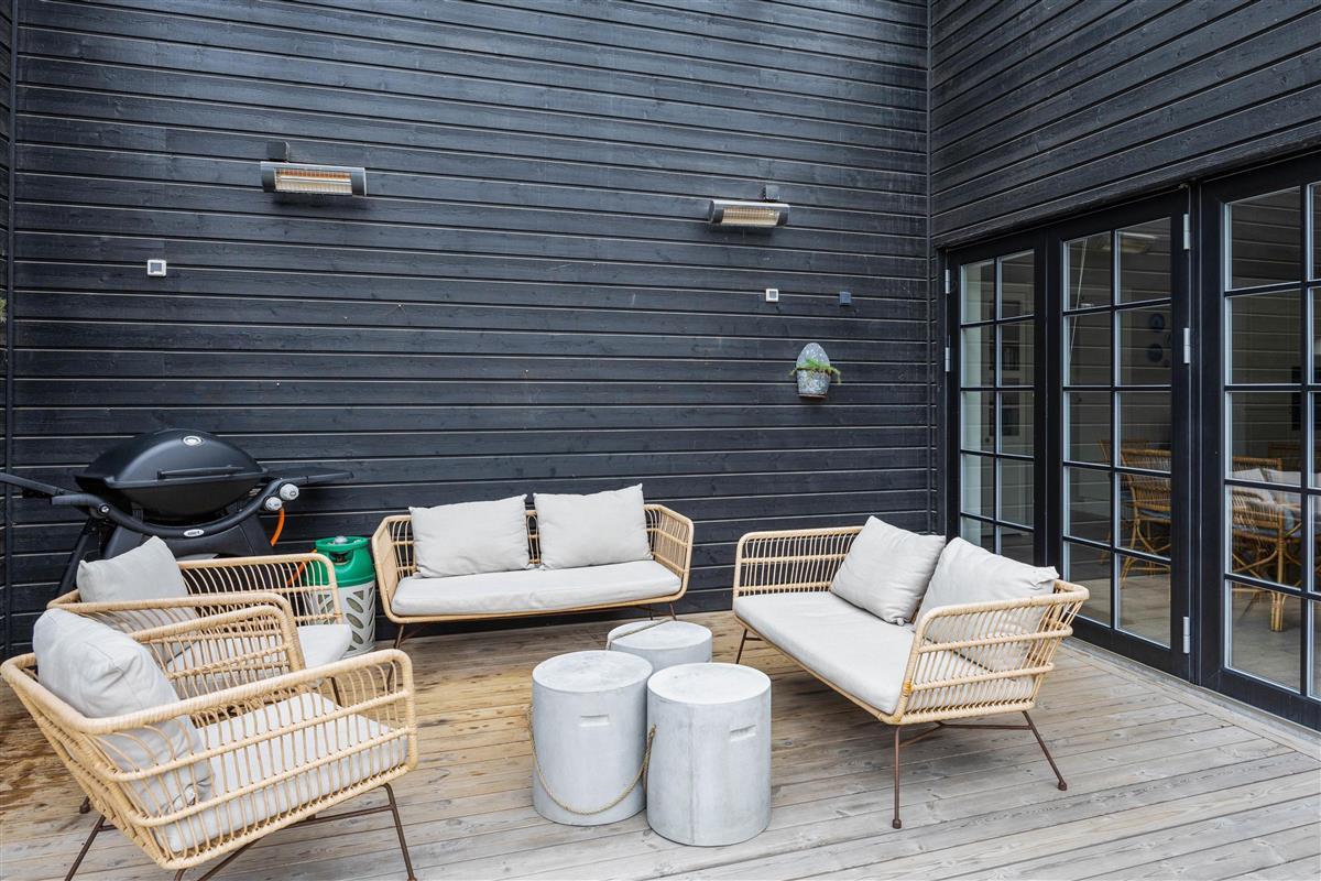 The 1,200-square-metre natural plot offers plenty of space for everyone to unwind. Comfortable garden furniture and sun loungers are provided on the beautiful wooden terrace. Enjoy a coffee while watching the children play in the sandpit, on the swing, or explore the grounds.