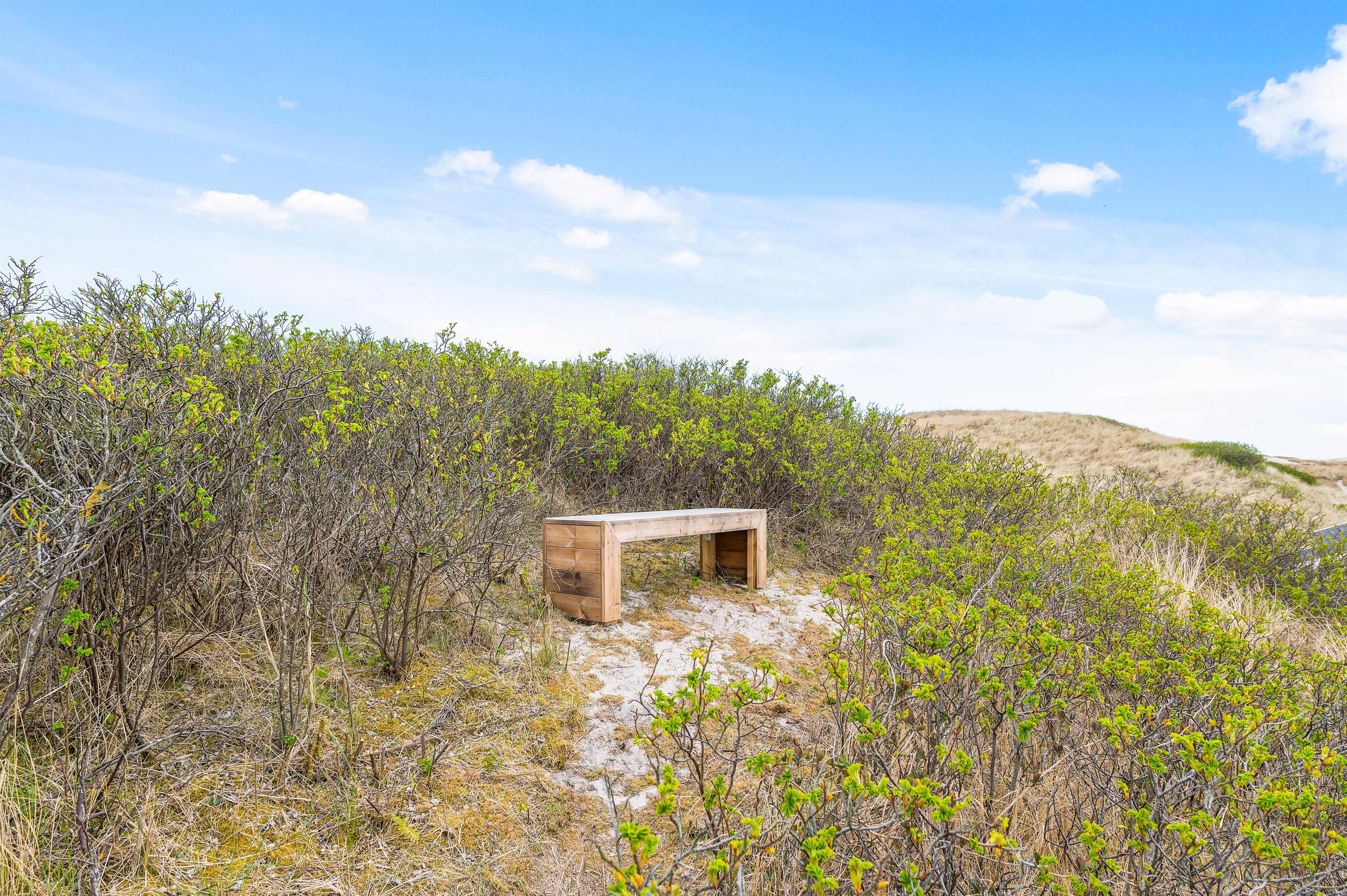 The outdoor area features a wrap-around wooden terrace with numerous seating areas for enjoying the sun right by the dunes. After sunbathing on the beach, an outdoor shower on the side of the house provides the perfect cool-down. A special feature is a wooden bench set in the dunes offering fantastic views over the holiday region.