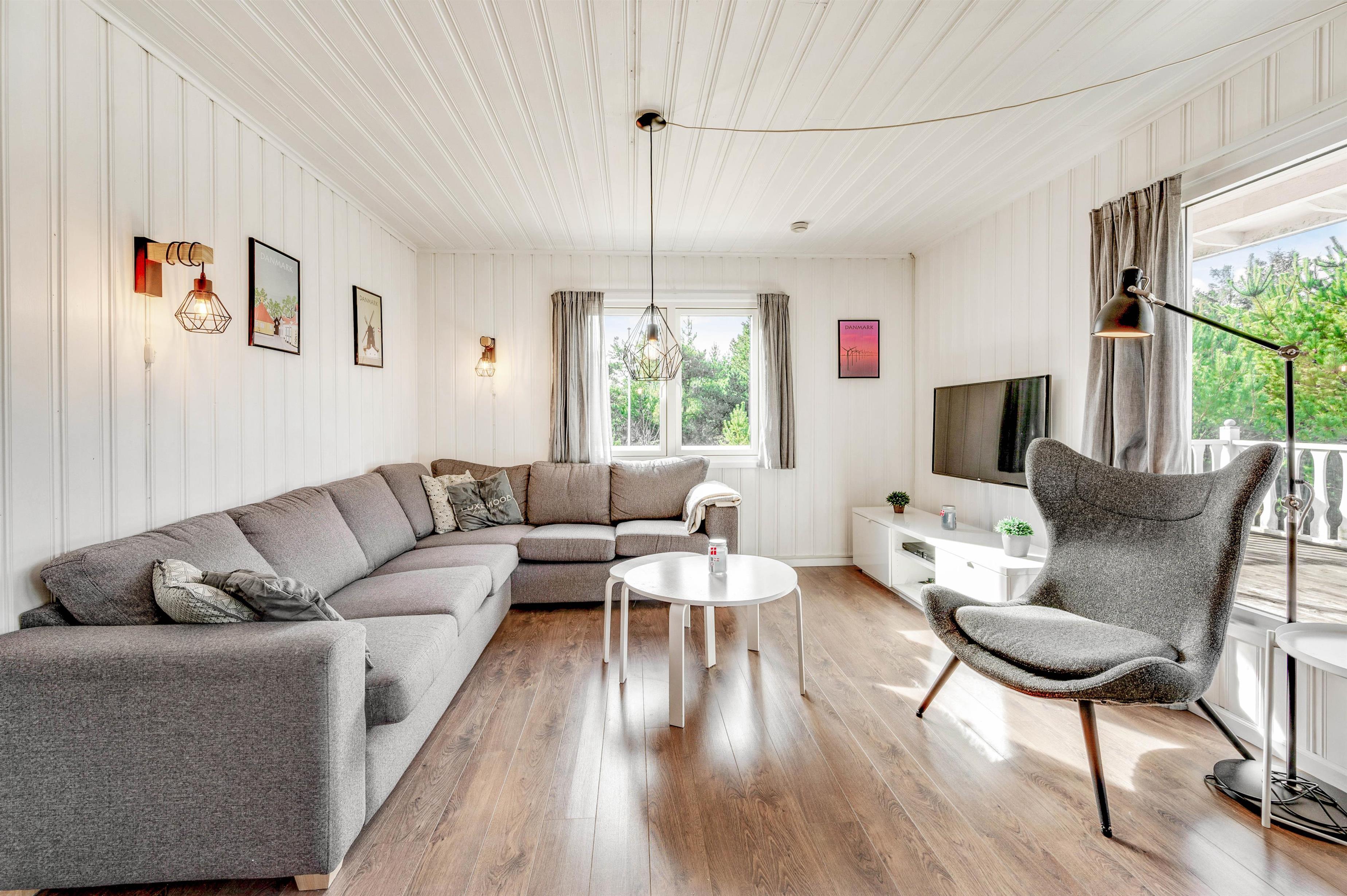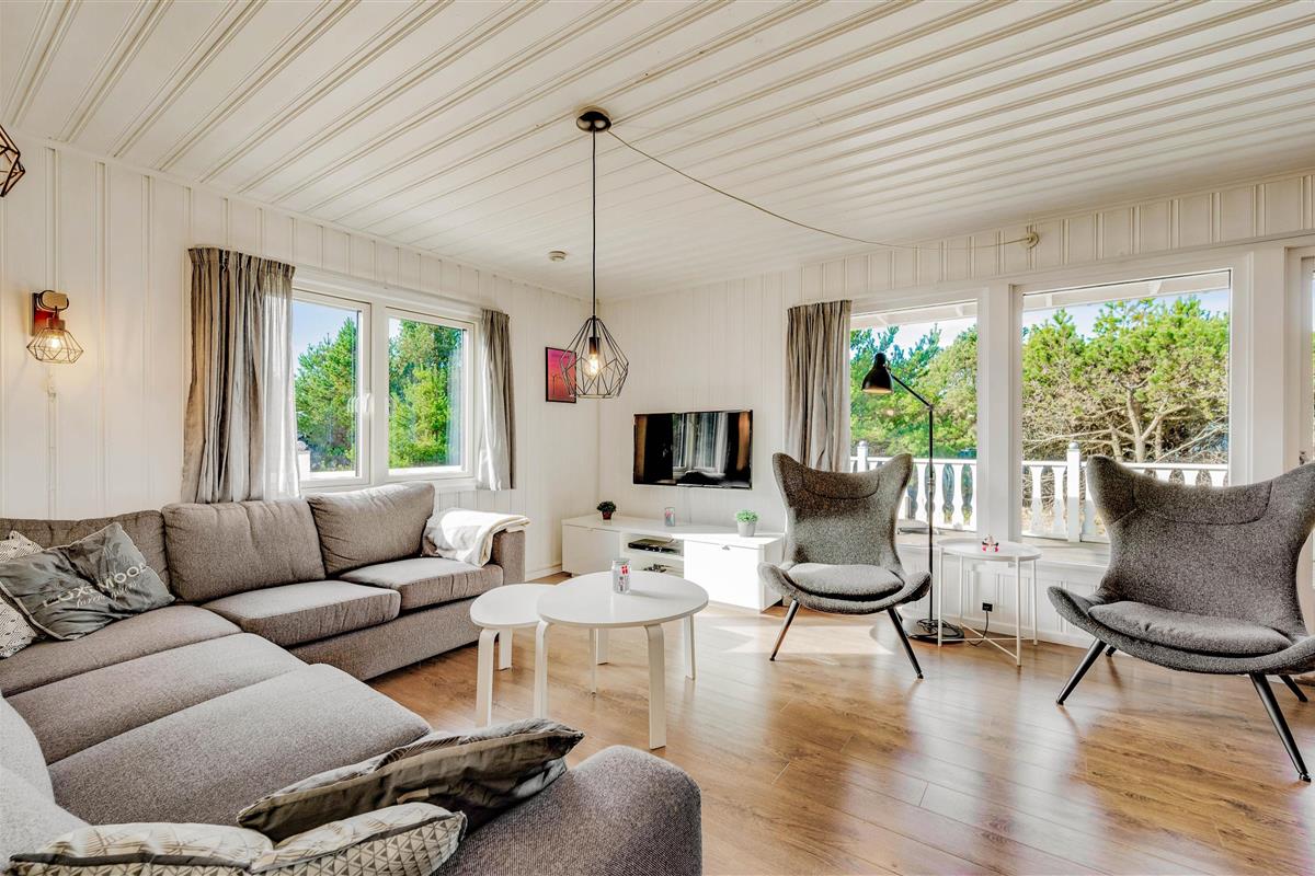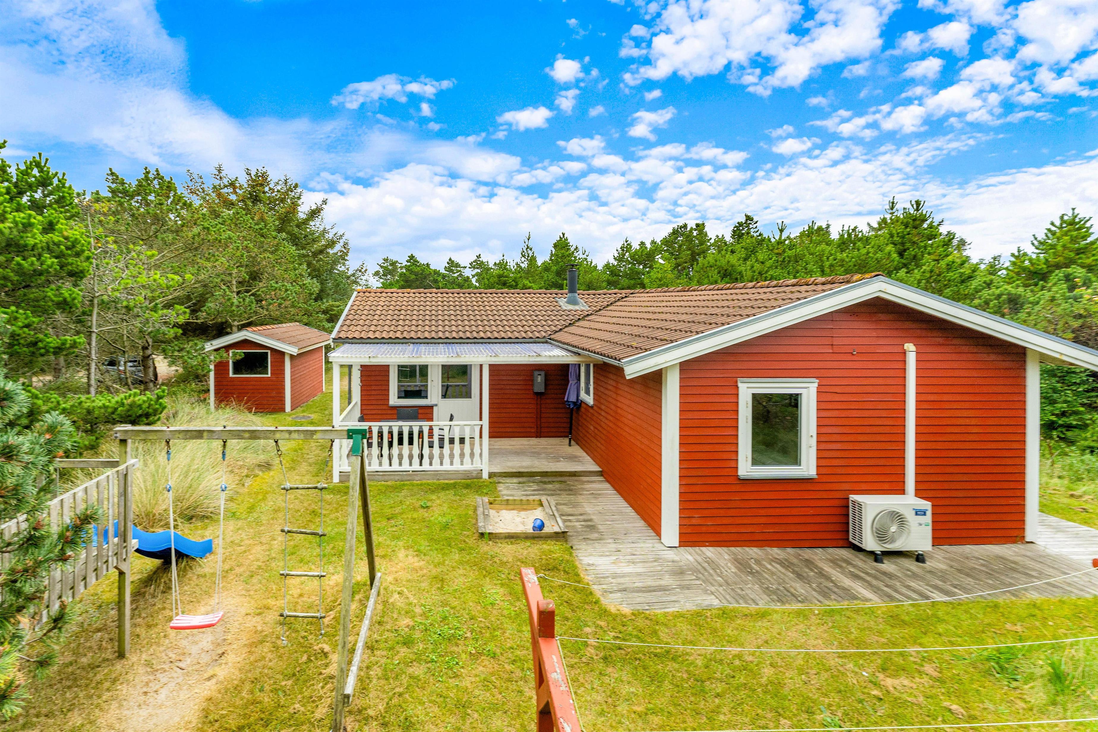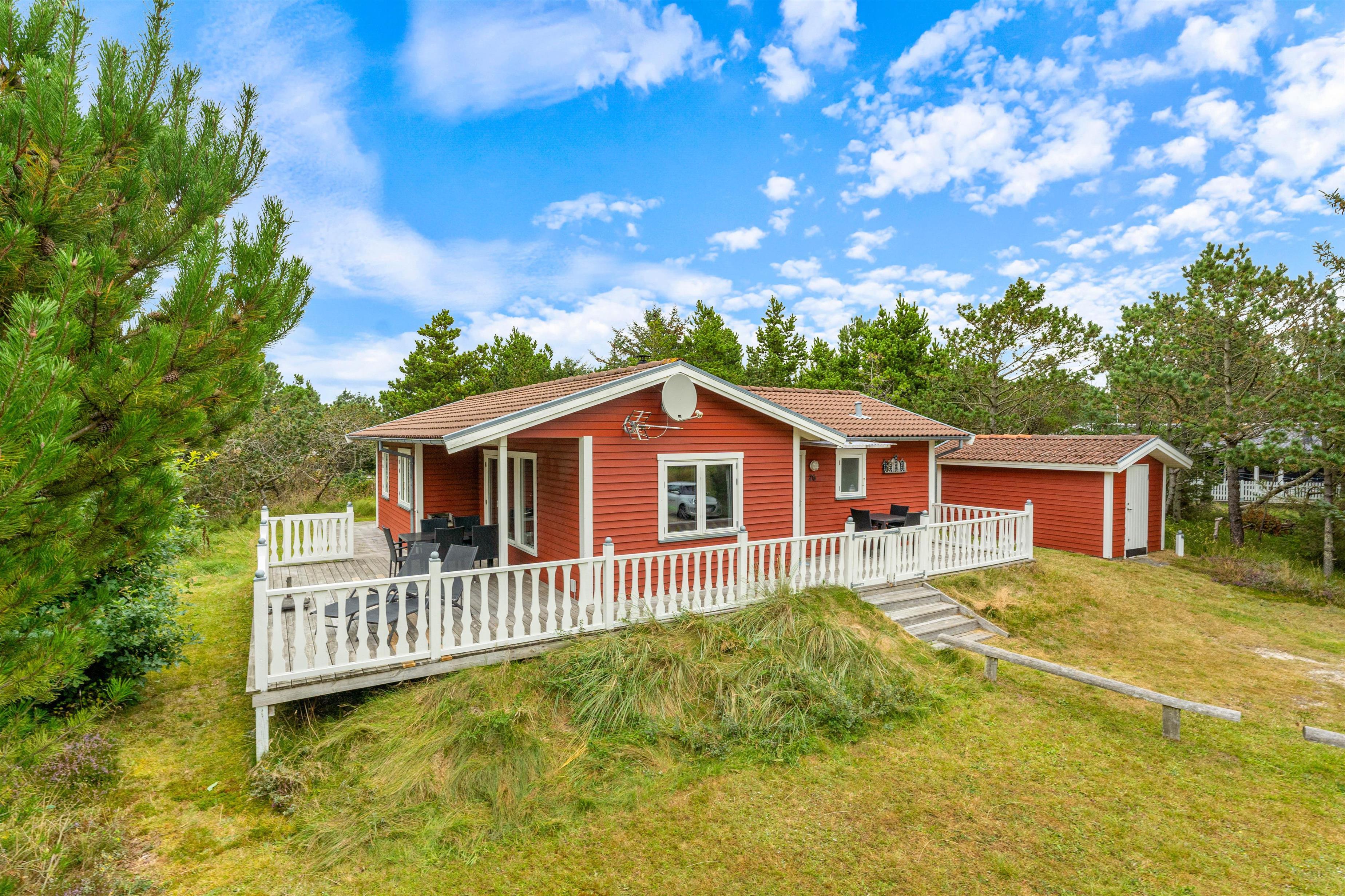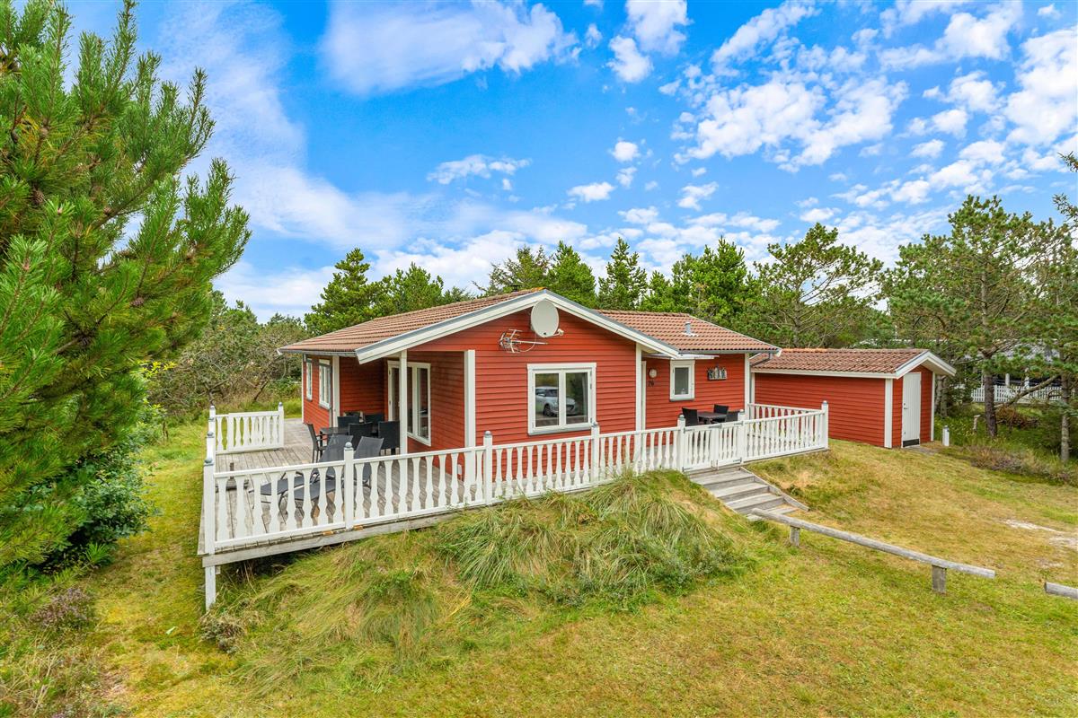 Discover this charming holiday home on the Danish west coast, located at Humlegårdsvej 26. With a comfortable living space of 77 square metres, it accommodates up to 6 guests and invites you to enjoy the cosy wood-burning stove. Beautiful terrace areas complement the welcoming atmosphere of this holiday home, ensuring a relaxing holiday.