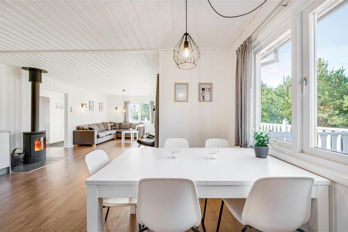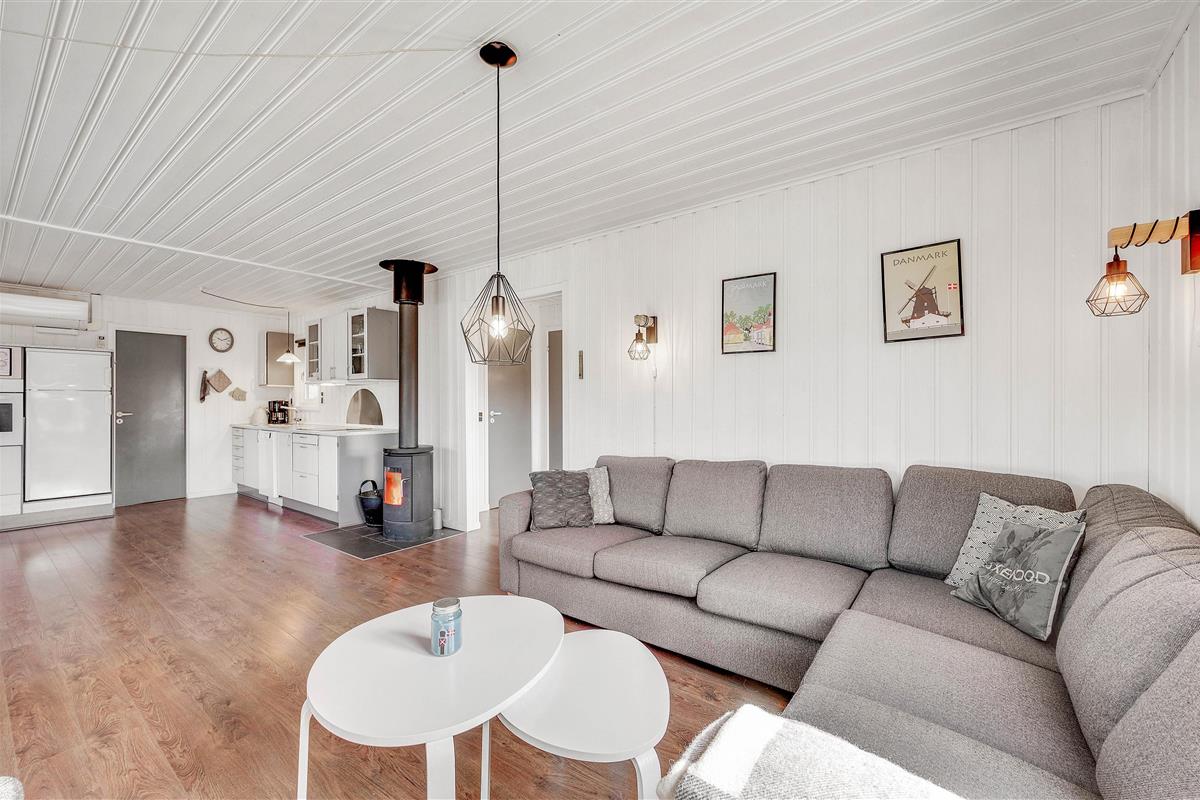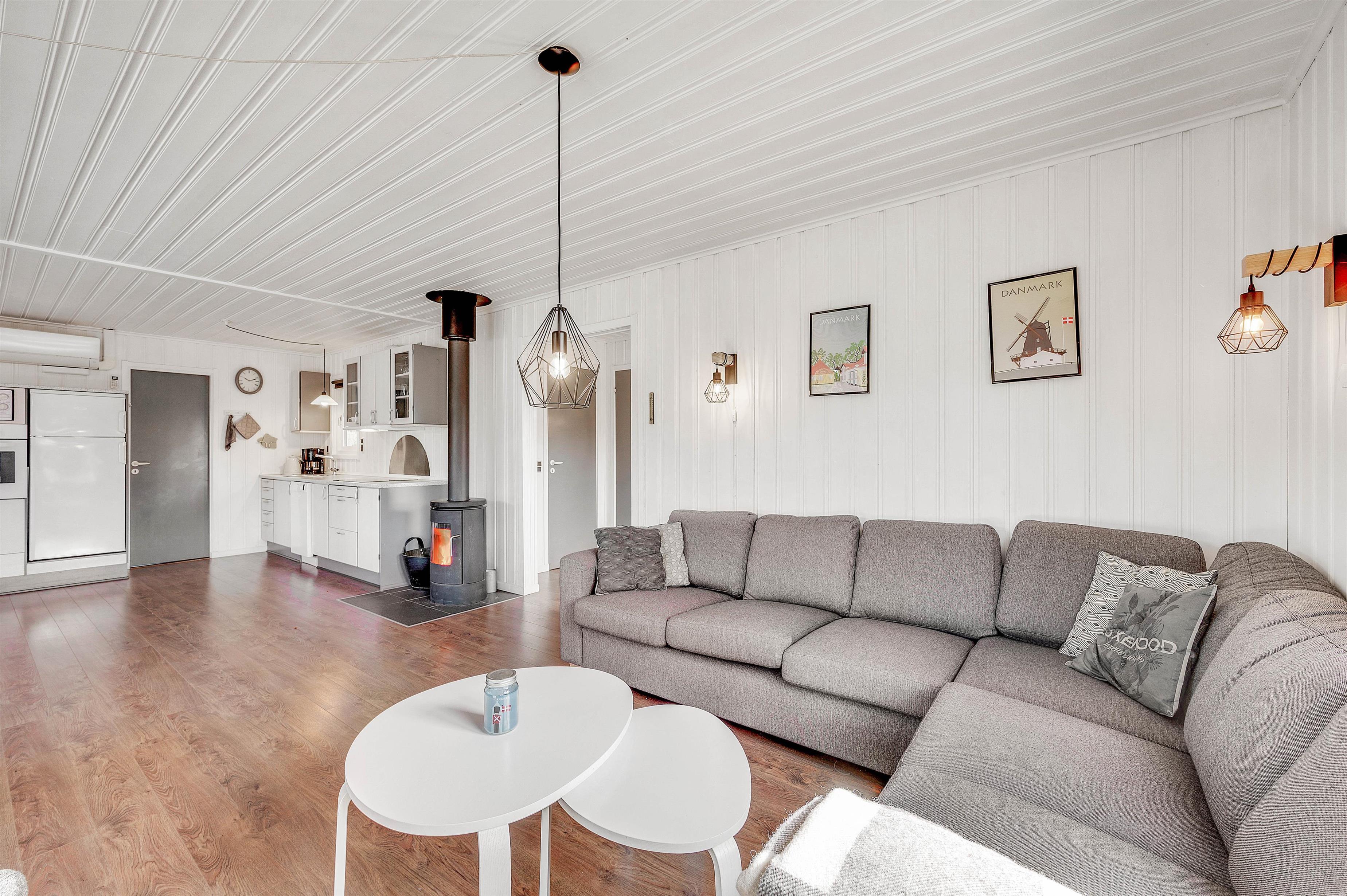 Authentic holiday home atmosphere with wood-burning stove and open-plan living area at Humlegårdsvej 26