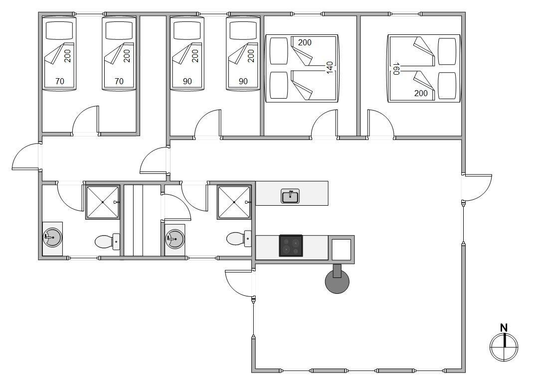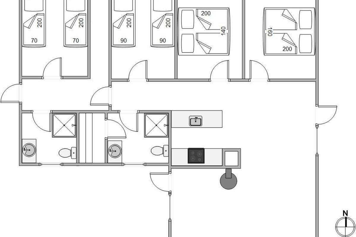 Enter this bright holiday home through the hallway, with space for coats and shoes. On one side are all four bedrooms with comfortable beds. There are two double bedrooms and two rooms with twin beds, offering flexible sleeping arrangements. On the other side are two well-maintained bathrooms with underfloor heating and shower facilities.