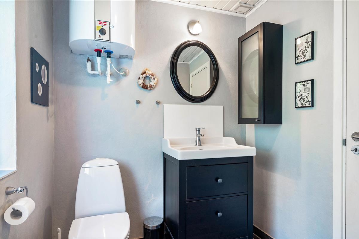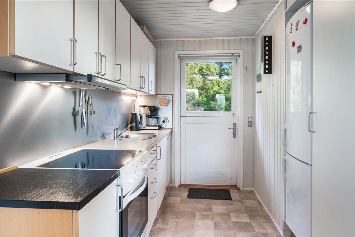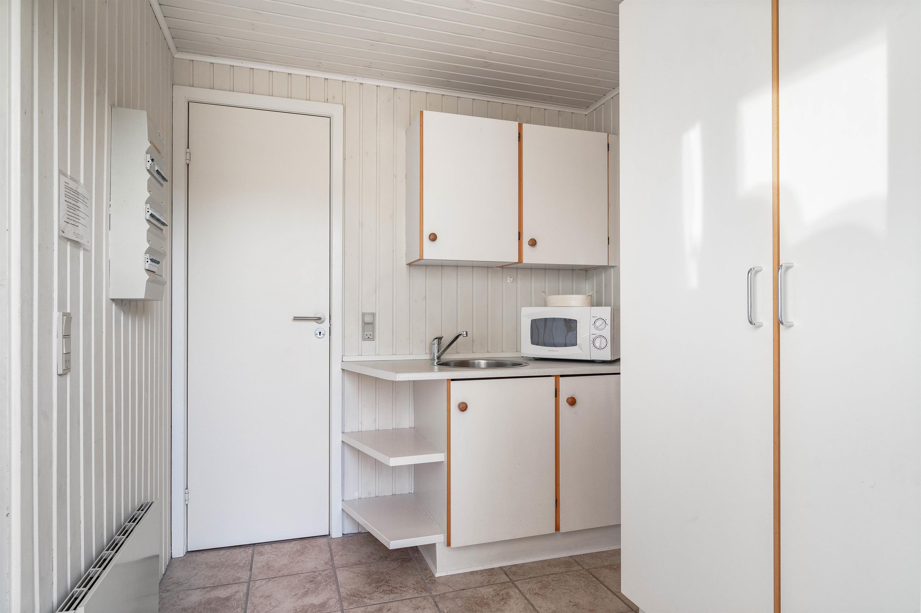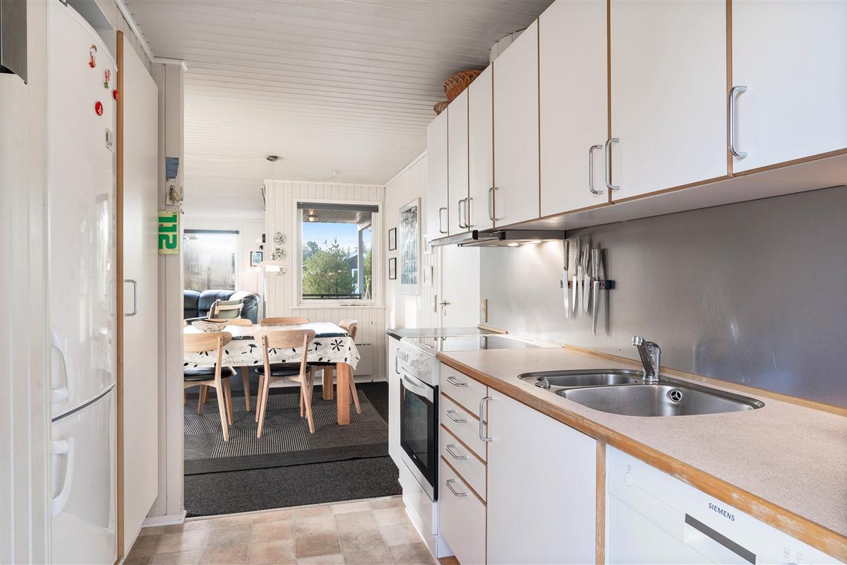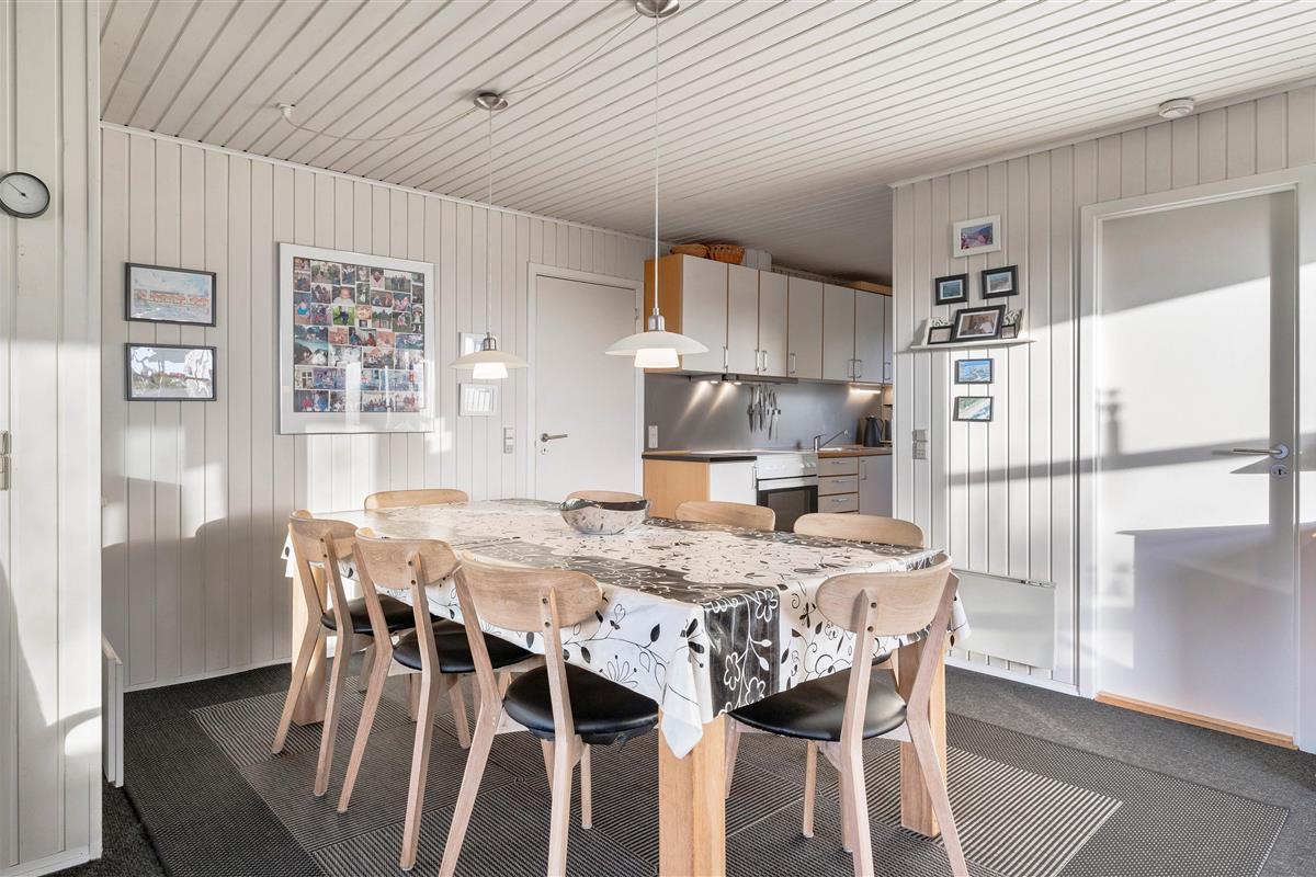 Upon entering the house, you're immediately struck by the bright living room and dining area with its wooden walls, beautiful furnishings and cosy wood-burning stove. Natural light floods through the large windows, creating a pleasant atmosphere in the living area. From the living room, past the large dining table, you'll find the open-plan kitchen, equipped with a dishwasher and microwave.