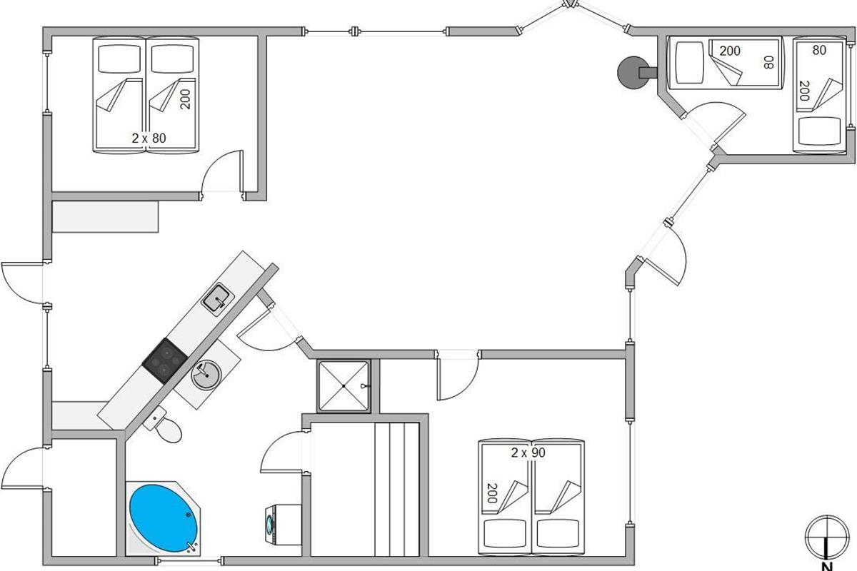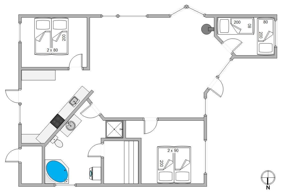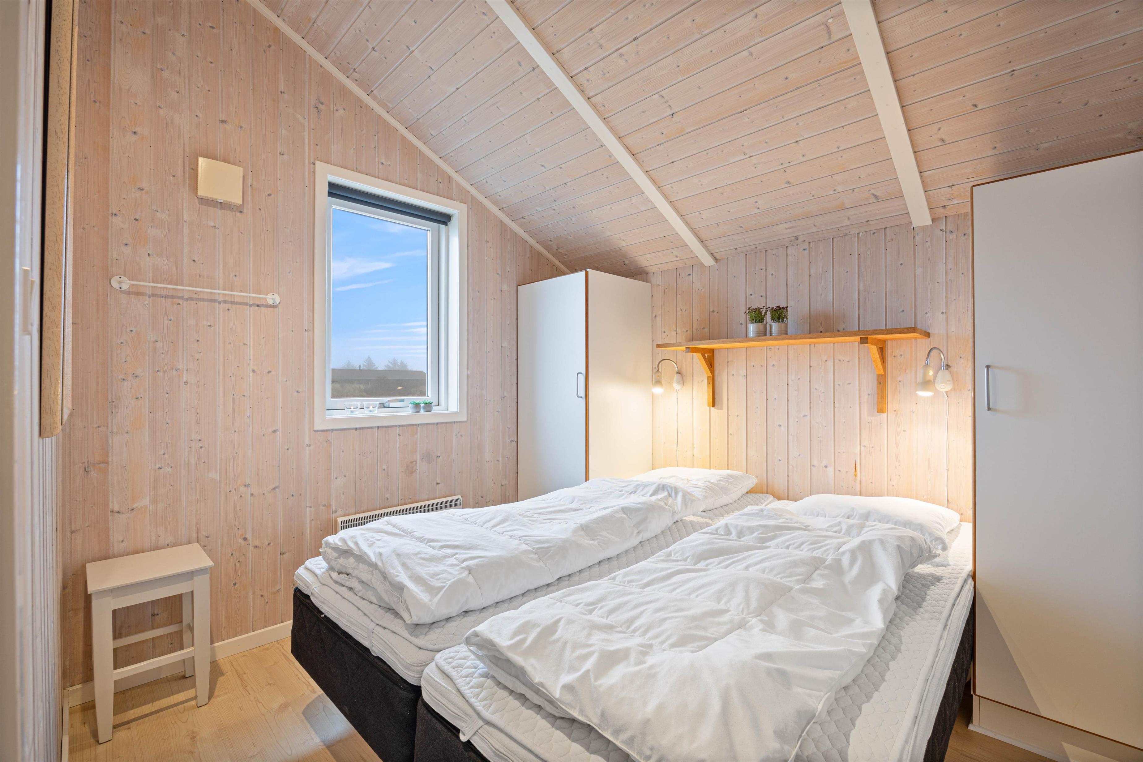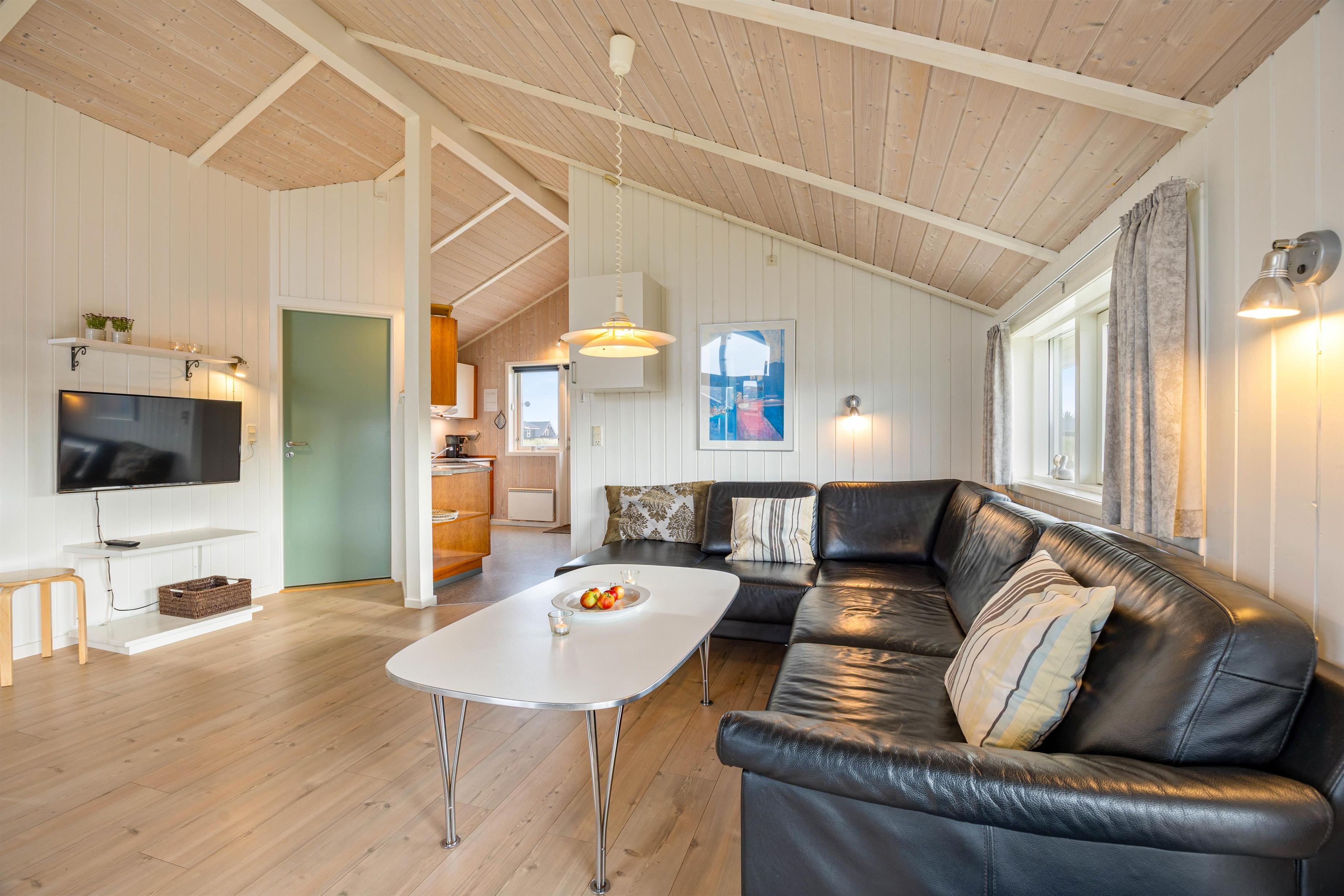 The 77 square metres of living space are arranged in classic Danish holiday home style, with a practical layout centred around the living area. All other rooms are accessible from here. The three bedrooms are positioned in different corners, ensuring peaceful sleep for everyone. You can spread out between two comfortable double bedrooms and a small bedroom with two single beds.