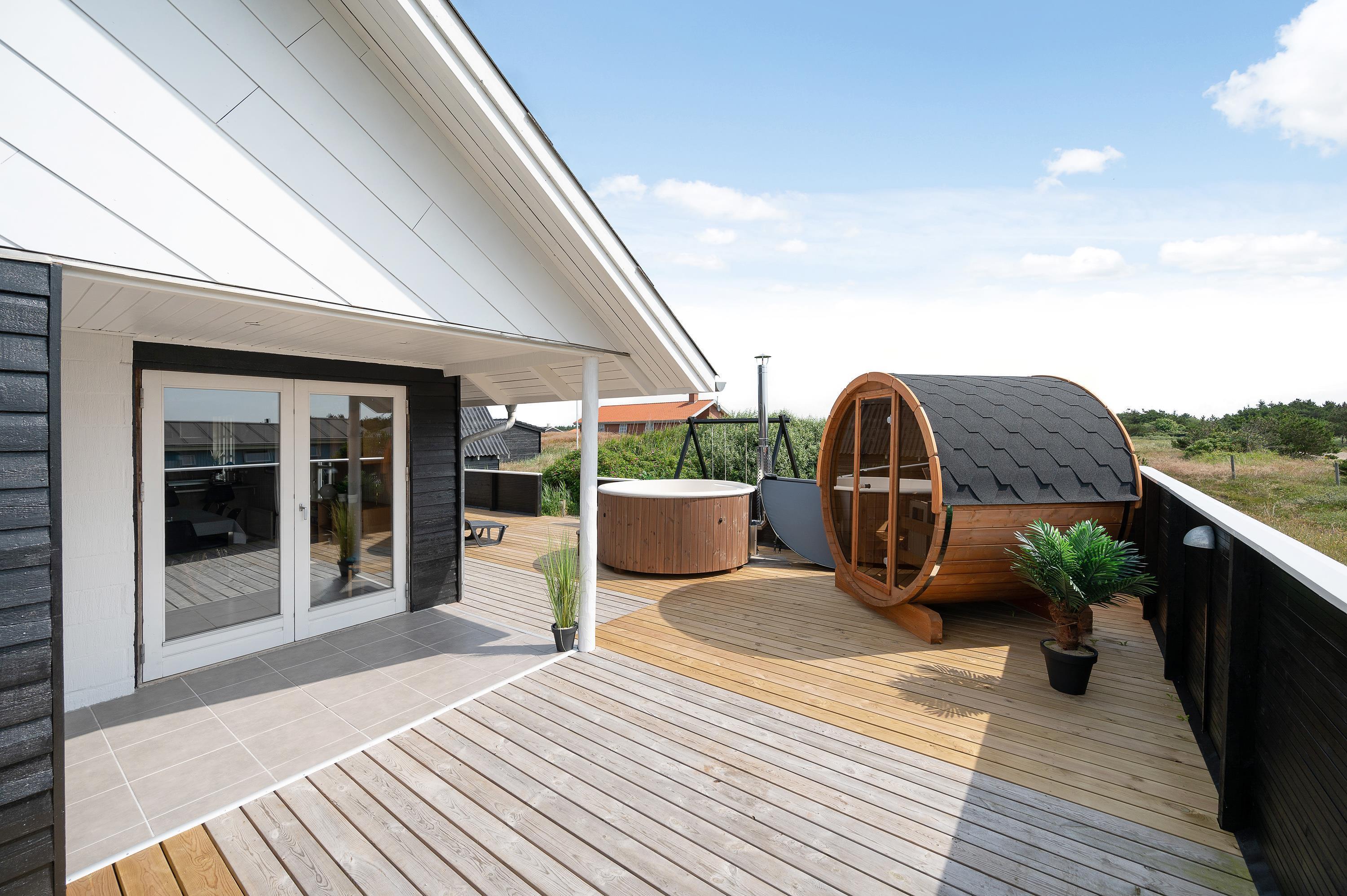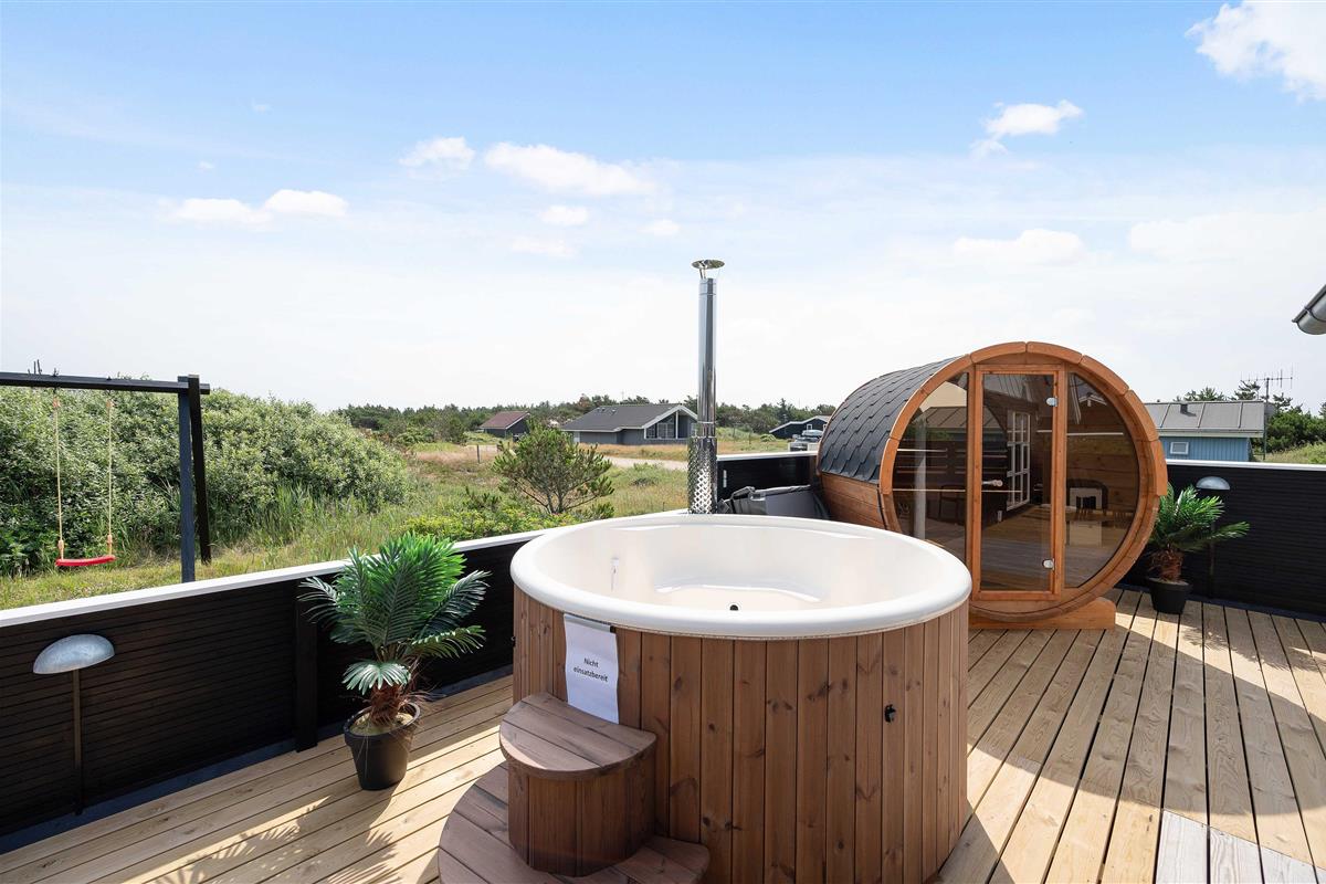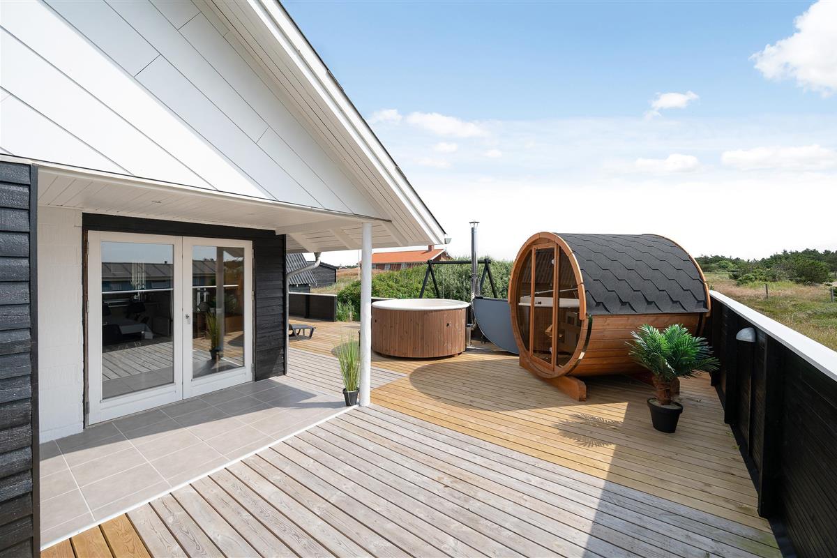 After an eventful day, unwind in the outdoor sauna on the terrace. Afterwards, relax in the hot tub while watching the colourful sunset over the Bjerregård dunes, perhaps with a refreshing glass of wine.