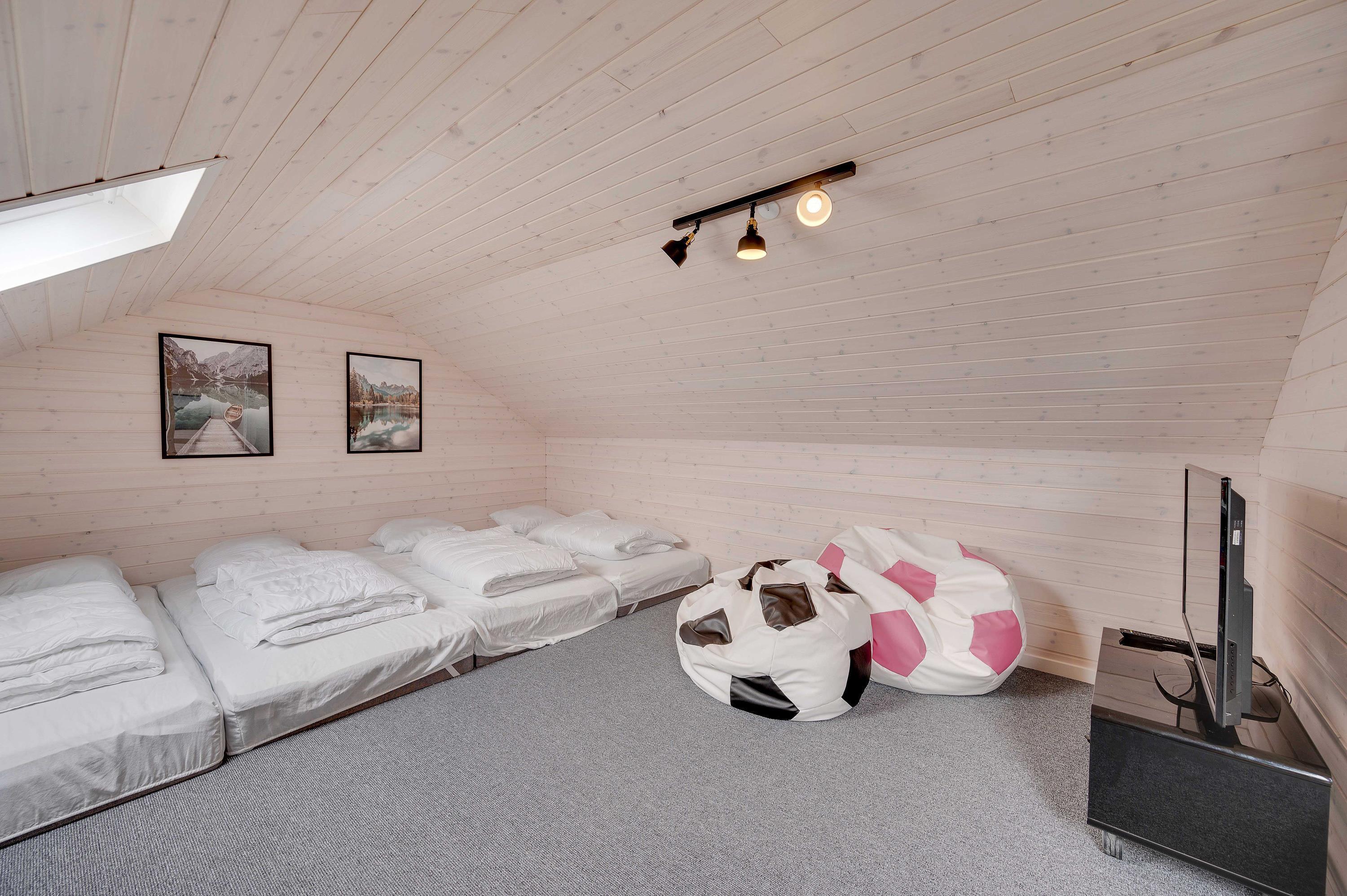 The open-plan kitchen leads directly to the large dining table - perfect for family game nights. For younger guests, there's a mezzanine play area to climb up to, complete with its own television.