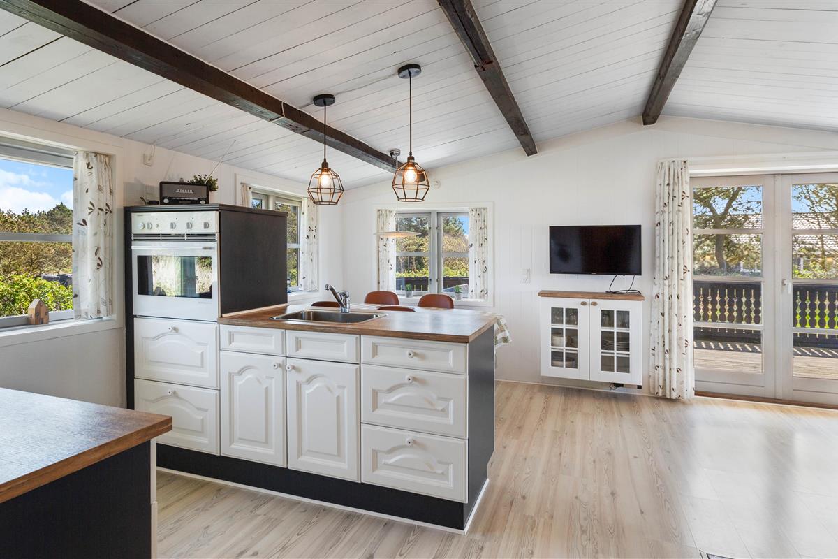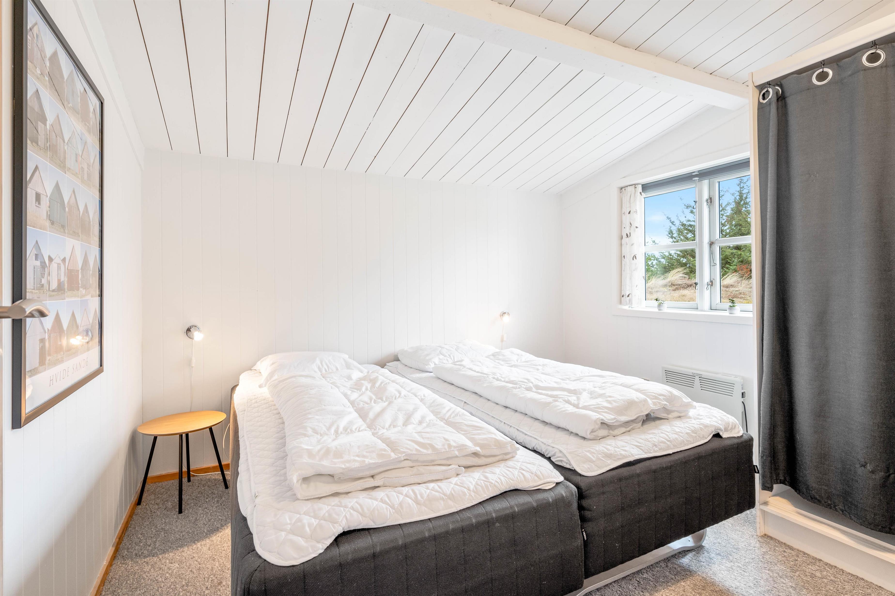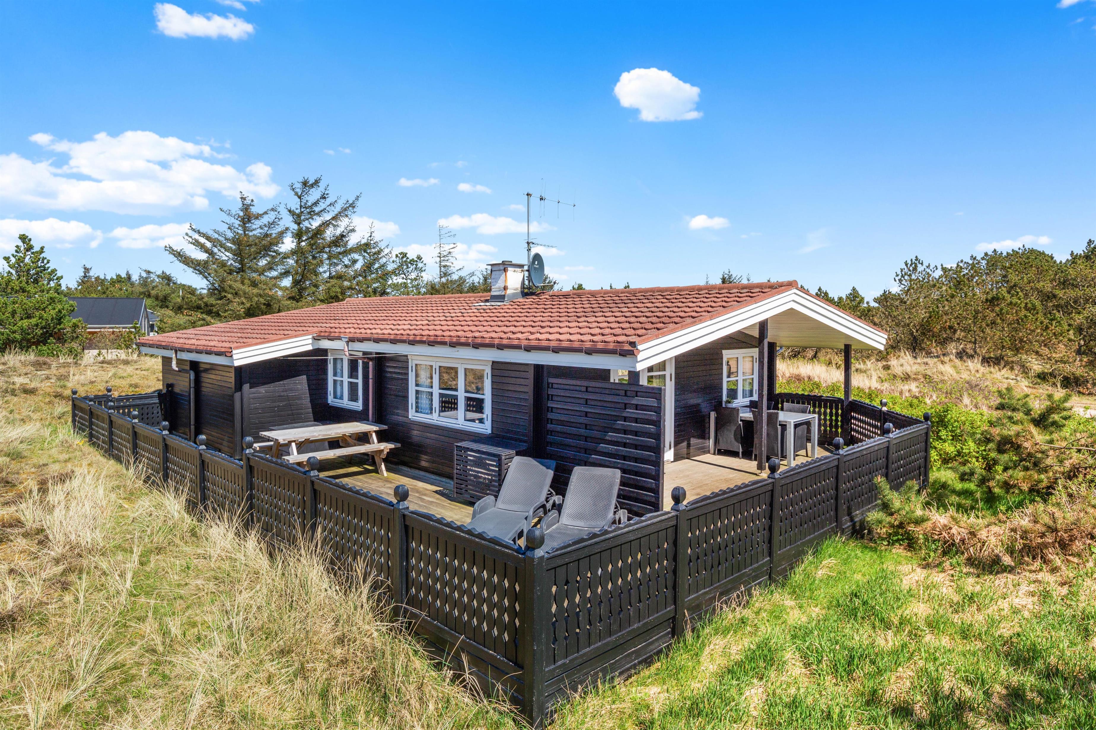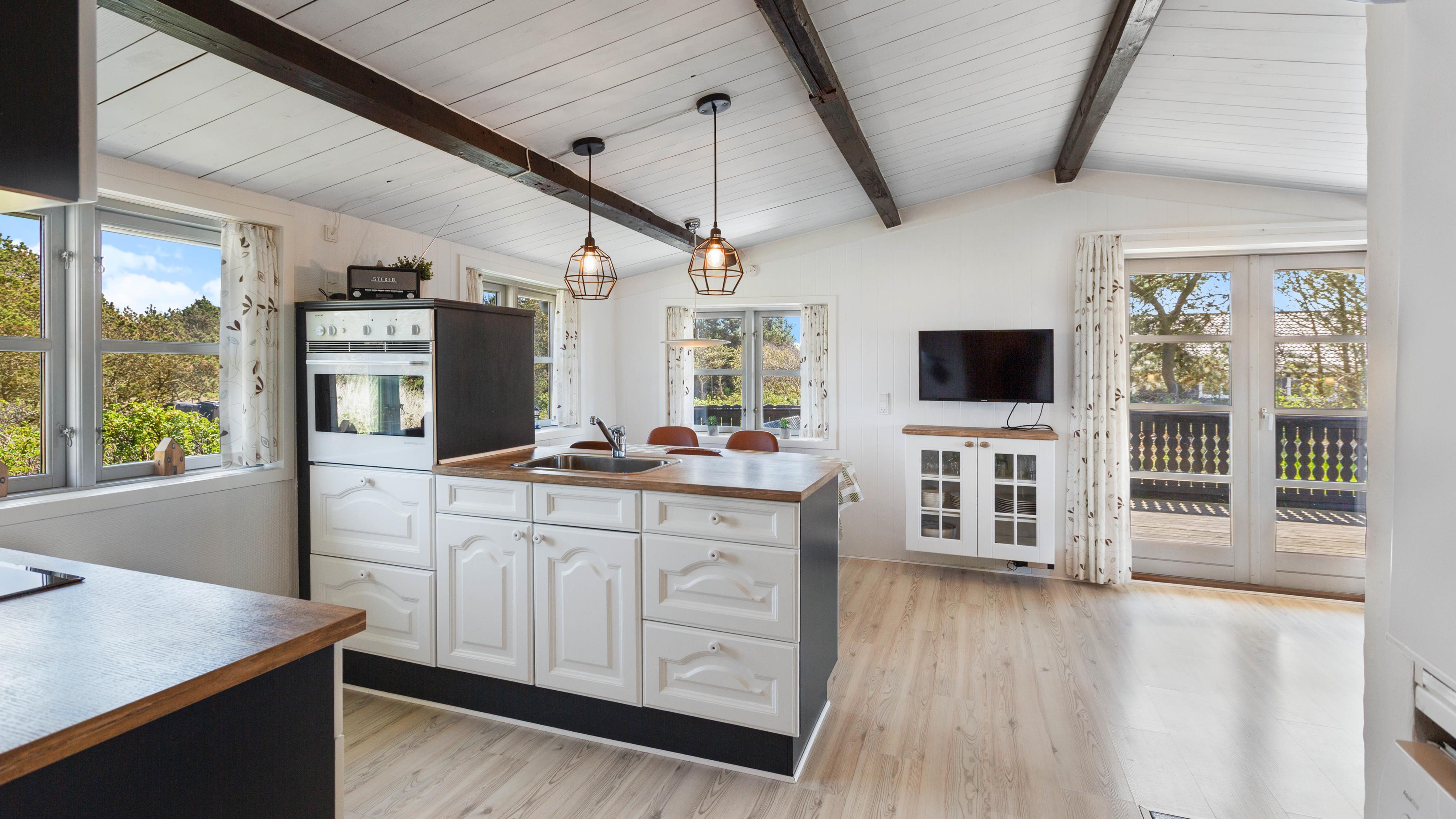 This welcoming holiday home has been built in typical Scandinavian style. Inside, you'll find bright wood panelling and exposed roof beams that contribute to the harmonious overall impression. The practical layout separates the living and sleeping areas. The sleeping area comprises two bedrooms with comfortable double beds and one bedroom with a single bed.