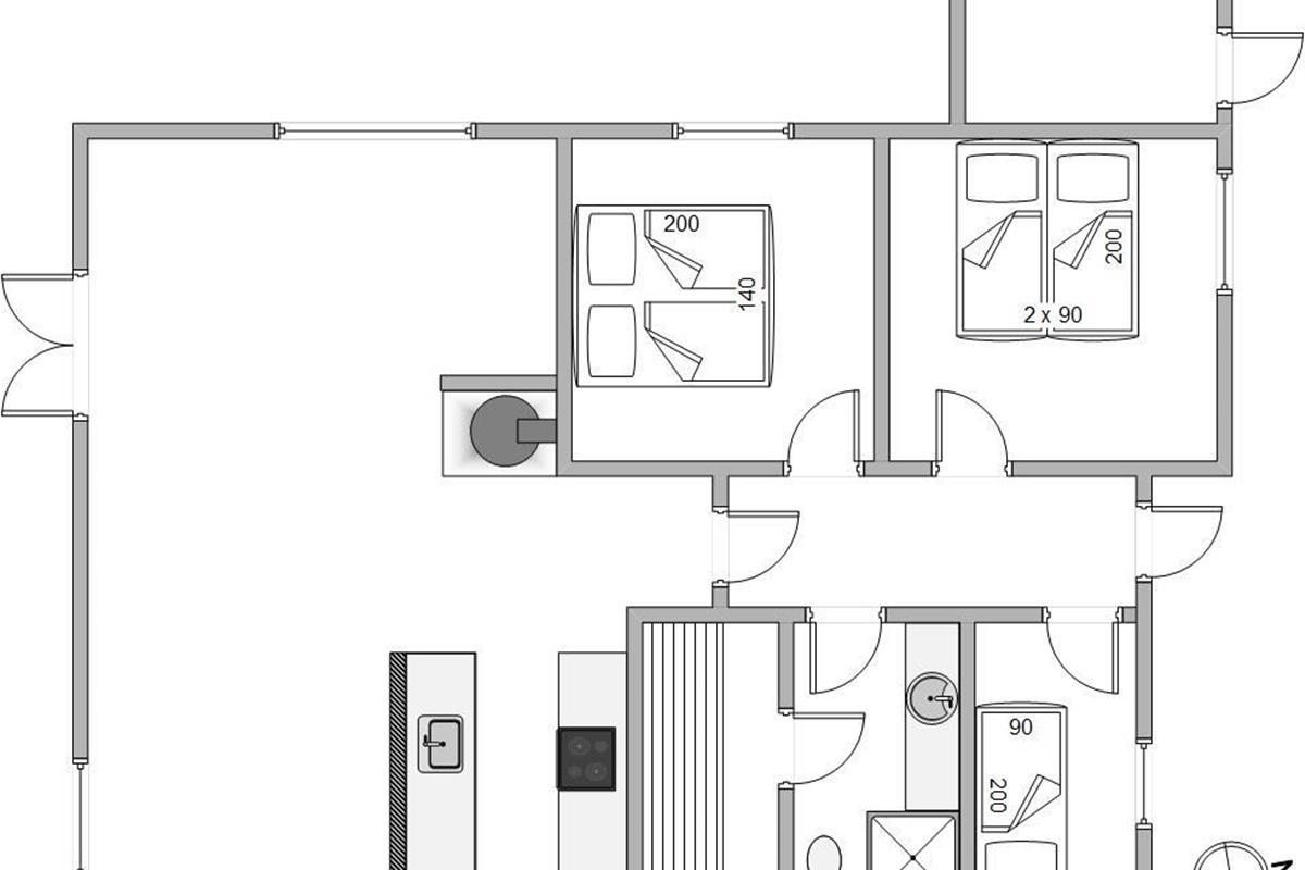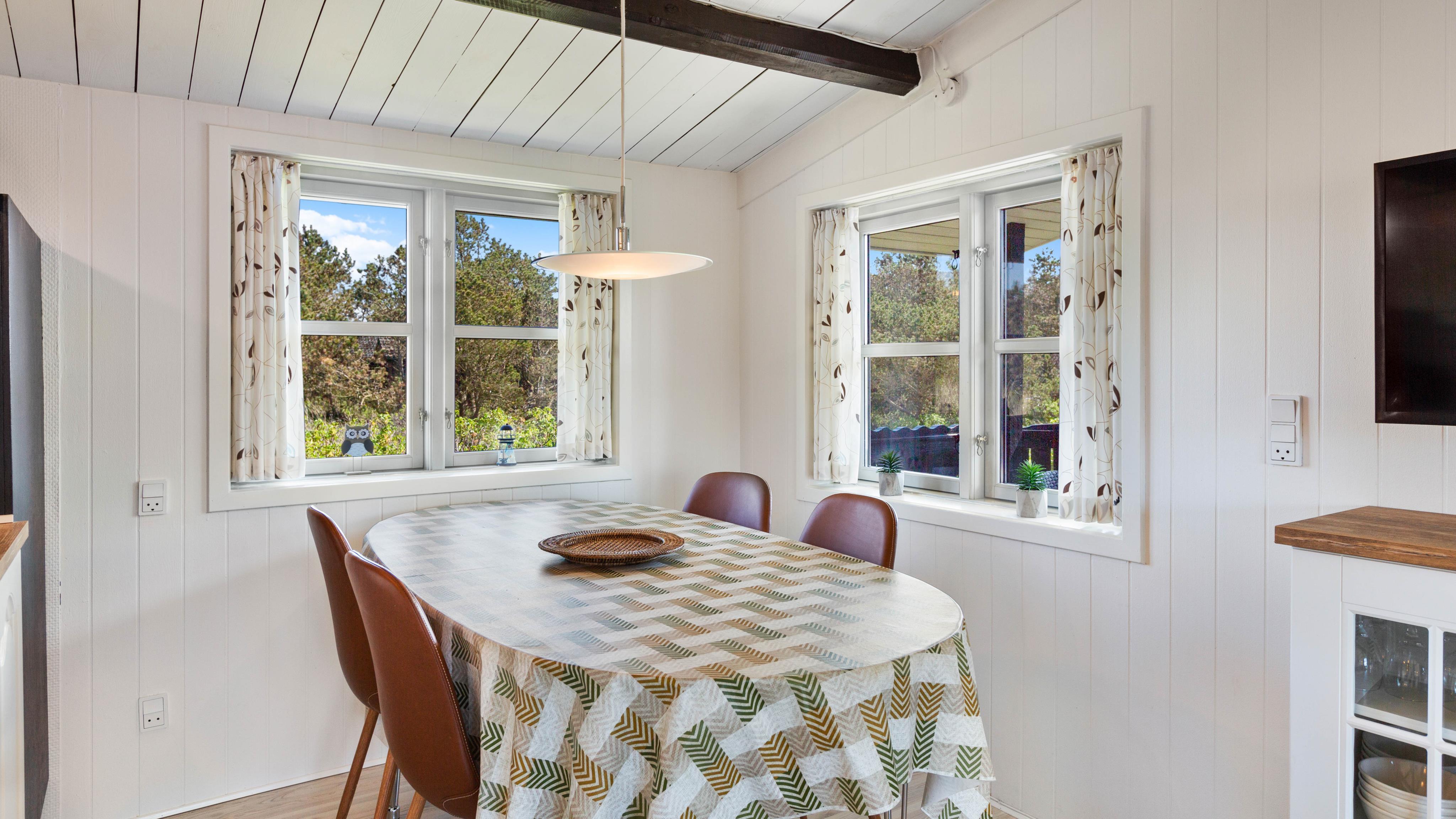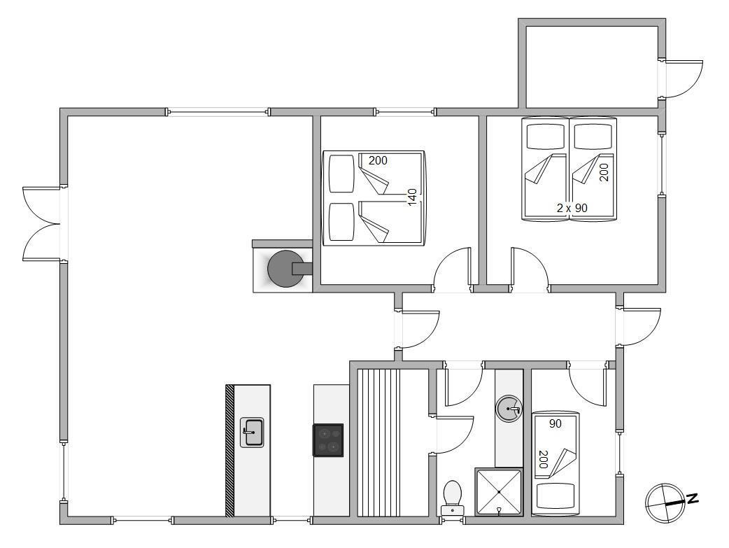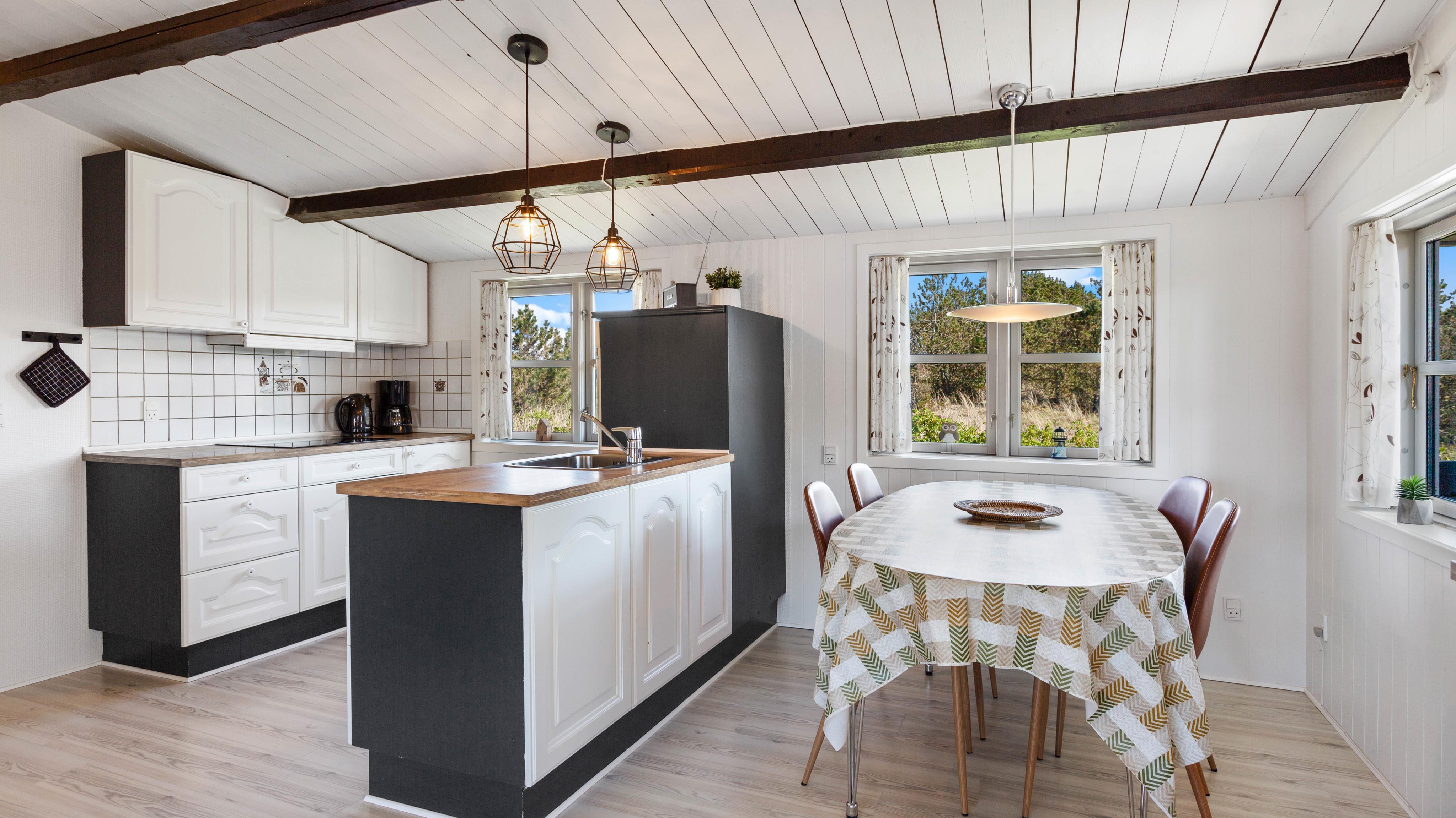 This welcoming holiday home has been built in typical Scandinavian style. Inside, you'll find bright wood panelling and exposed roof beams that contribute to the harmonious overall impression. The practical layout separates the living and sleeping areas. The sleeping area comprises two bedrooms with comfortable double beds and one bedroom with a single bed.