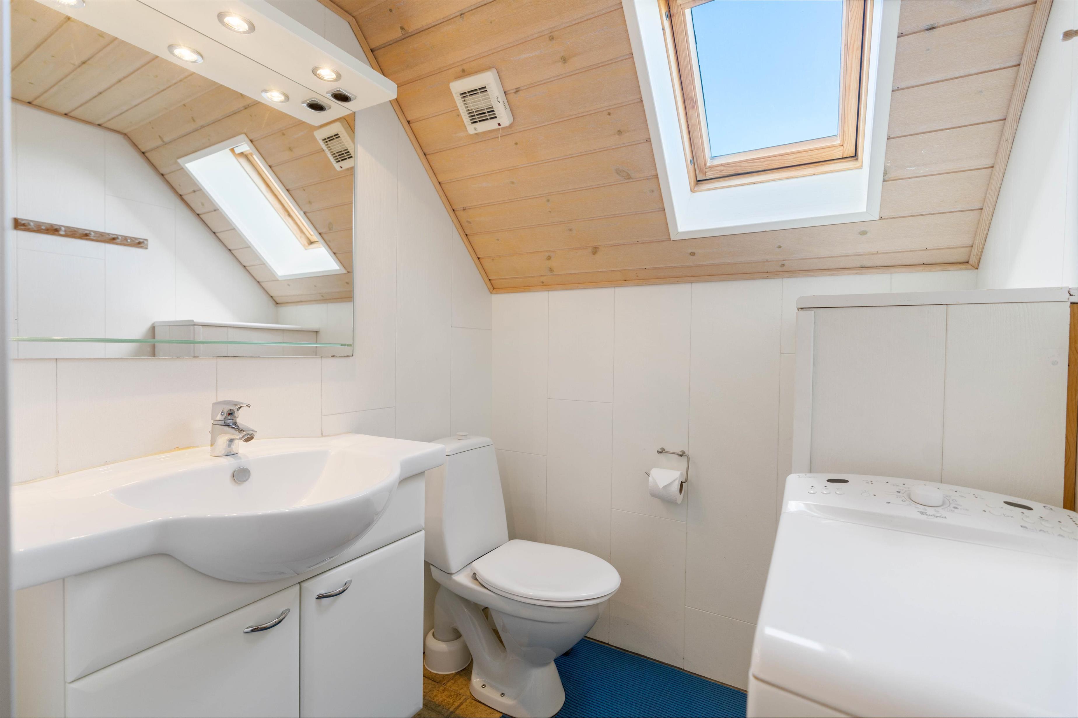 The open-plan kitchen includes a dishwasher and ample storage space for your holiday needs. A washing machine is also provided. The bathroom features a sauna and shower, plus practical underfloor heating.