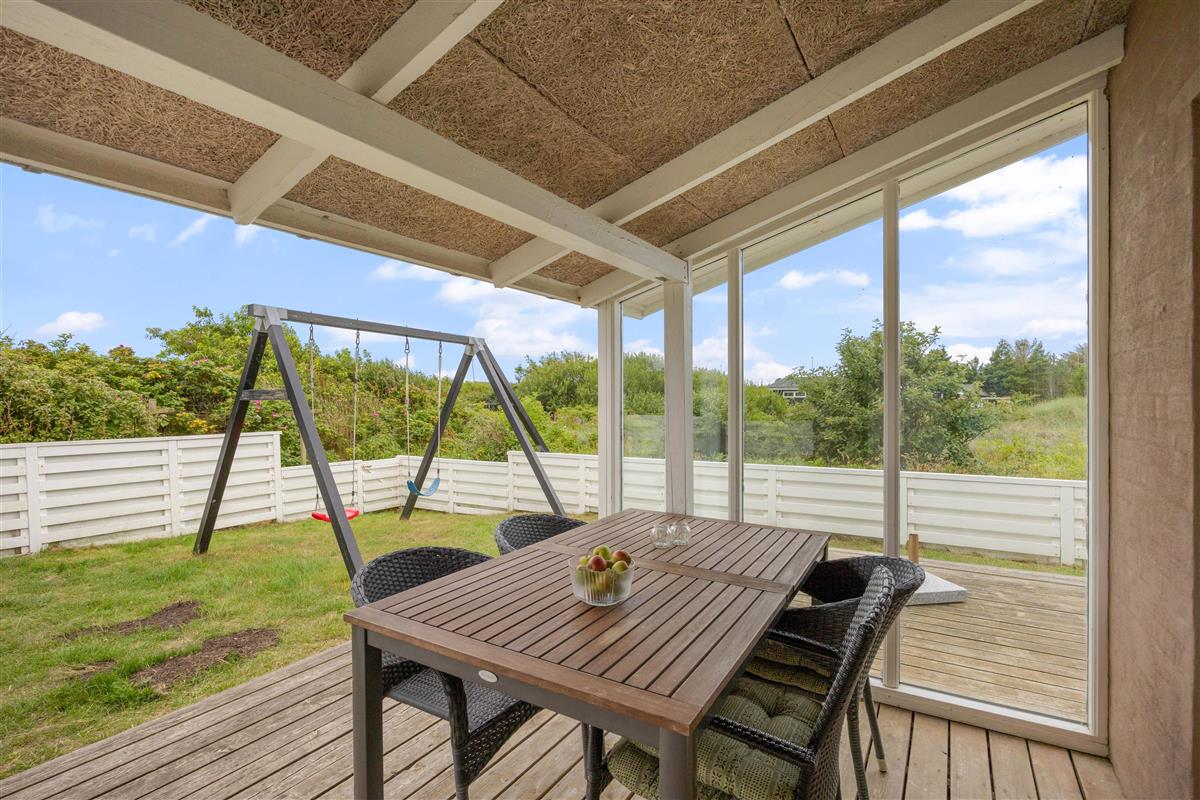 The 1,367-square-metre natural plot, including the terrace, is partially fenced, allowing your dogs to run freely. The southwest-facing terrace is partially covered, so you can enjoy the fresh sea air even during light showers. Relax with an evening glass of wine and a barbecue meal while watching the sun set behind the dunes.
