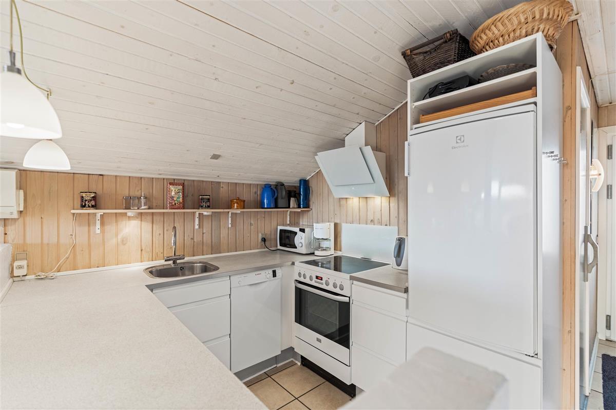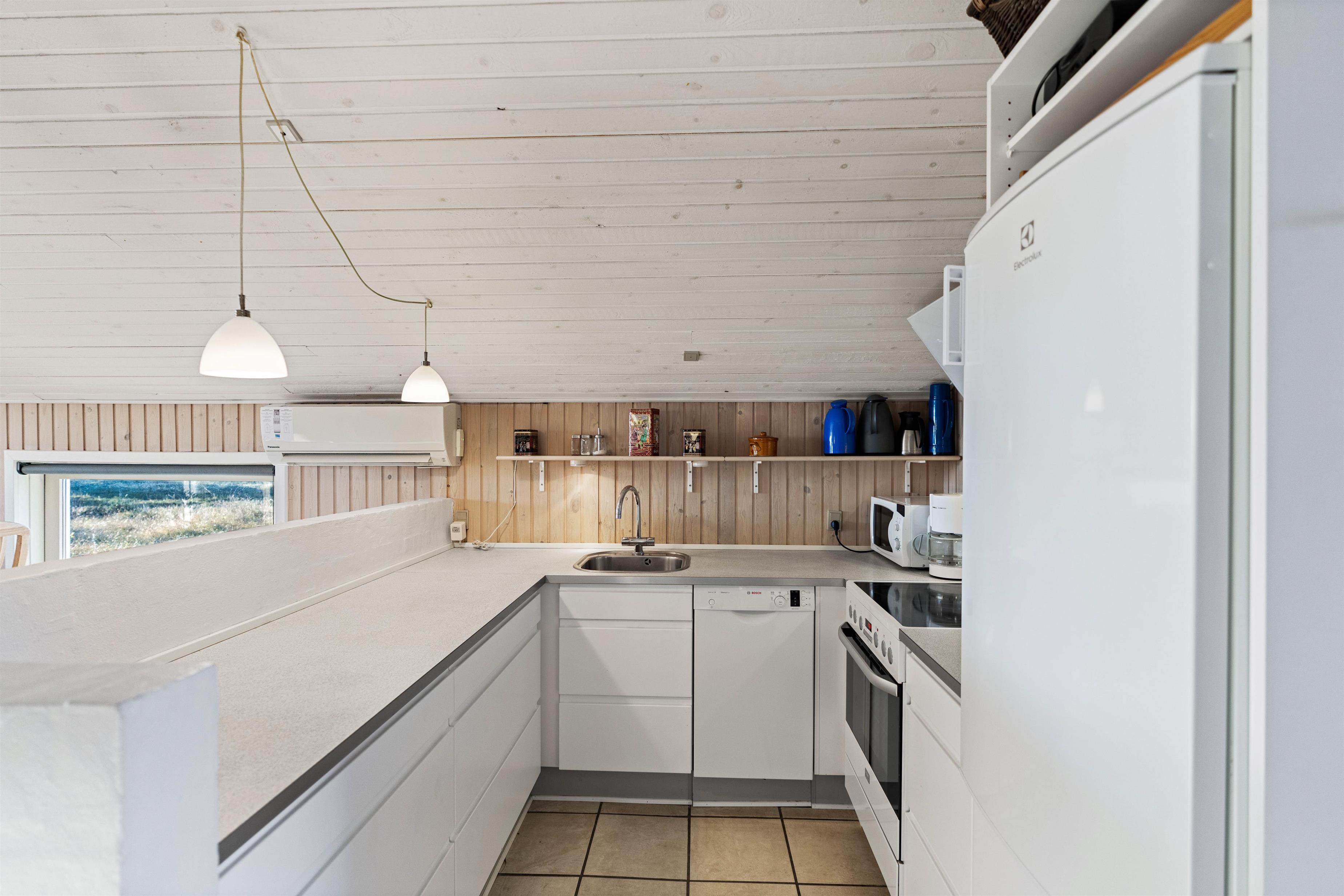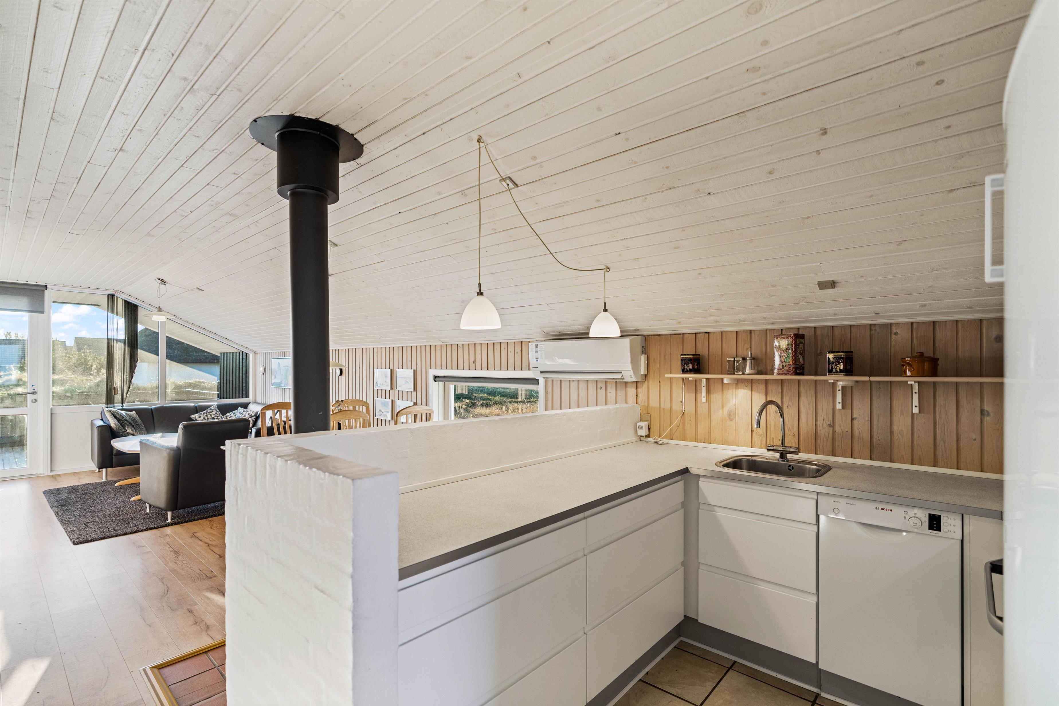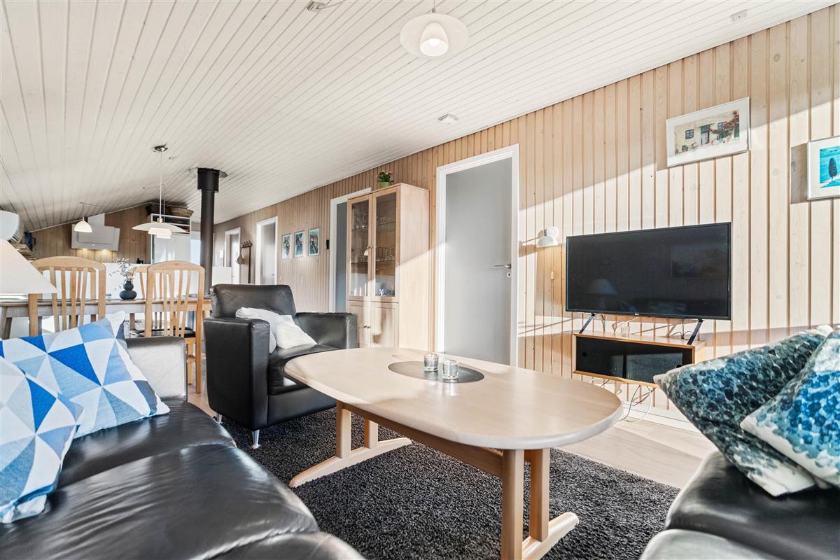 Upon entering the holiday home, you'll notice the thoughtfully coordinated furnishings. The typical Scandinavian style flows through all rooms. The spacious open-plan living and dining area with kitchen forms the heart of the home. The large window offers beautiful views of the greenery while you relax on the sofa, listening to the crackling of the fireplace. An energy-efficient heat pump is also available for heating.