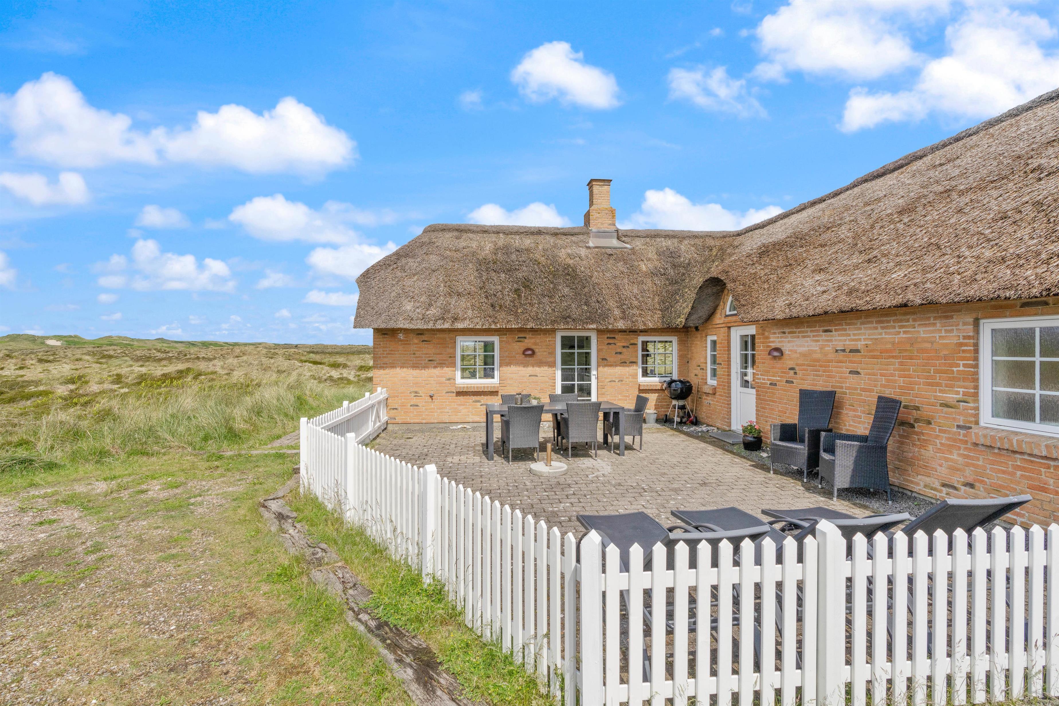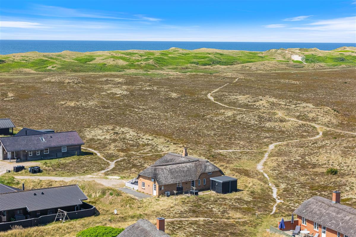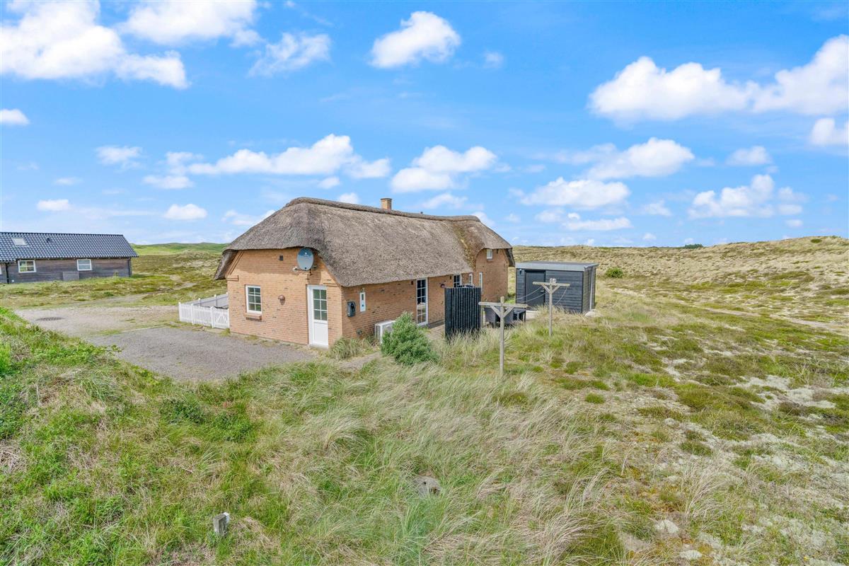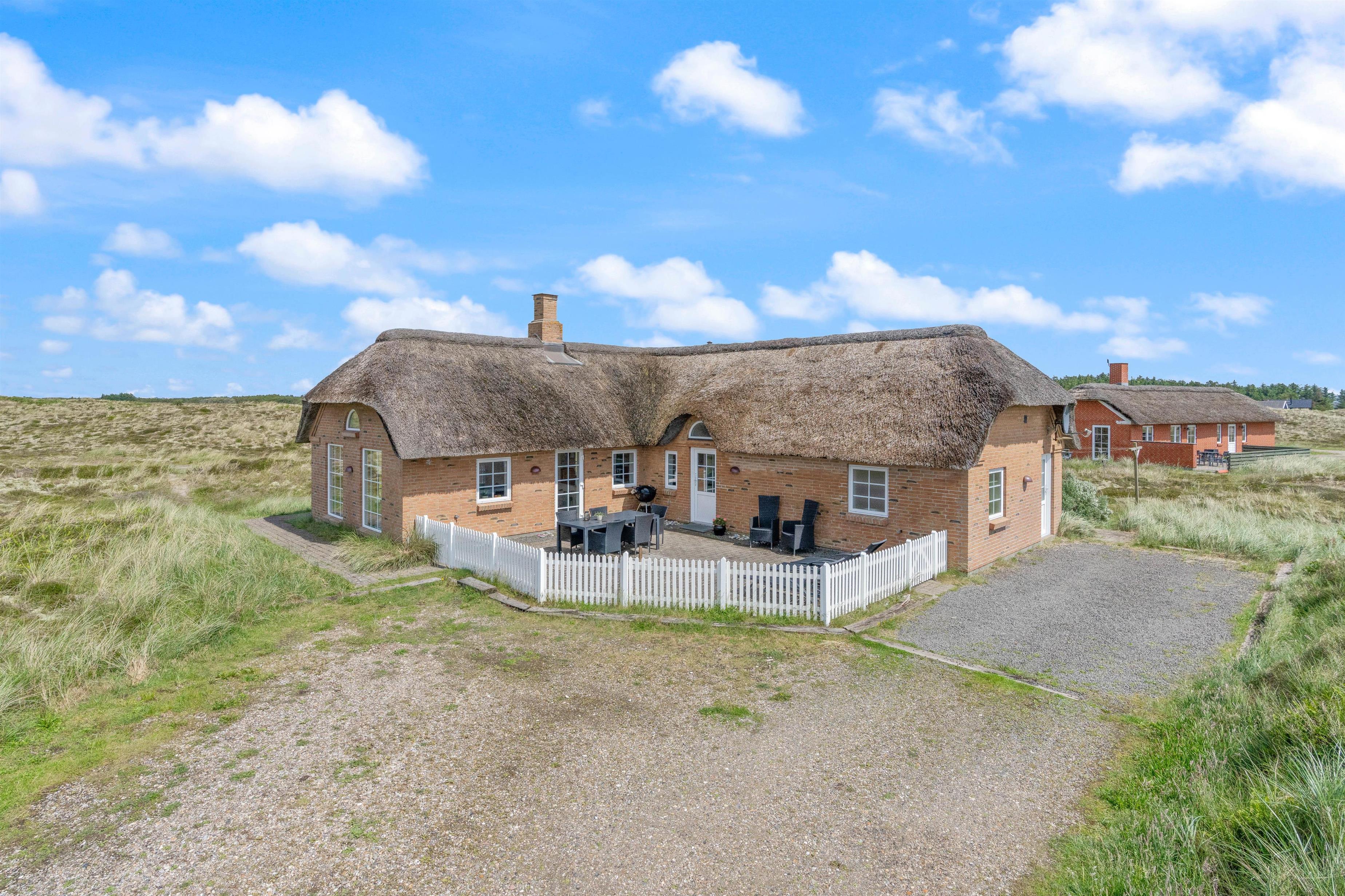 Located at Arvidvej 54, this holiday home successfully combines modern amenities with classic thatched roof architecture. The spacious living area forms the heart of this charming holiday home, featuring high ceilings and premium furnishings - a true haven of comfort. Large windows flood the interior with natural light, offering unique panoramic views across the heathland.