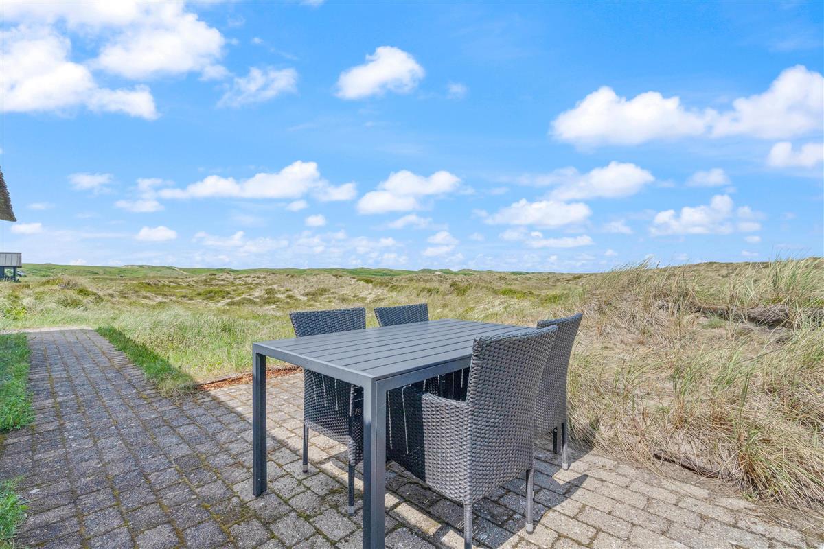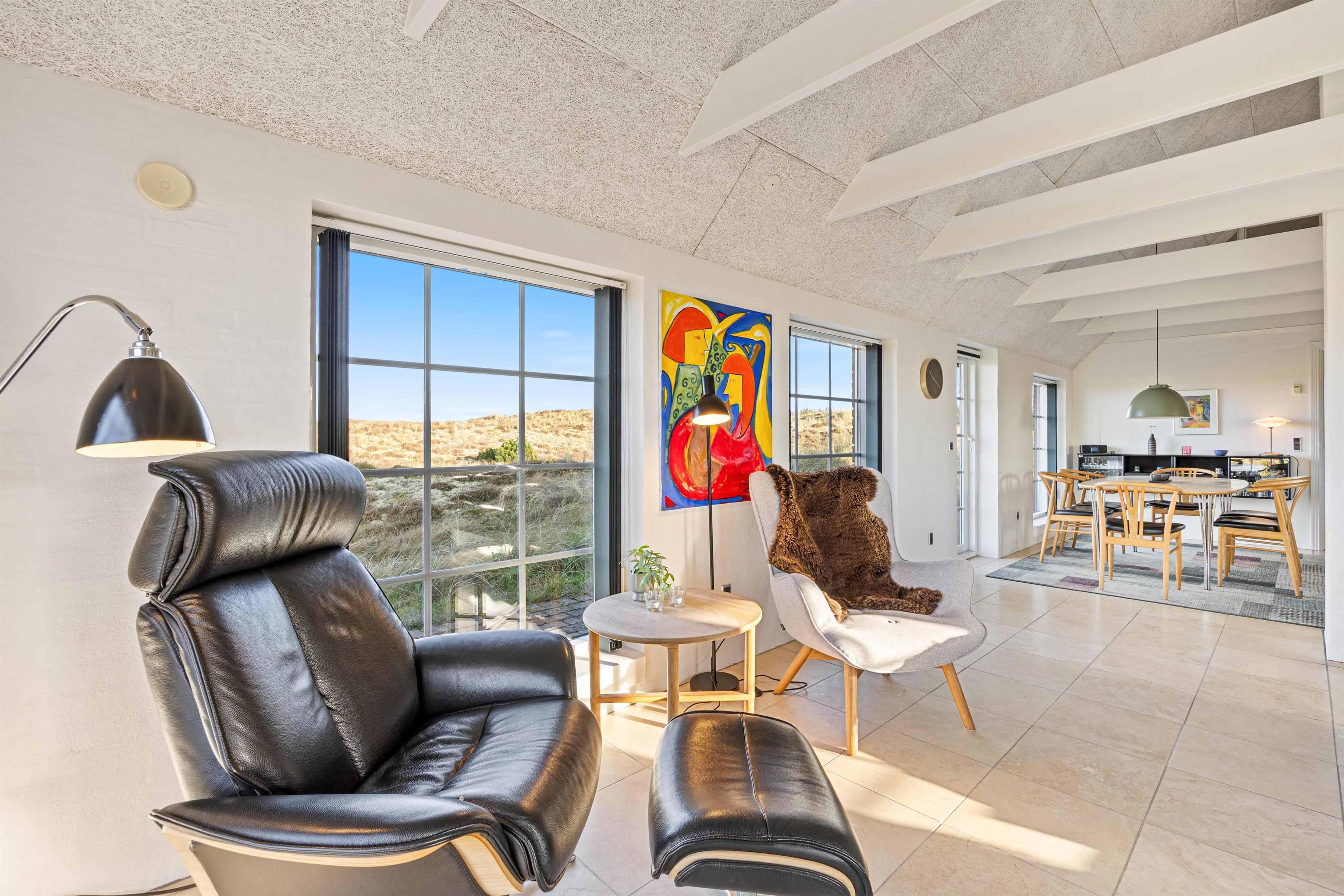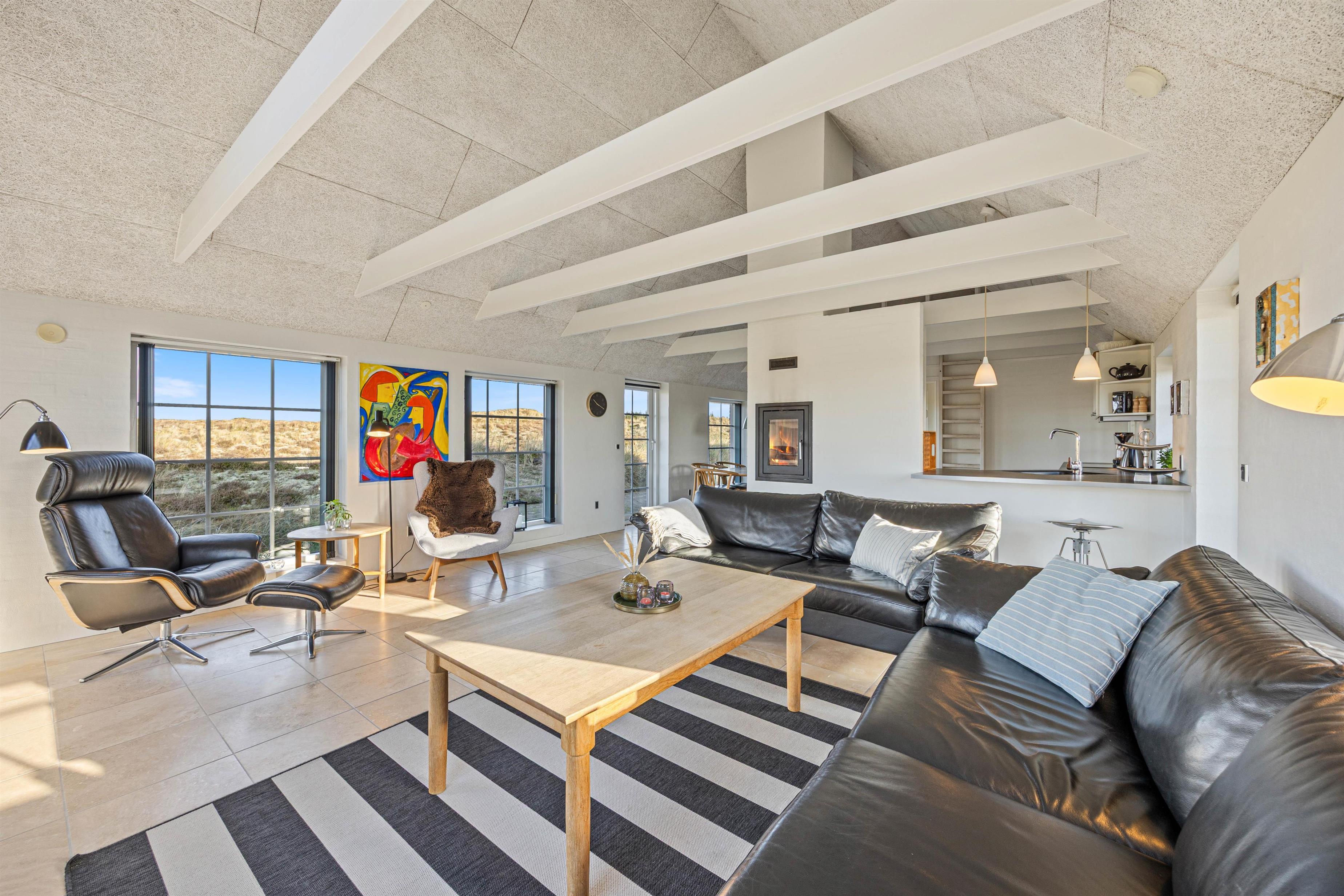Located at Arvidvej 54, this holiday home successfully combines modern amenities with classic thatched roof architecture. The spacious living area forms the heart of this charming holiday home, featuring high ceilings and premium furnishings - a true haven of comfort. Large windows flood the interior with natural light, offering unique panoramic views across the heathland.