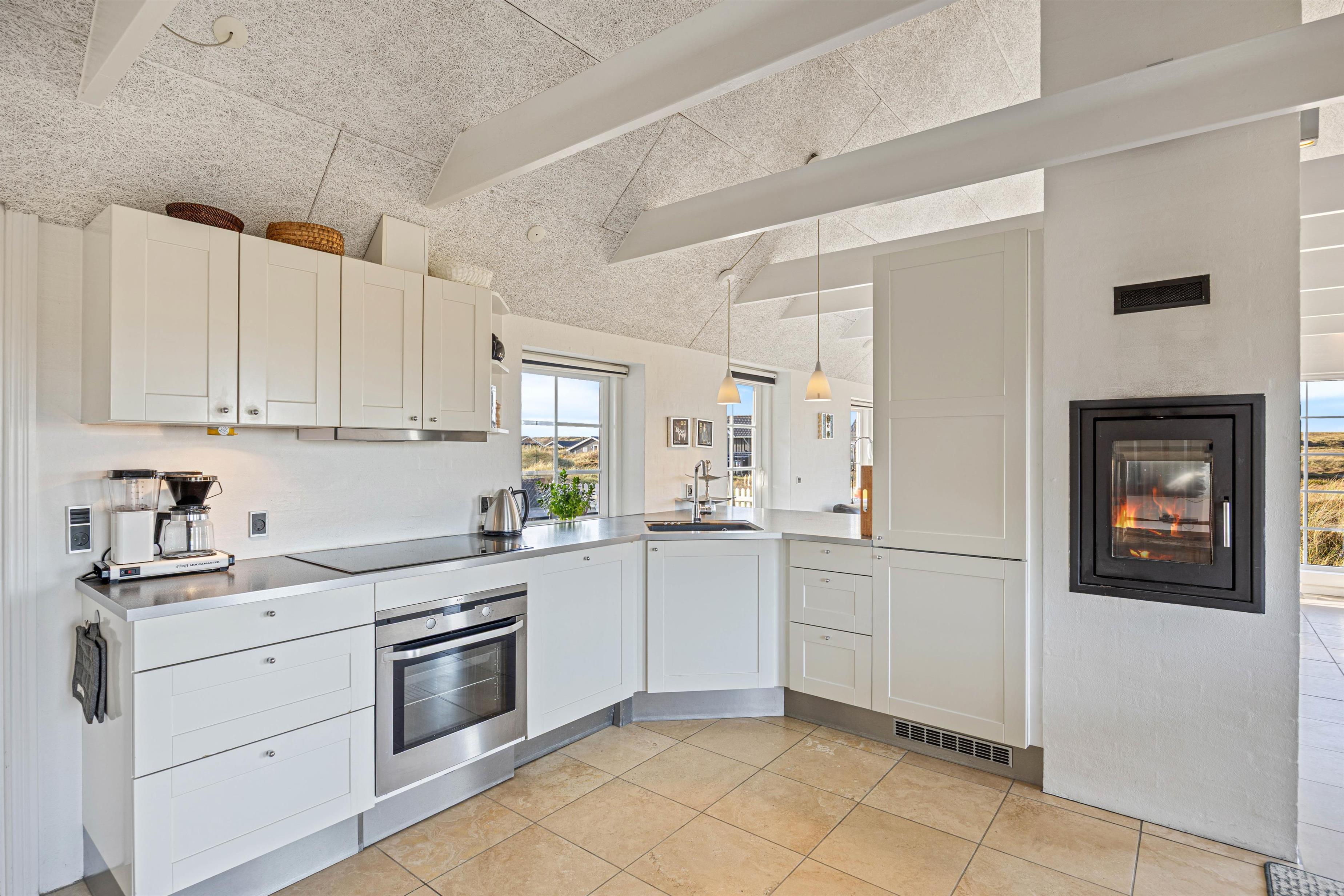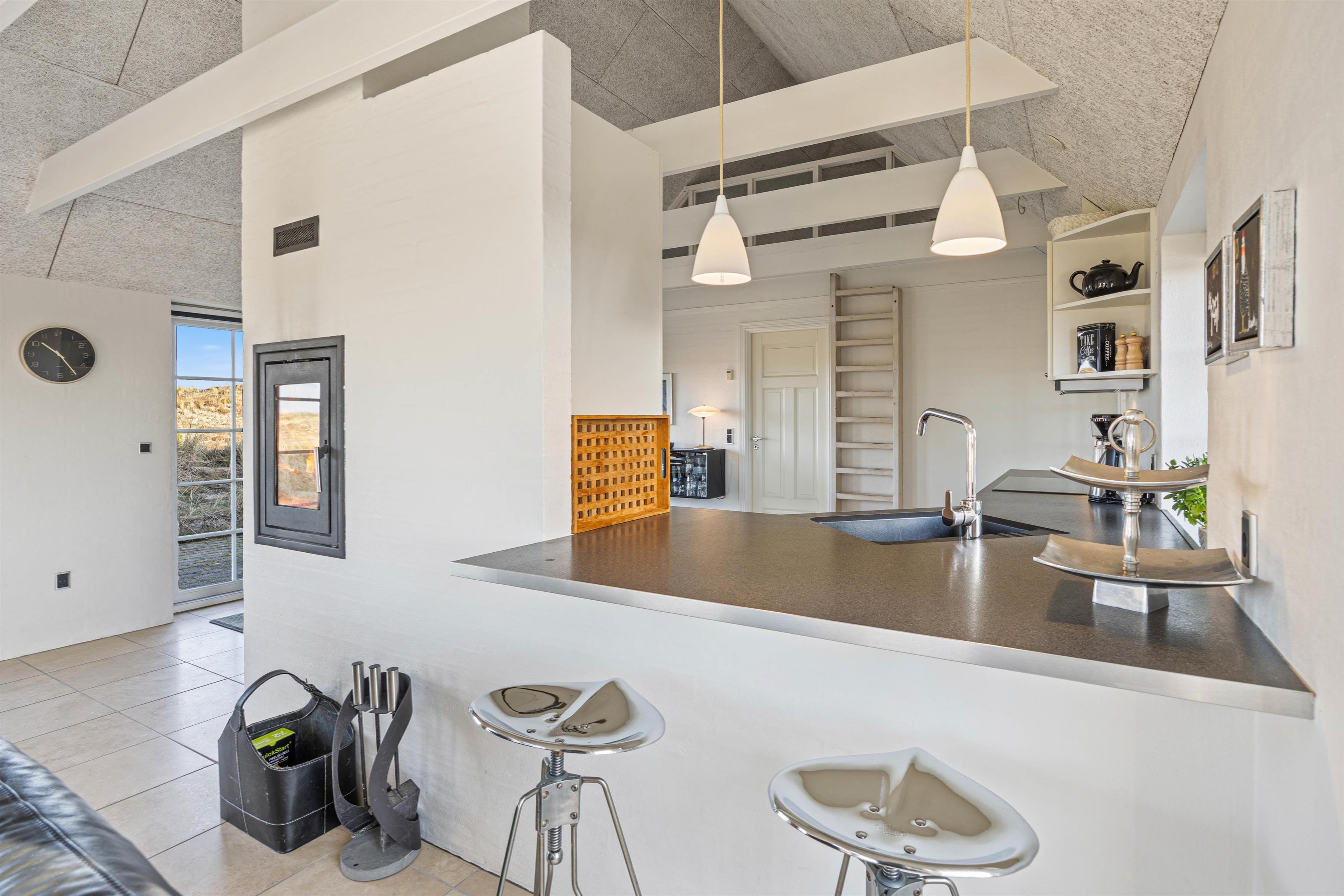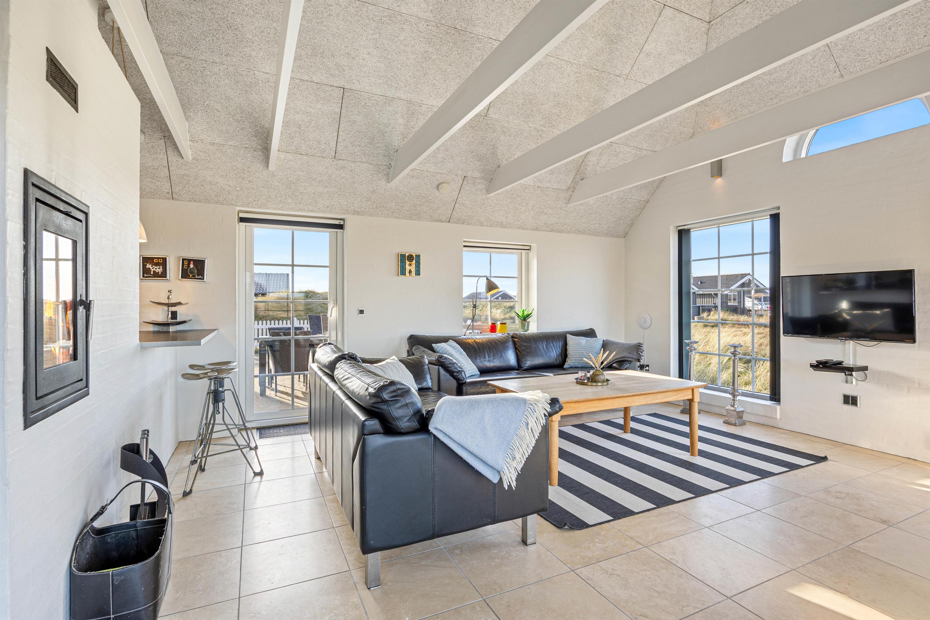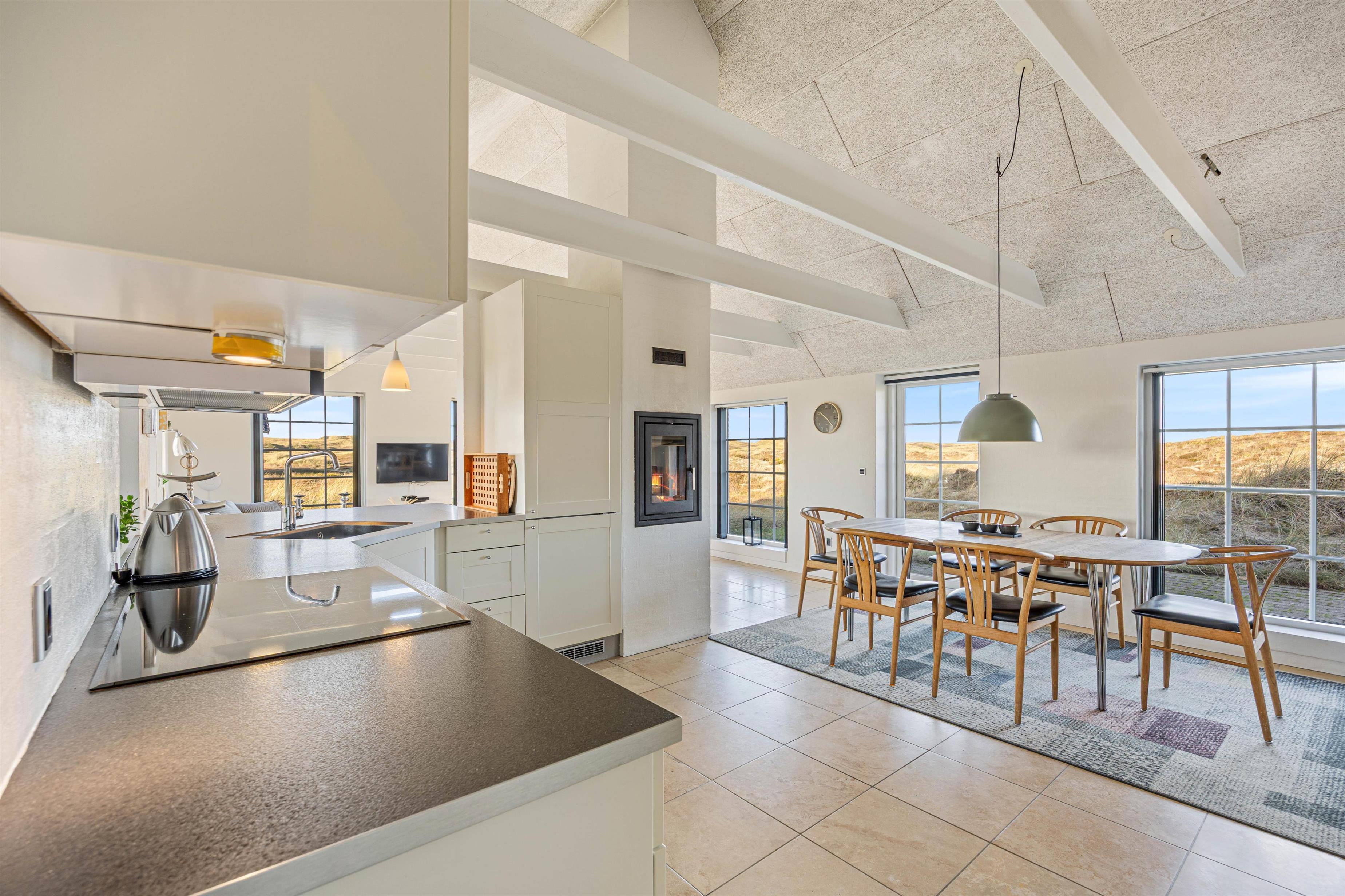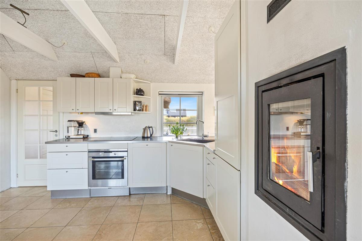 Snuggle up on the sofa and enjoy a glass of wine while the wood-burning stove creates a cosy atmosphere. This fireplace is special, allowing you to view the flames from two sides - both from the sofa and the dining area. Additionally, the entire house features underfloor heating powered by an energy-efficient heat pump. Naturally, you can also watch television or DVDs together in the living area. The TV includes Chromecast, offering plenty of entertainment options.