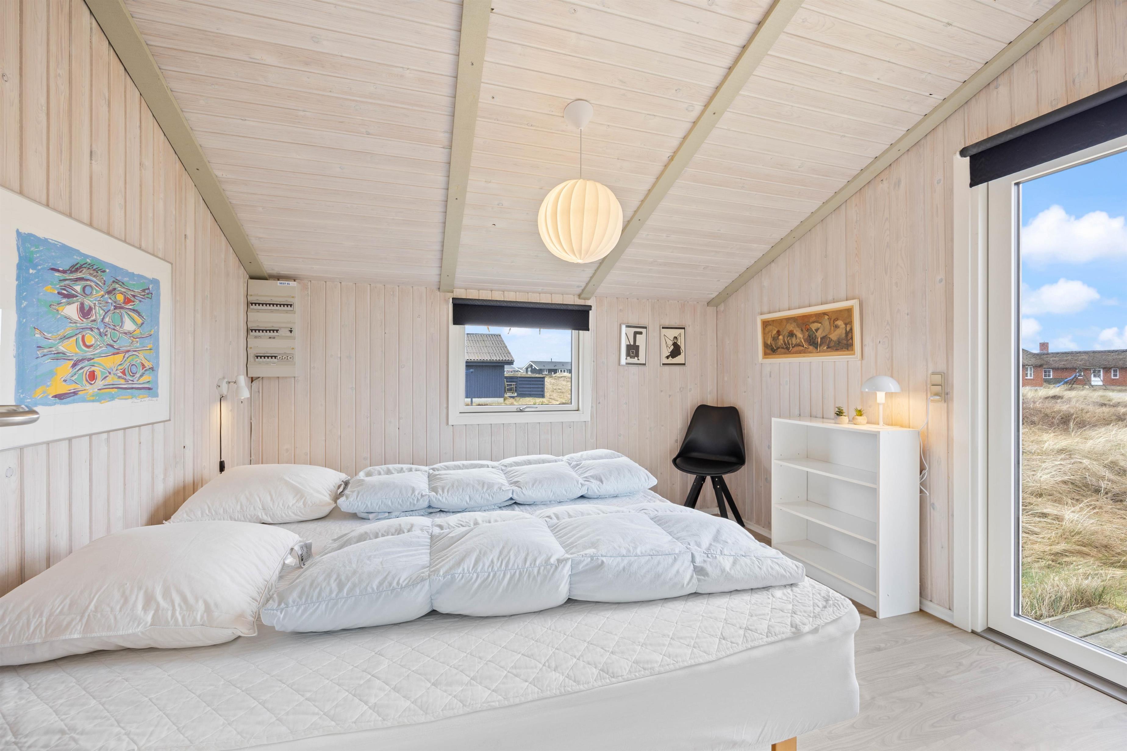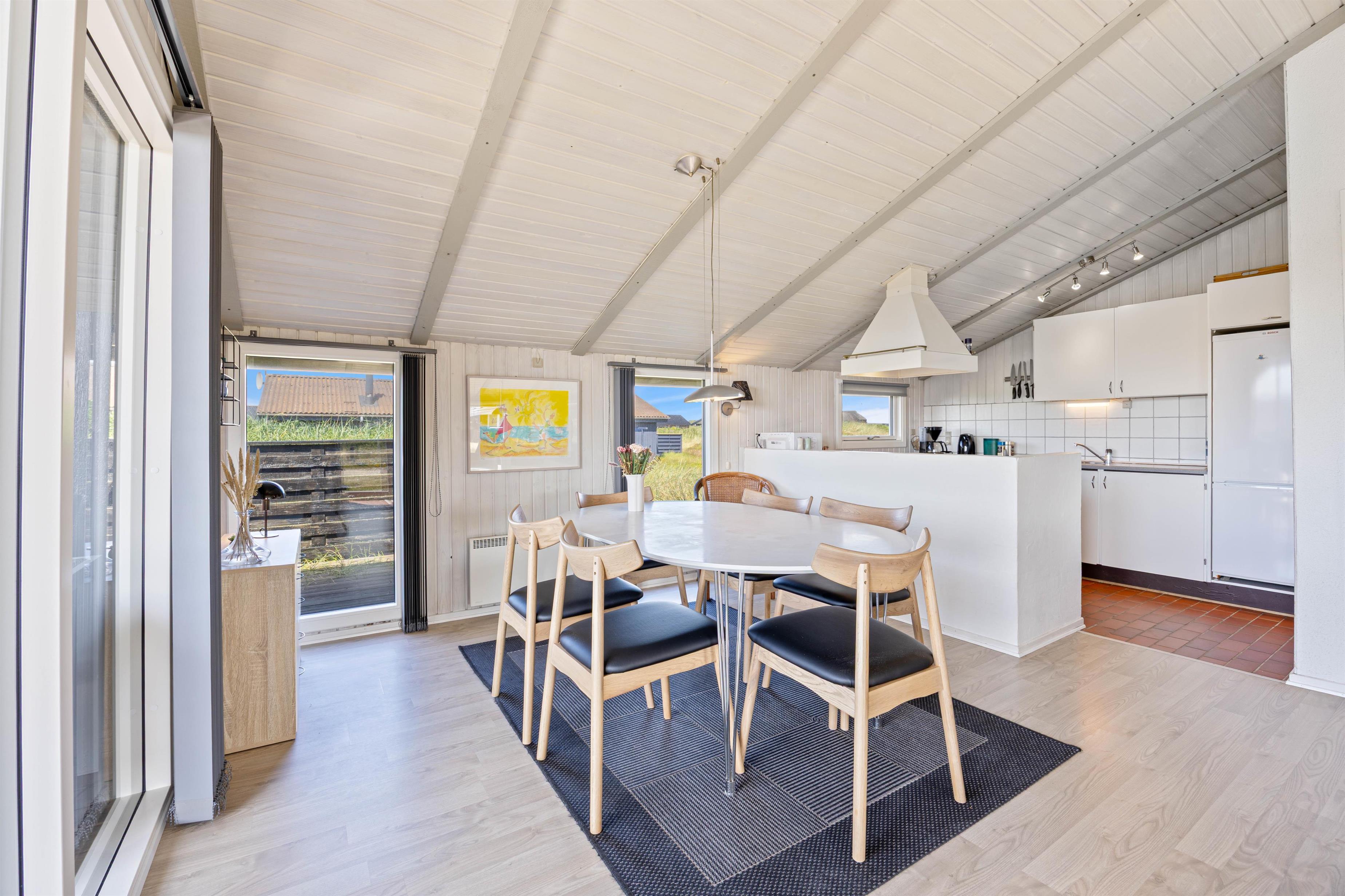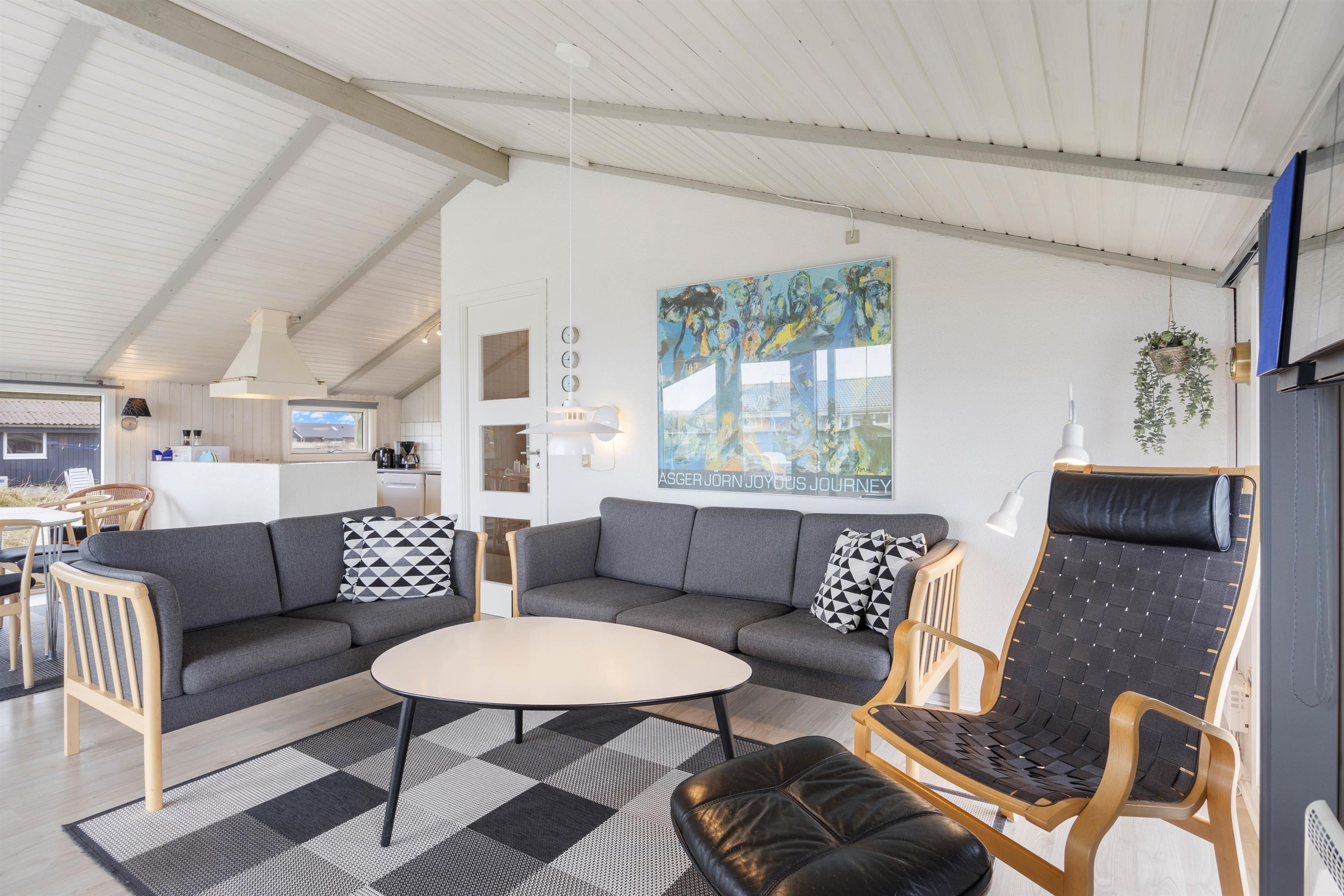 You'll feel at home the moment you enter this classic holiday home. The sloping ceilings and floor-to-ceiling windows in the open-plan living area harmonise beautifully with the owners' thoughtful interior design. Here you can relax in the numerous seating areas, watch television or play board games. The fireplace provides warmth and creates a particularly cosy atmosphere. Following renovation in 2024, you'll now find easy-care laminate flooring in all bedrooms.