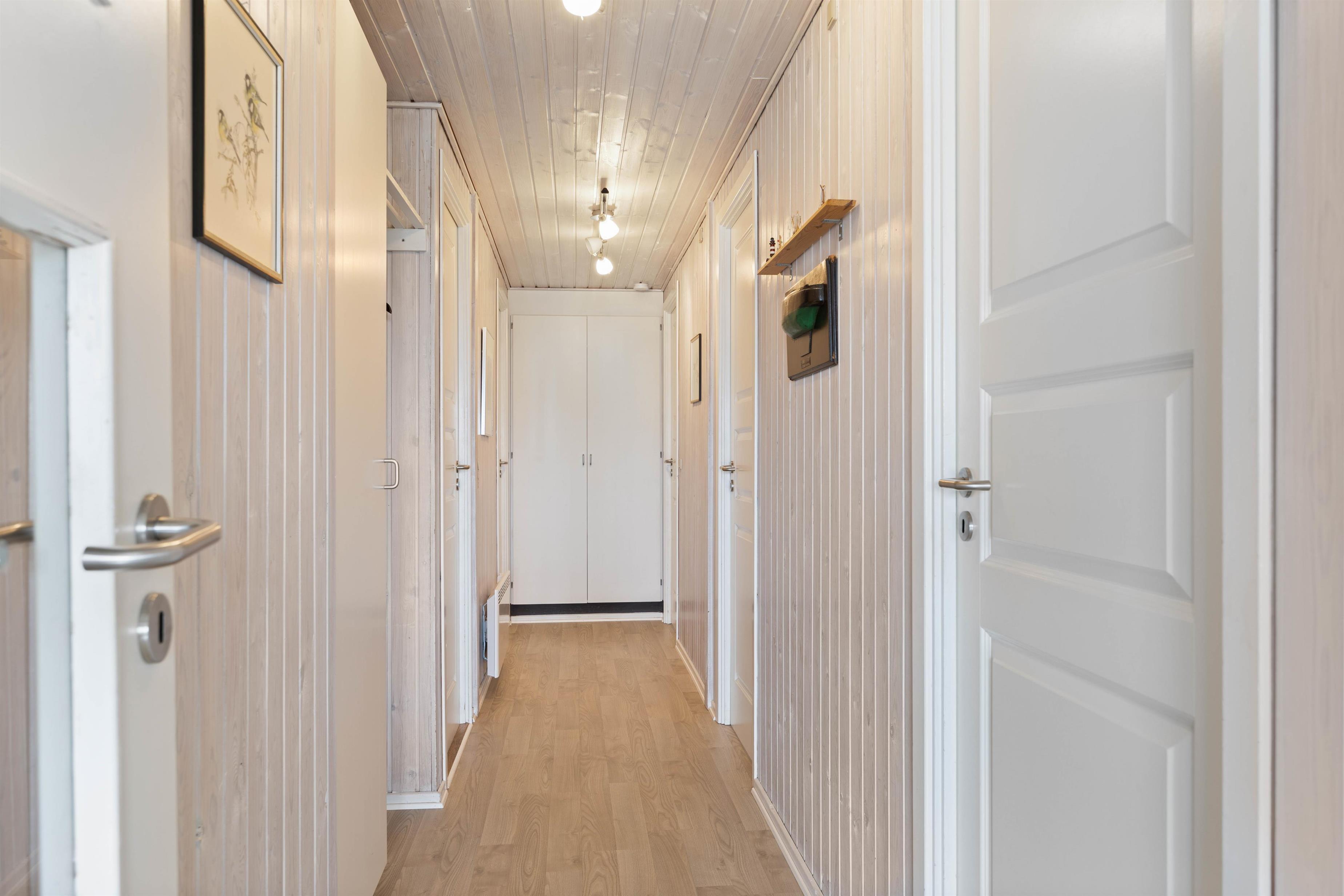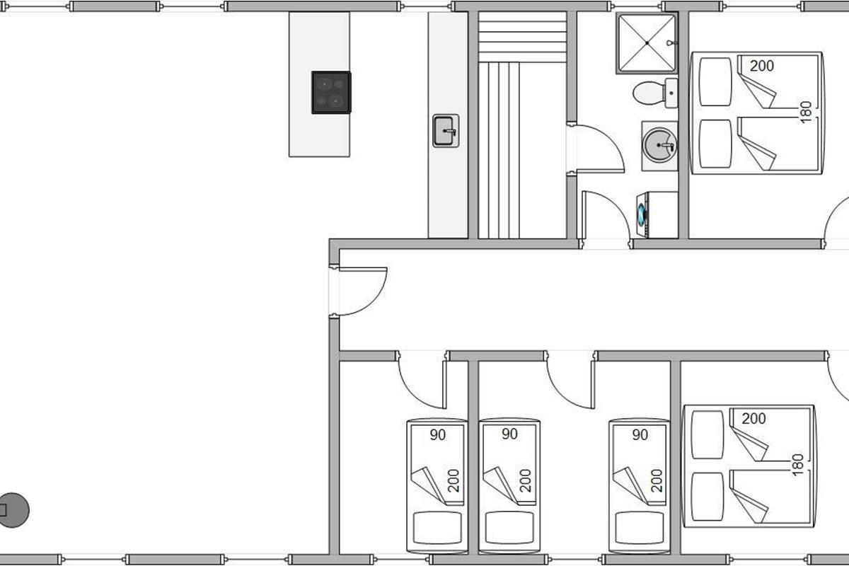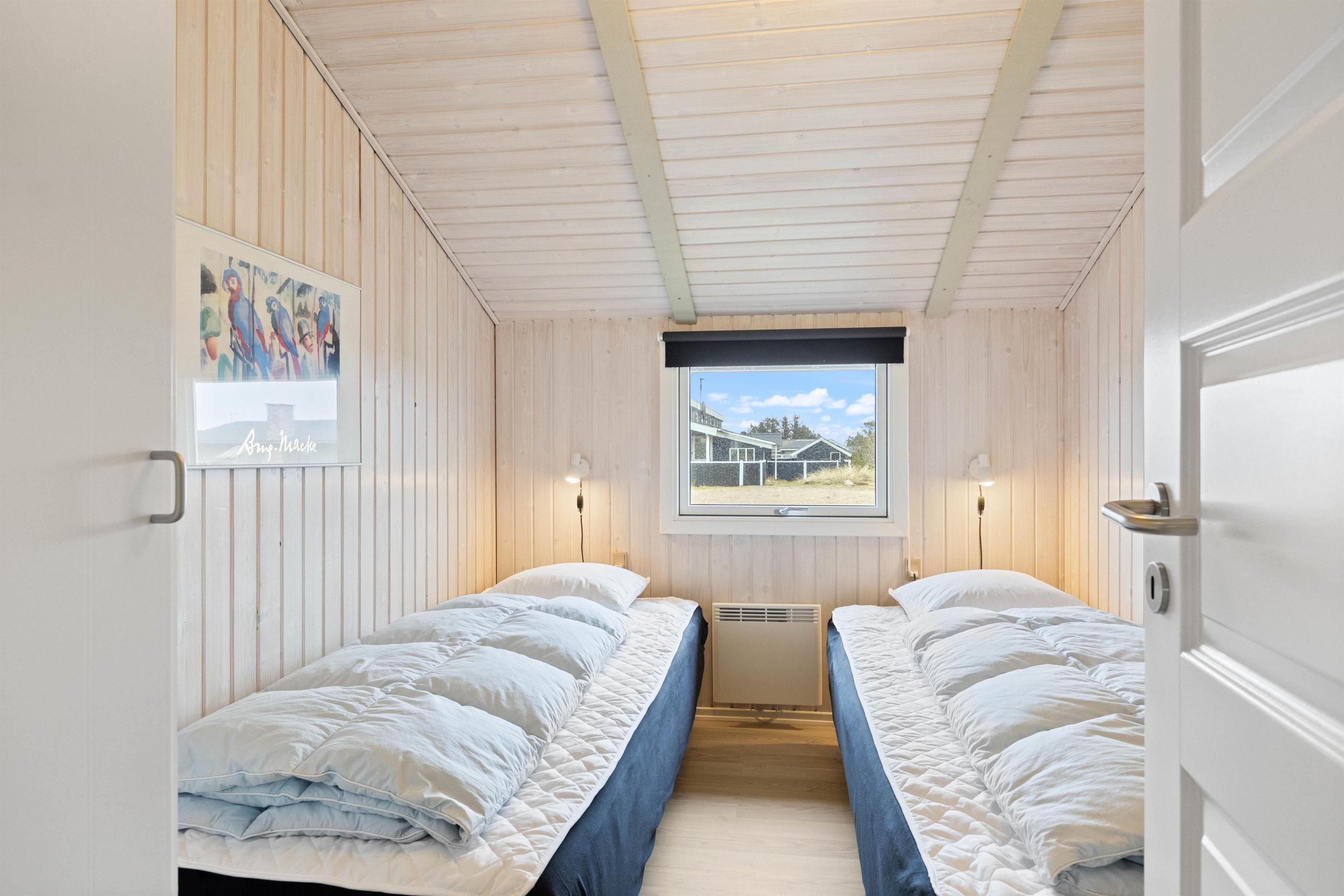 The practical shower room features underfloor heating and a washing machine. Here you'll also find access to the sauna, perfect for extended sauna sessions. Such relaxation ensures a good night's sleep. Four bedrooms with two double beds and three single beds are available for a restful night. Two of the bedrooms have terrace doors, allowing you to enjoy the fresh sea air first thing in the morning.