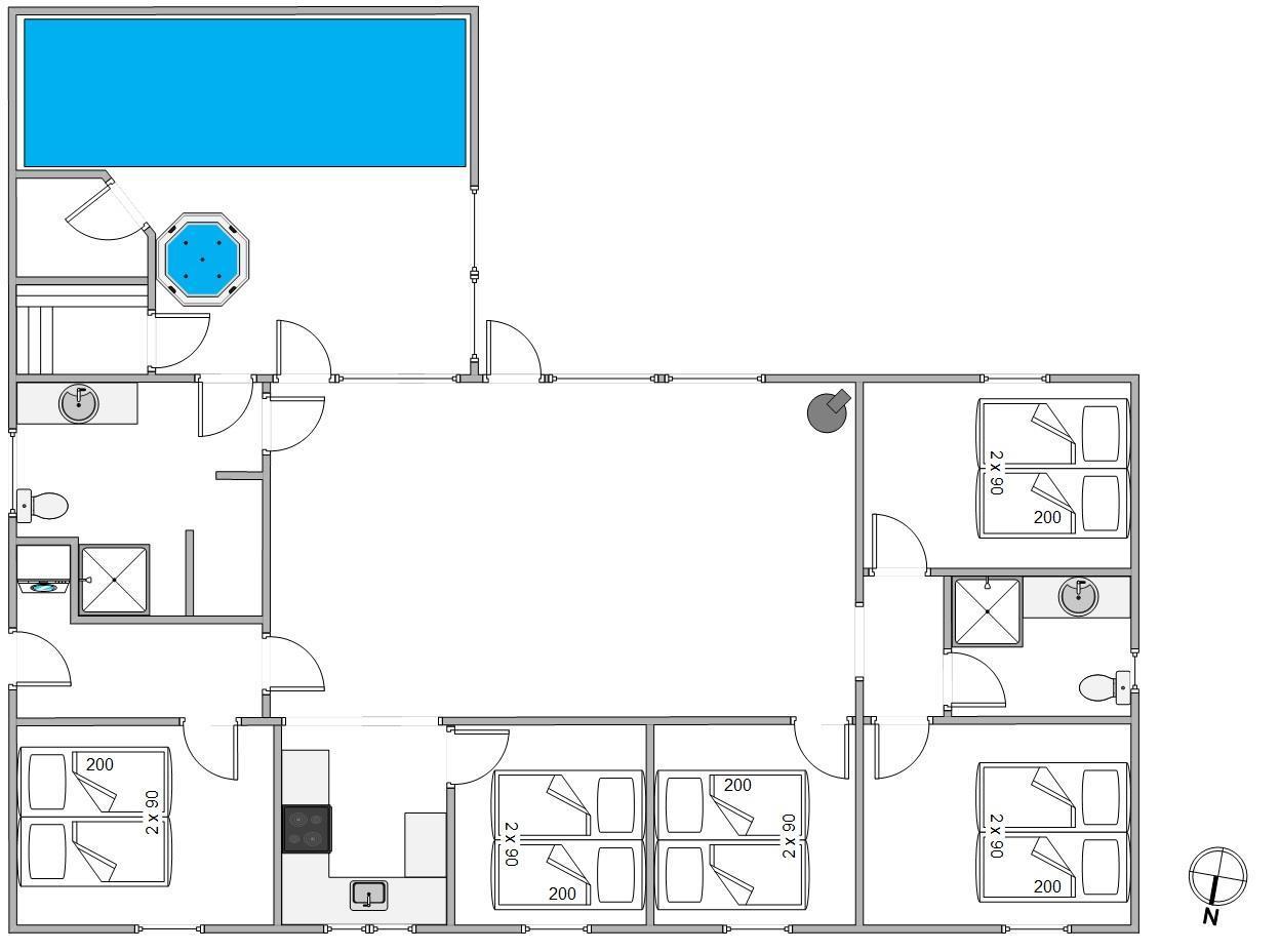 This L-shaped house sits on a natural plot and is ideal for families with children and dogs, or for friends' families wanting to holiday together. The swimming pool and hot tub are the heart of the house - you can enjoy swimming even on rainy days or relax in the hot tub. The five bedrooms each feature a double bed, and the two shower rooms are practically and brightly designed.