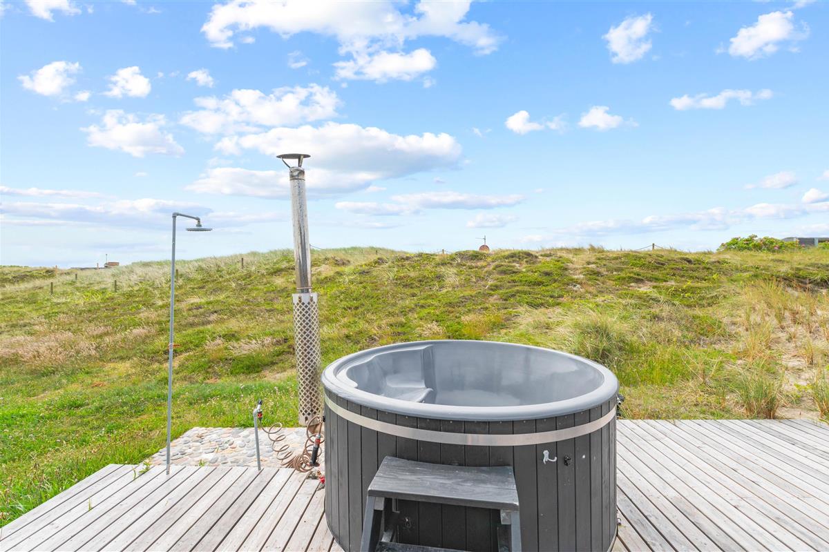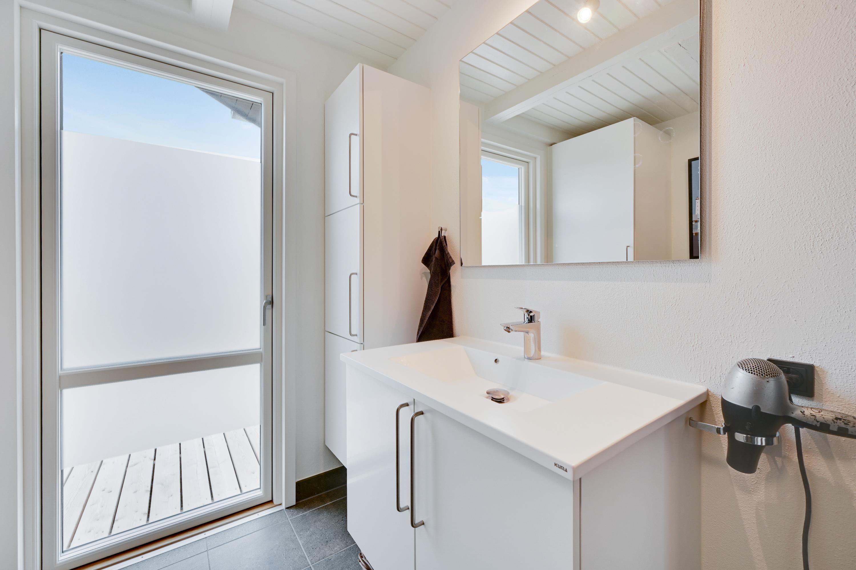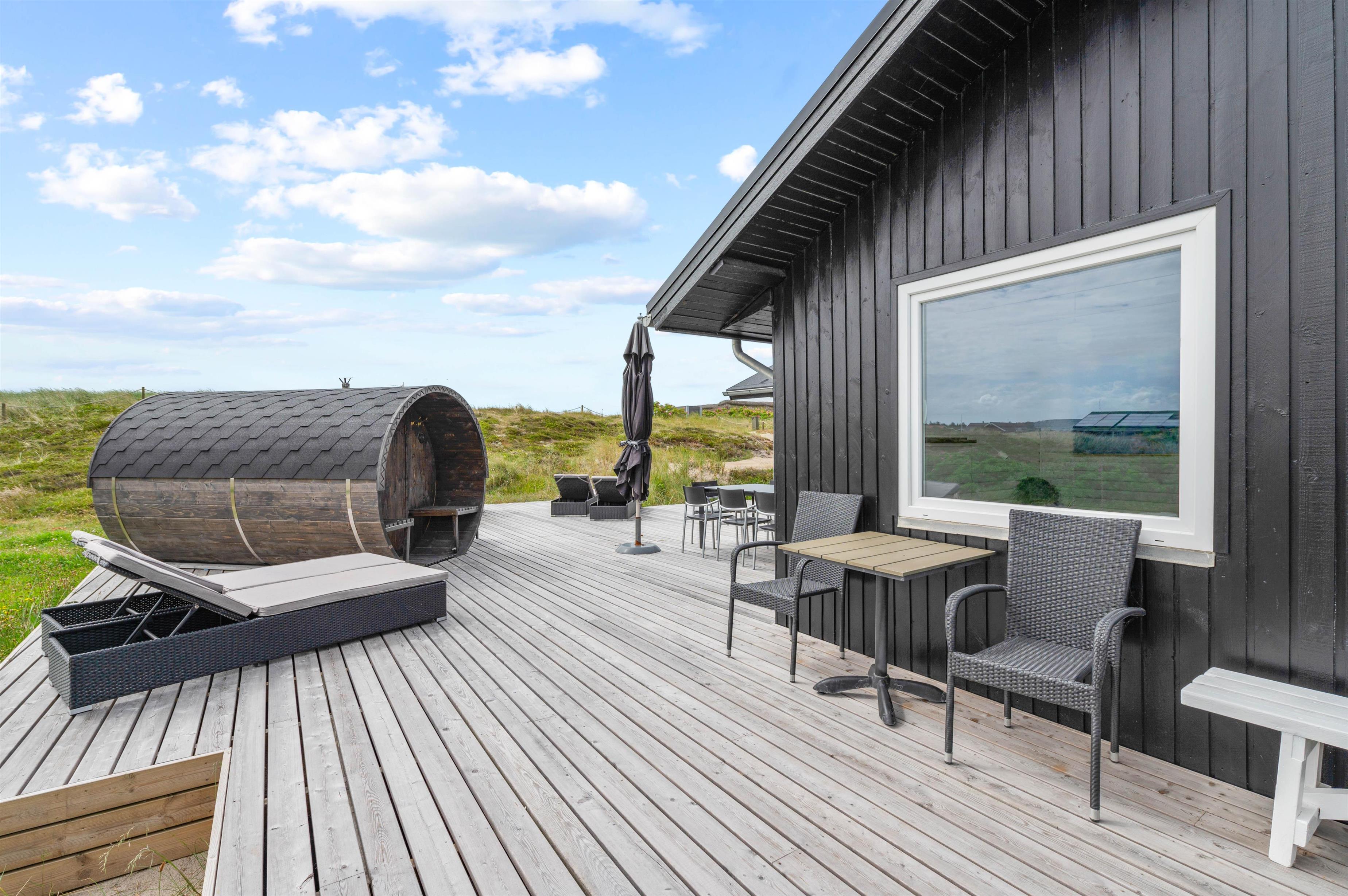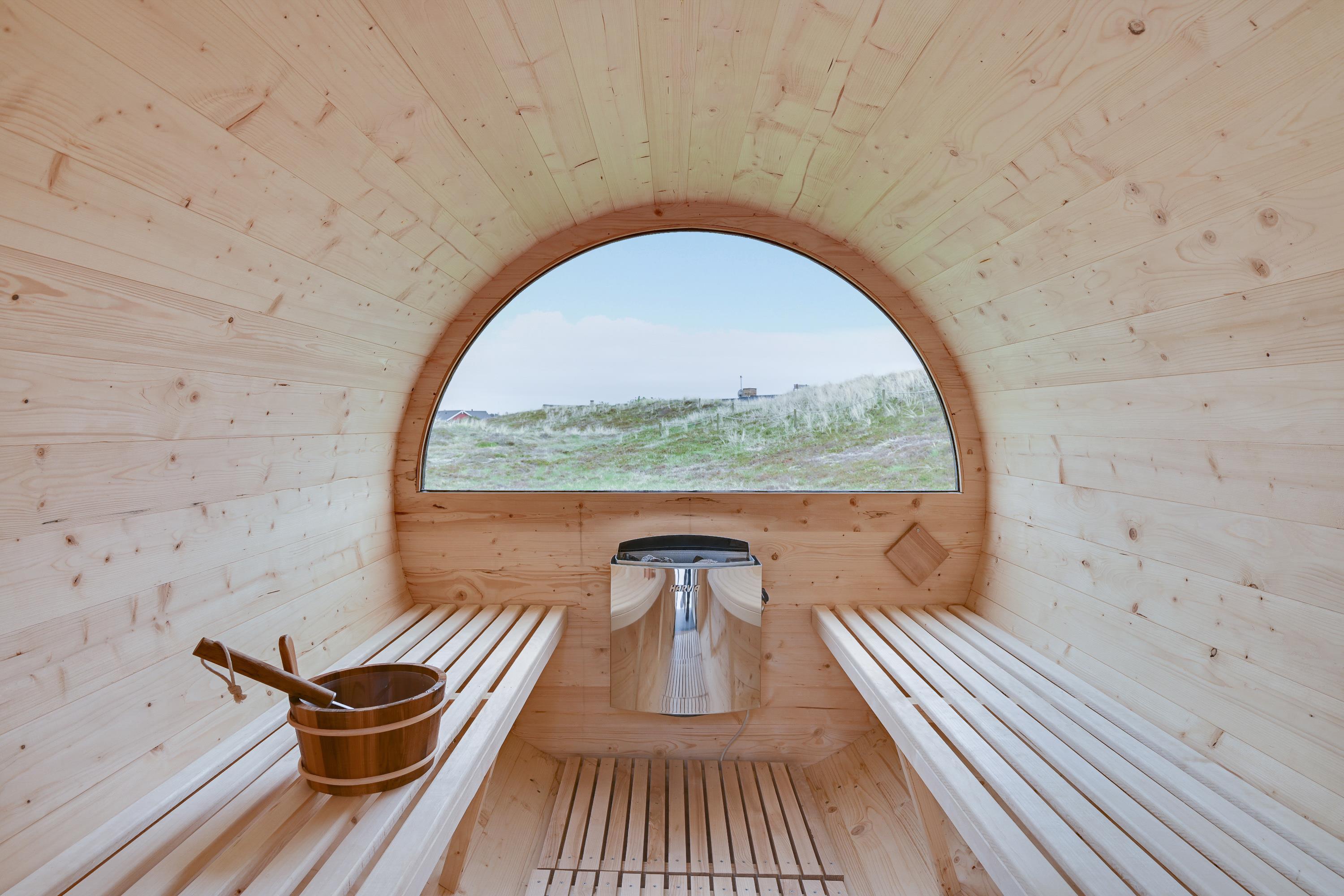From the bathroom, which features underfloor heating, you have direct access to the outdoor area where you'll find both an outdoor sauna and hot tub. Here you can warm up after a long walk on a blustery autumn day and truly unwind. For cooling off, the holiday home's outdoor shower is available from April to November.