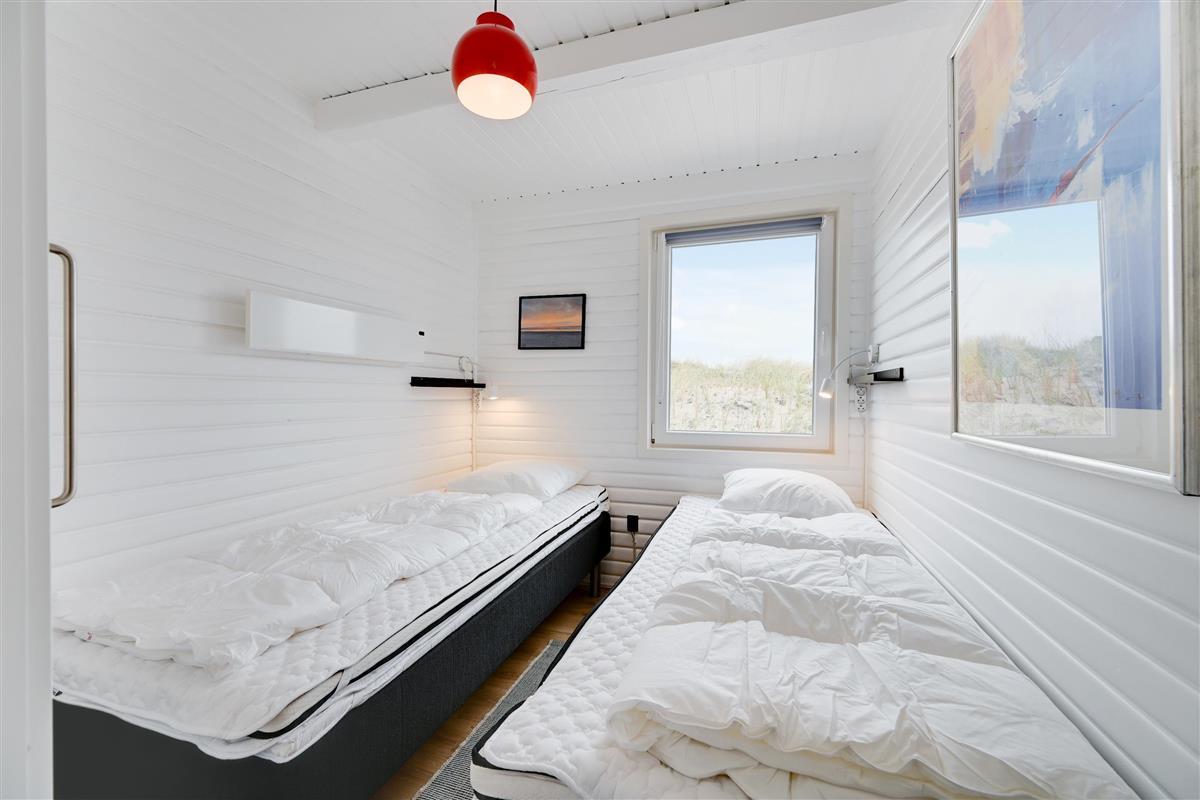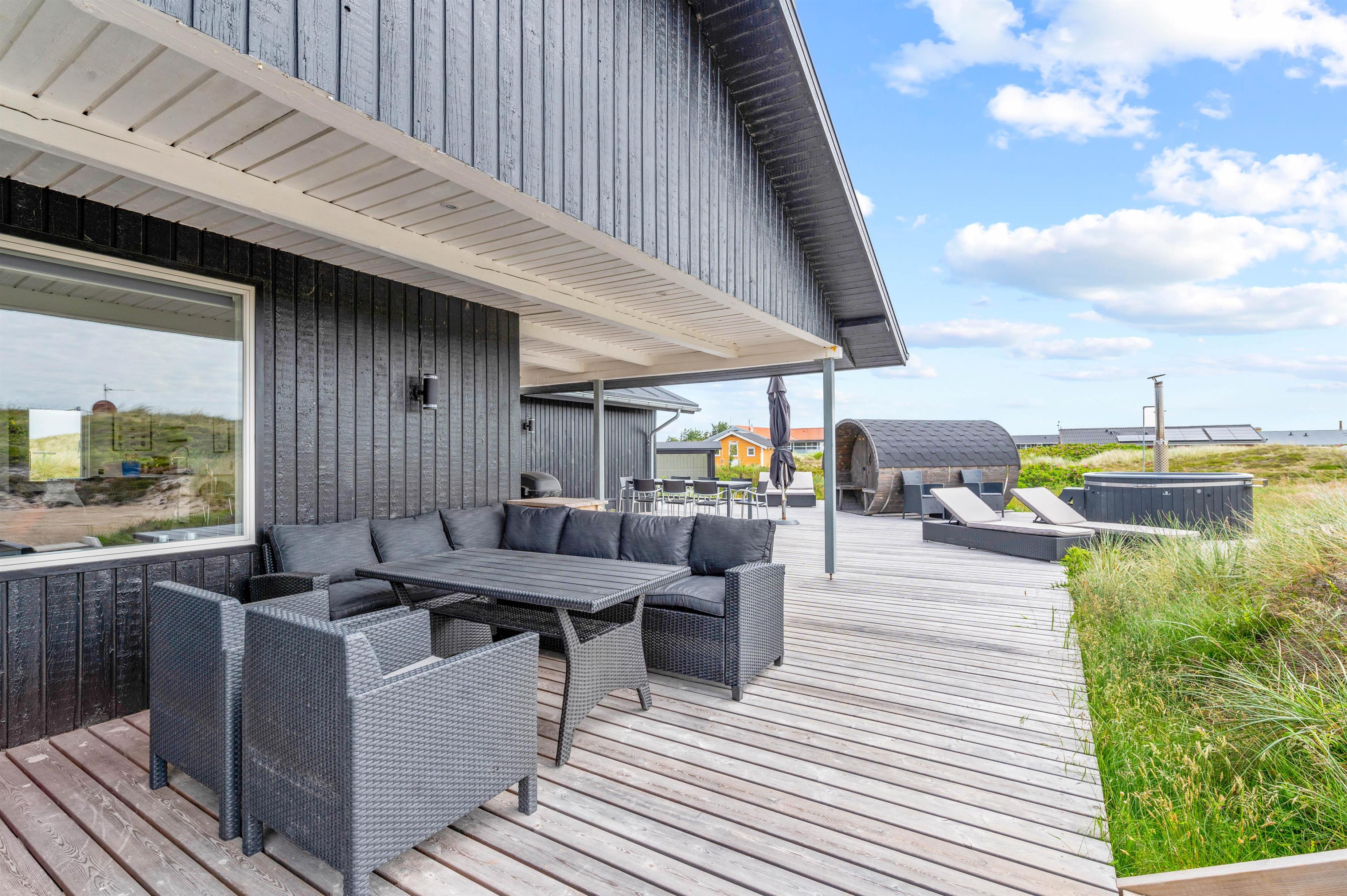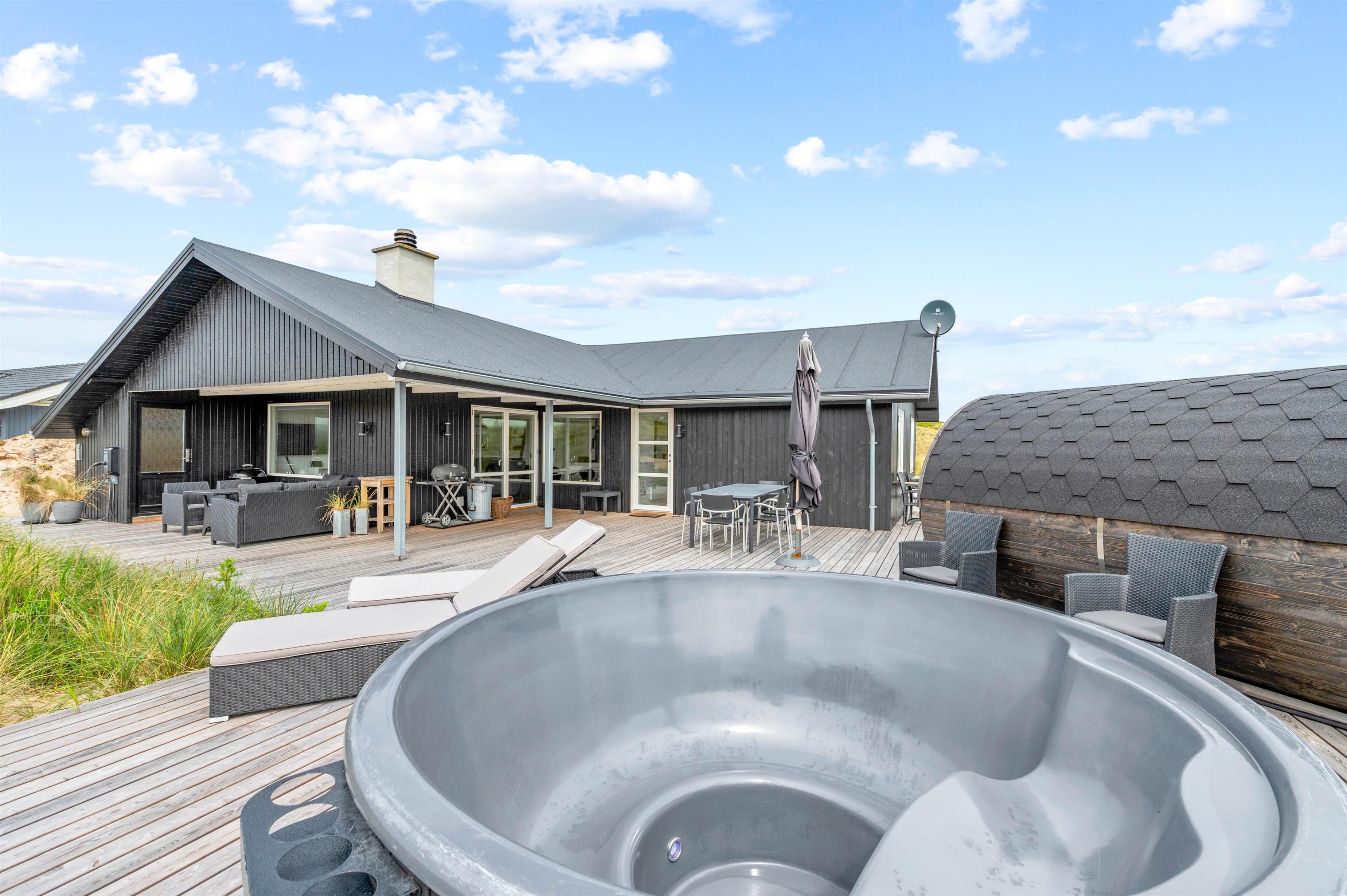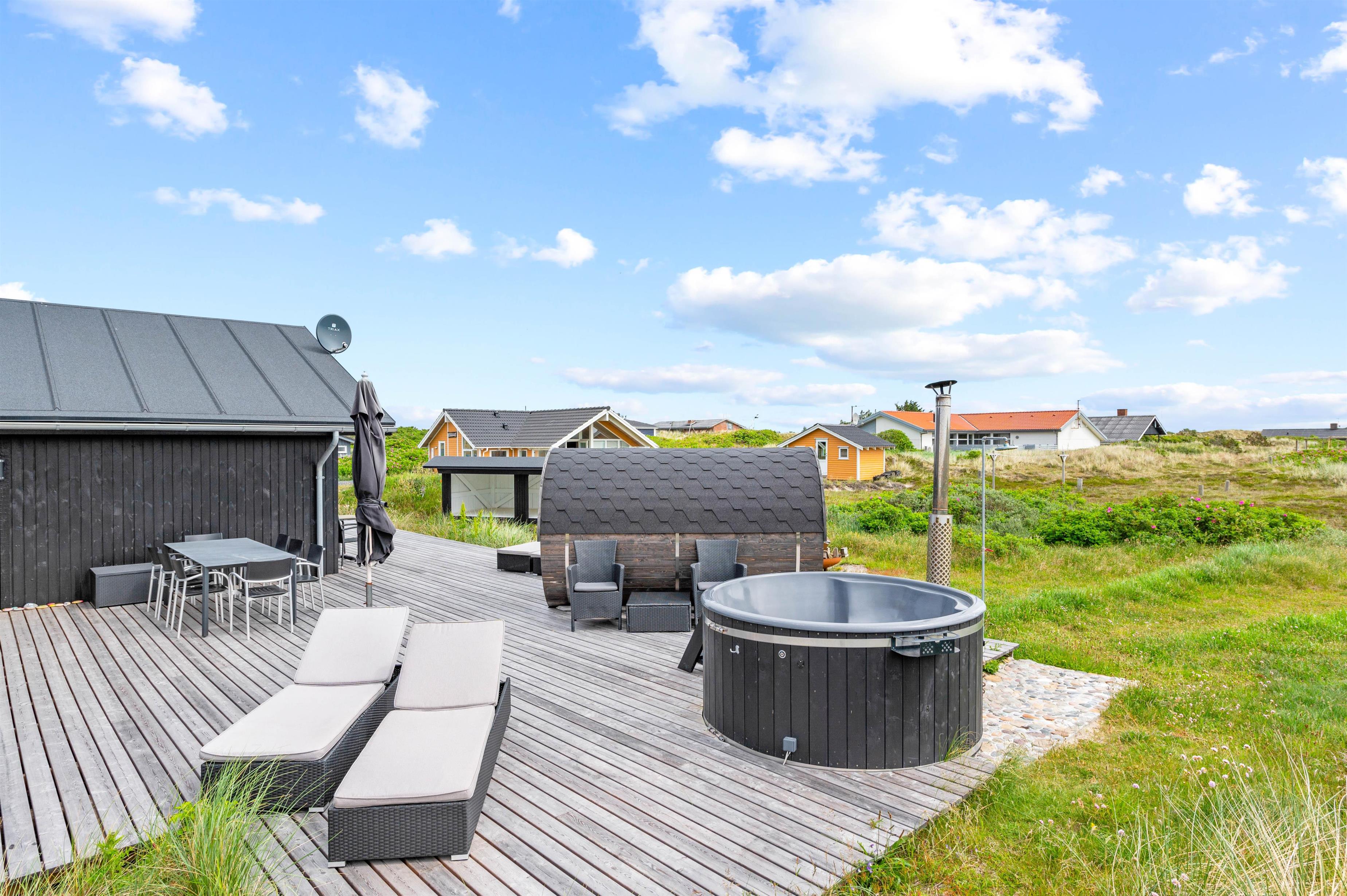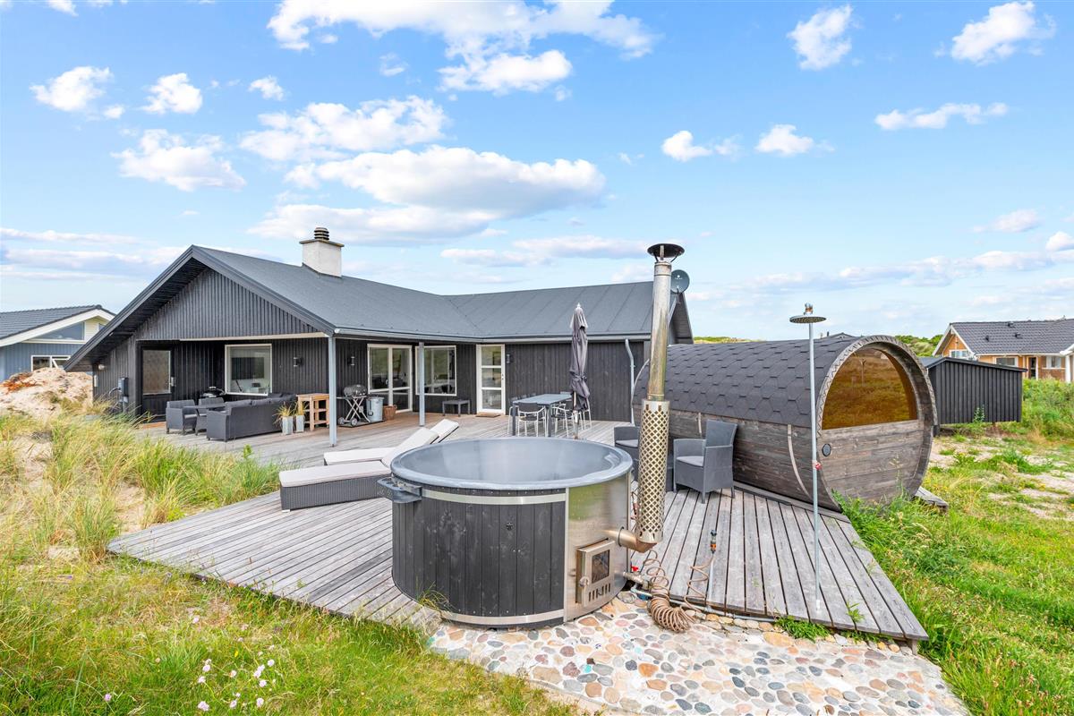 From the bathroom, which features underfloor heating, you have direct access to the outdoor area where you'll find both an outdoor sauna and hot tub. Here you can warm up after a long walk on a blustery autumn day and truly unwind. For cooling off, the holiday home's outdoor shower is available from April to November.