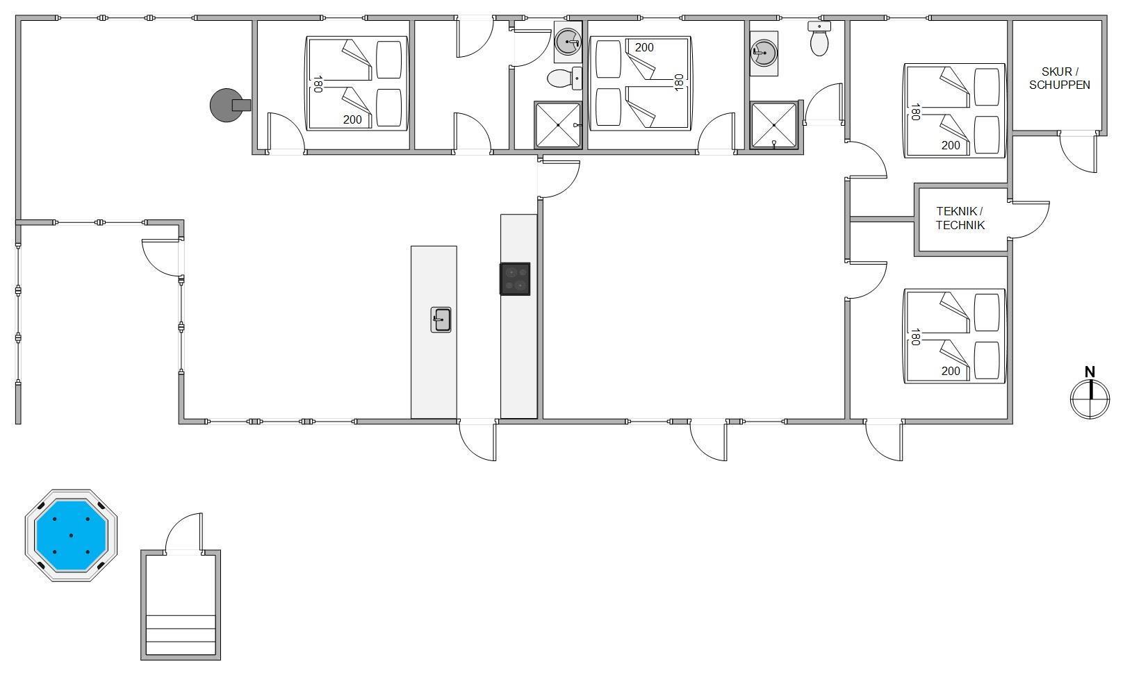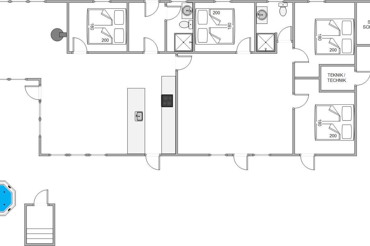 The spacious kitchen with adjoining dining area features high-quality equipment. This modern kitchen includes a dishwasher, fridge and induction hob. Anglers will particularly appreciate the generous 160-litre freezer capacity. The entire holiday home benefits from underfloor heating powered by an energy-efficient heat pump.