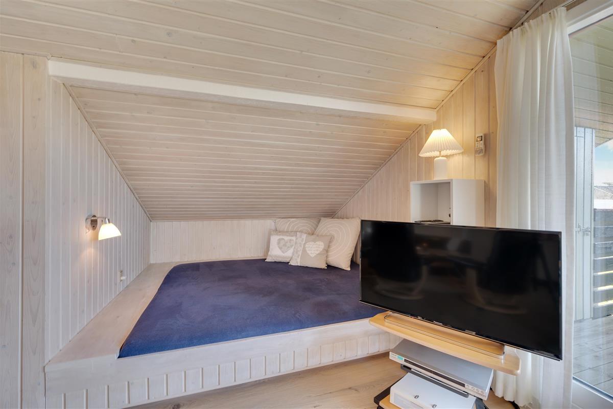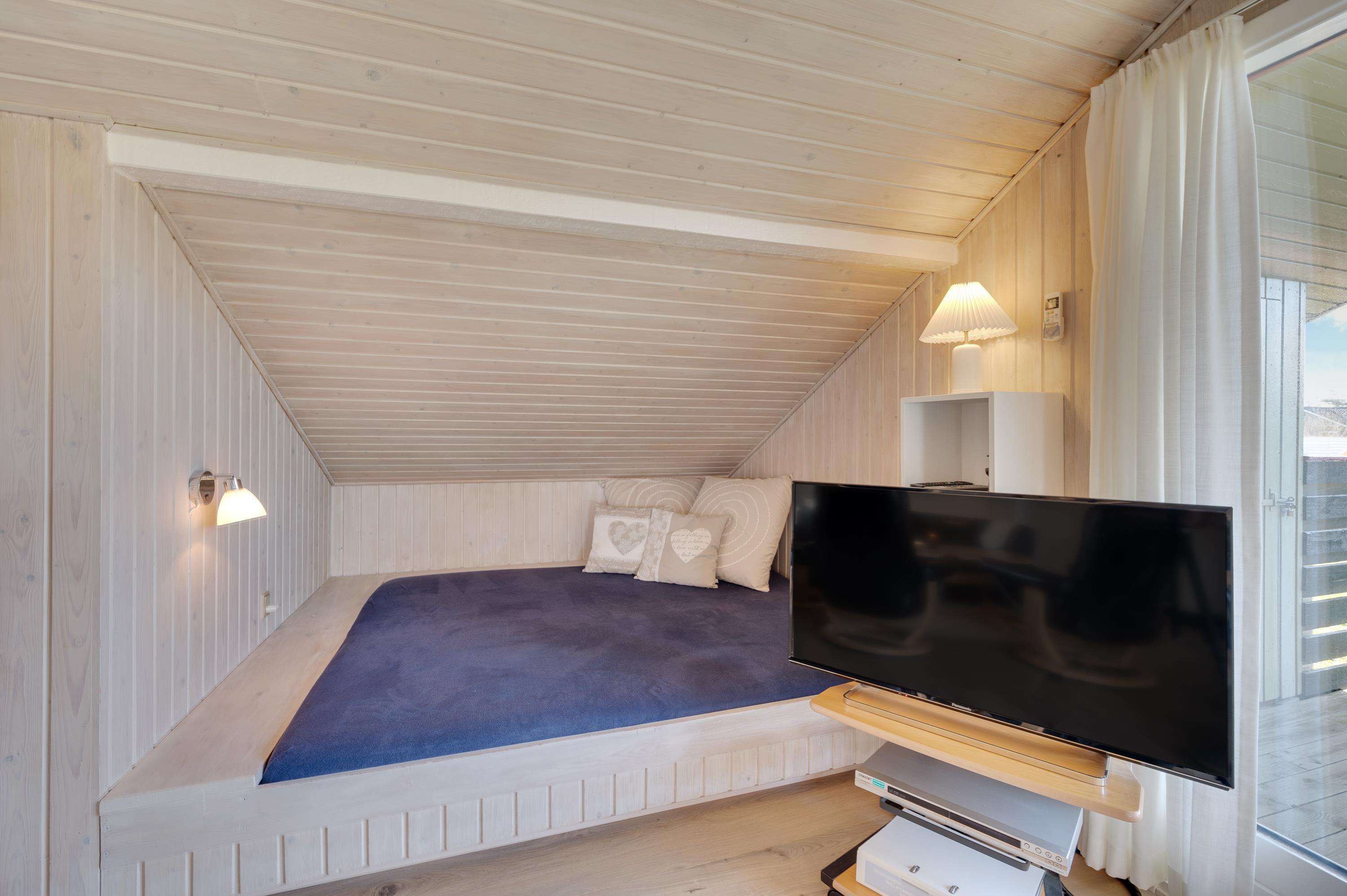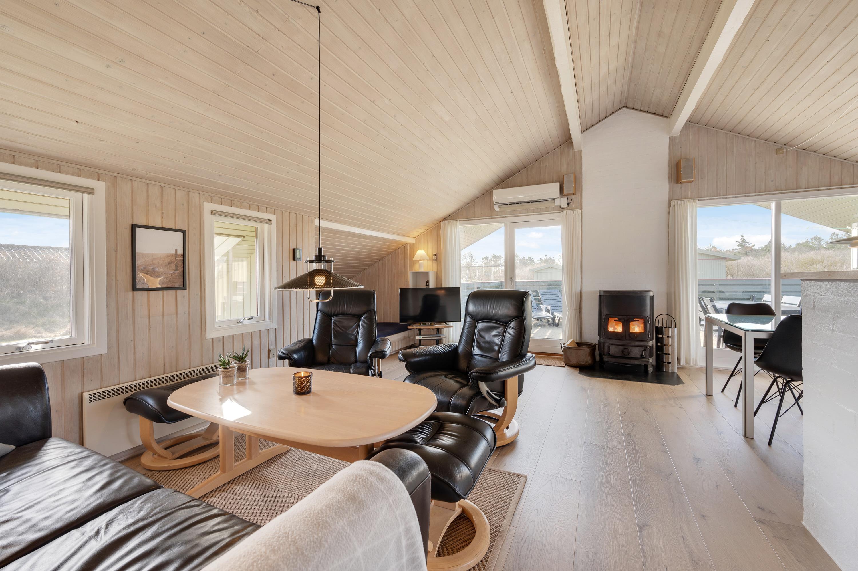 The living room features wood laminate flooring, a warming wood-burning stove, comfortable furniture, a flat-screen TV and a cosy reading nook. The reading nook is perfect for settling down with a good book. The holiday home is equipped with free Wi-Fi and a heat pump, ensuring low energy consumption while maintaining a comfortable temperature throughout the living area.