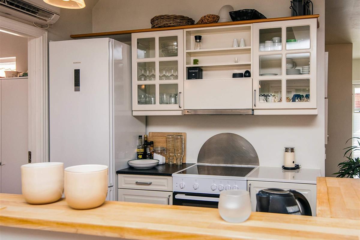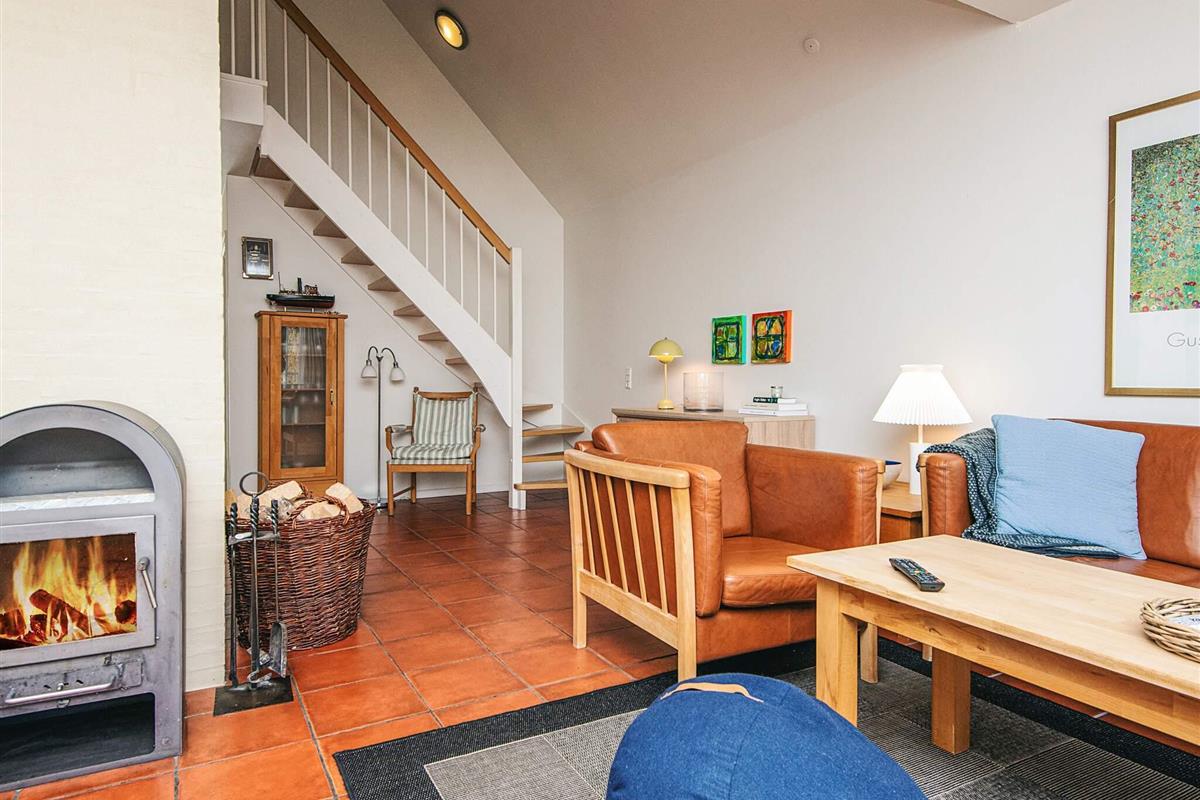 Gut ausgestattetes Ferienhaus in typisch schwedischem Baustil, zentral gelegen im Gebiet Horns Bjerge bei Blåvand. Bietet zwei Wohnebenen. Unten Wohnzimmer mit gemütlichem Holzofen sowie hoher Decke für guten Lichteinfall und helle Wohnatmosphäre. Zudem u.a. praktische Waschküche mit Trockner und Waschmaschine unten.
