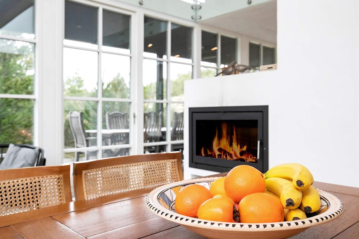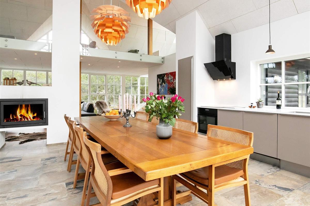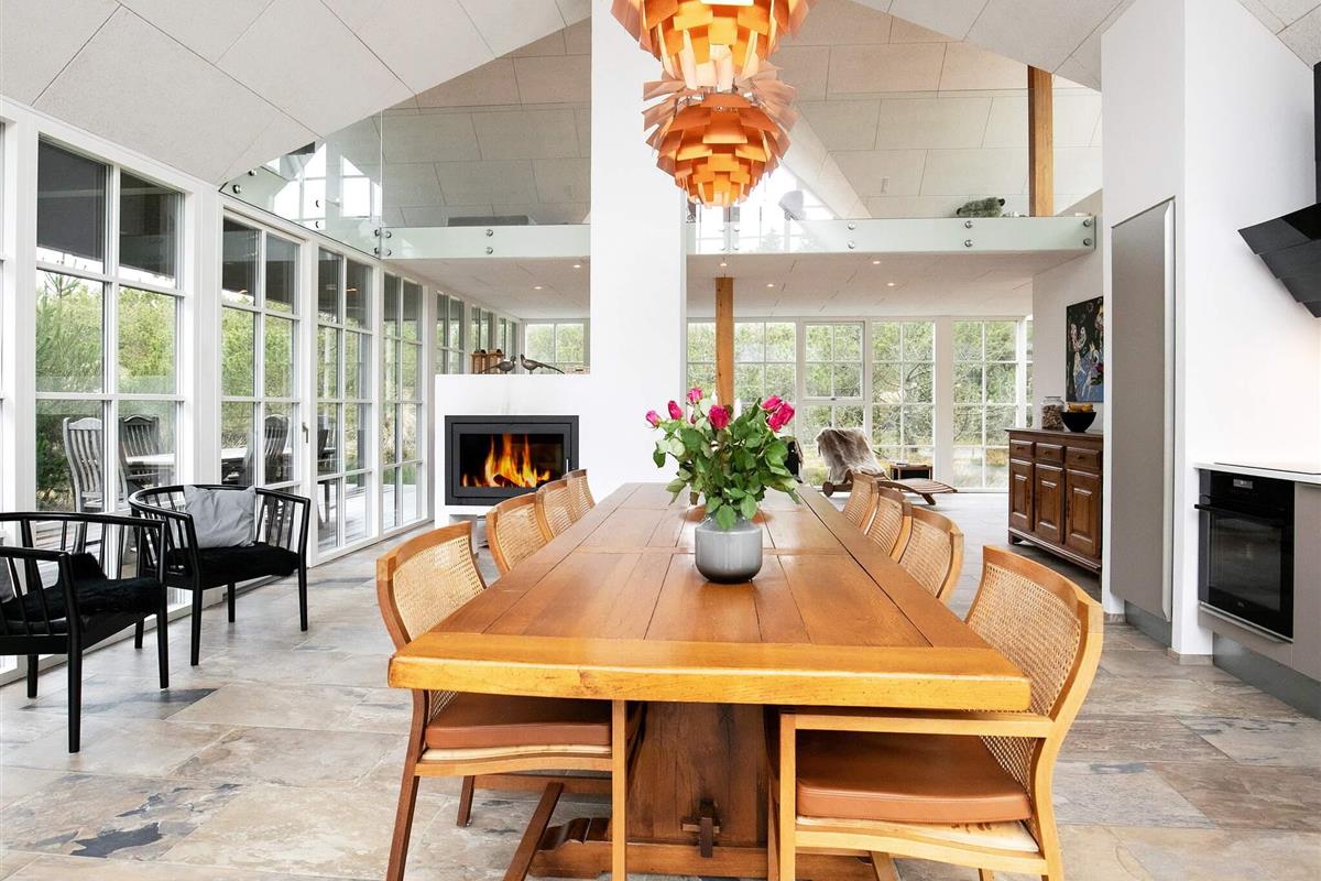 Ein besonderes Highlight ist die beeindruckende Küche mit ihrer integralen Verbindung zum Außenbereich. Das Haus ist mit wunderschönen Naturfliesen ausgestattet, die ein harmonisches Ganzes bilden. Im Erdgeschoss teilen sich der Ess- und der Sitzbereich einen eleganten Kamin, der von beiden Bereichen aus sichtbar ist. Auch die Treppe hinauf in die erste Etage wirkt elegant und stilvoll. Oben genießt man vom Fernsehzimmer aus eine wunderbare Aussicht!